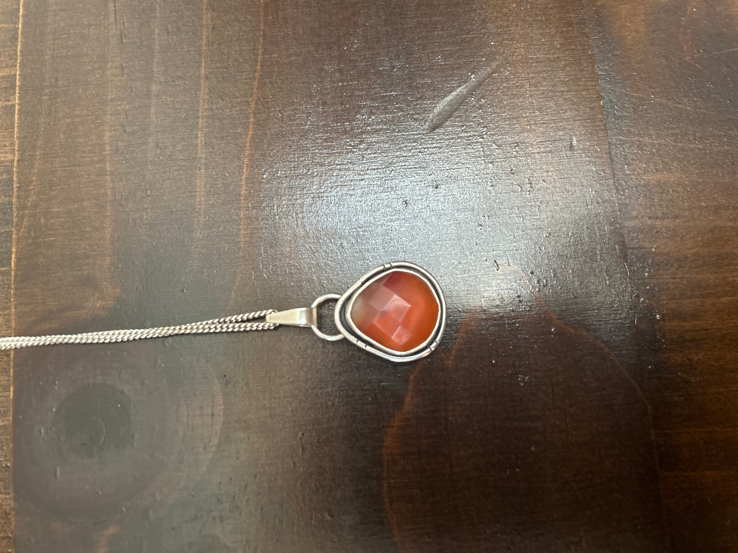 The Carnelian Heartland Pendant is a hand chisel notched, .925 Sterling Silver - rustic and boho pendant -- perfect for these gorgeous, rose cut, faceted and gorgeous Orange Carnelian cabochons. Chunky and powerful Orange Carnelian Pendant!
