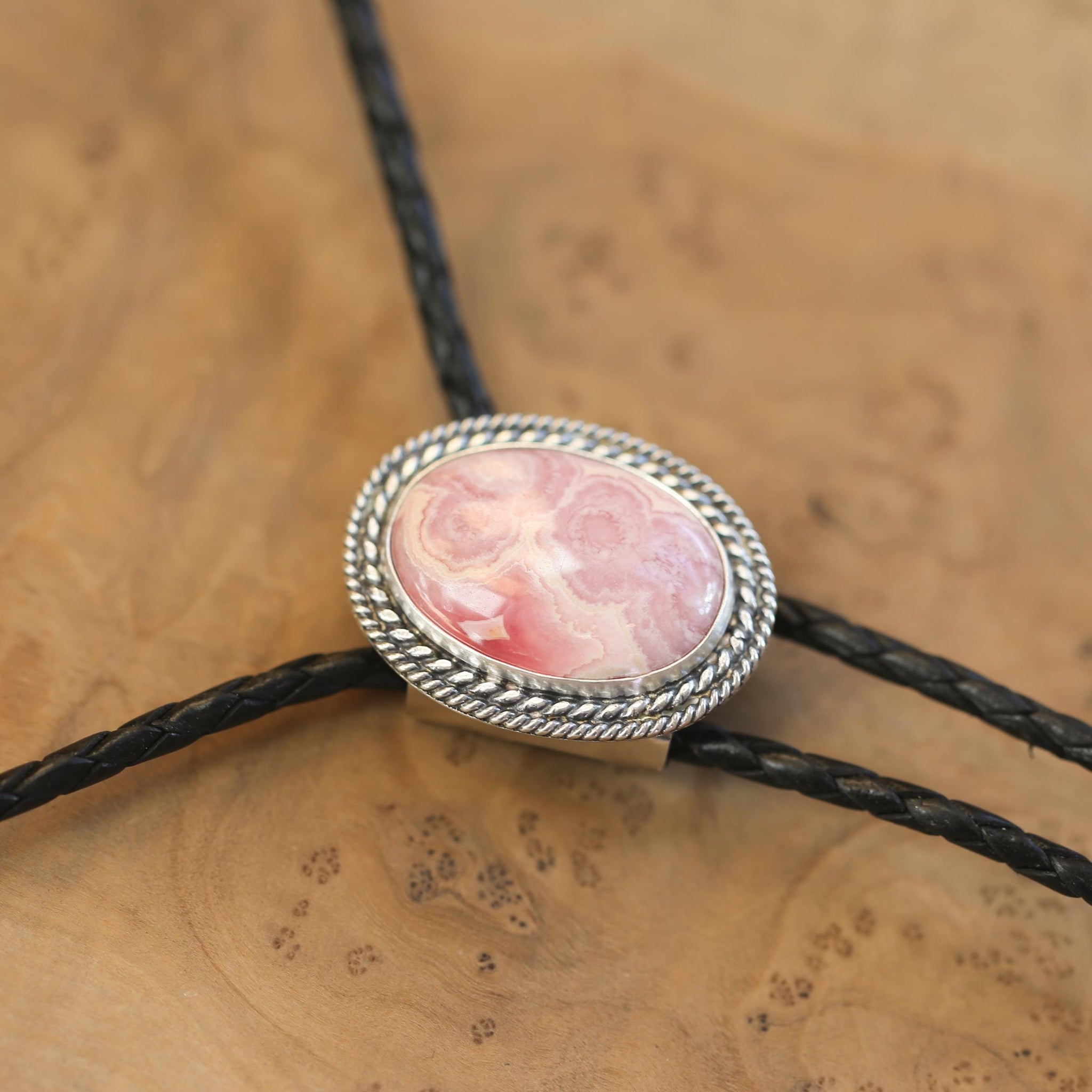 Spectacular, one of a kind Rhodochrosite Bolo Tie. This listing is for the Rhodochrosite Bolo-tie in the photos which is ready to ship. We rarely see this high-quality, uniquely patterned rosy, creamy Rhodochrosite in such large cabochons. All .925 Sterling Silver metal work and tips, with fine, braided Italian leather. We've used an uber-western, double, graduated twist wire accent, oxidized and finished to a soft, buttery perfection. Ready to ship Traditional Bolo Tie in Rhodochrosite. All traditional silversmithing is done in the LBJ studio in Baltimore, MD