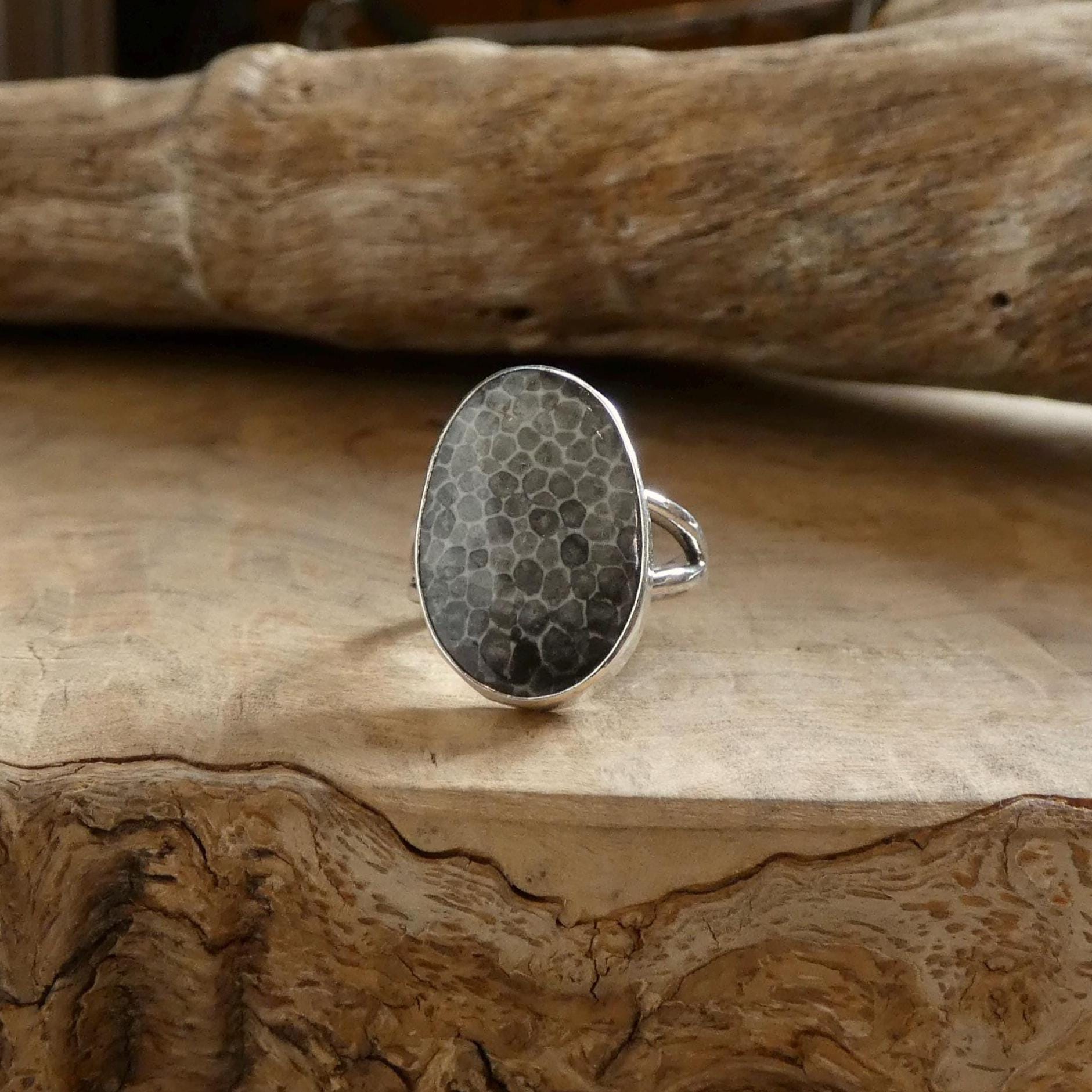 We love this sleek, new, comfortable-fit Black Fossil Coral ring design. This ring is designed to highlight this fantastic big fossilized coral stone, and it is ultra comfortable with its minimal bezel setting and lightweight sterling silver split shank. The agatized Coral is so stunning, featuring fantastic patterns in earthy greys and tans. This ring will quickly become a favorite and very grounding ring to wear. Big Fossilized Coral Statement Ring.