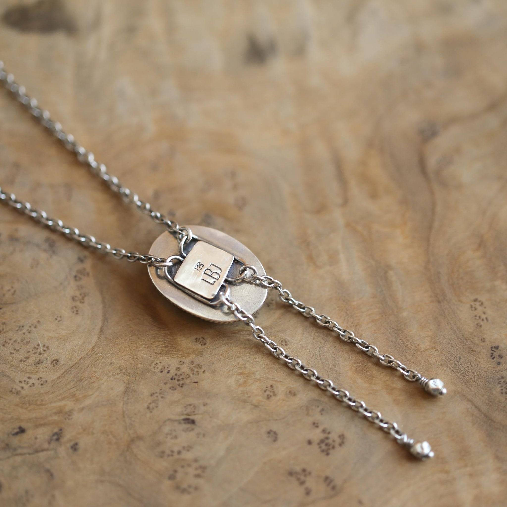 This design is a success in so many ways. We love the western bolo tie, but we wanted a more feminine version of it using .925 Sterling Silver. We've used traditional southwestern silversmithing - .925 twist wire accents - oxidized, sanded and polished. This necklace closes in the back with a clasp like any necklace and uses our ultra-comfortable .925 Sterling Silver standard chain -- the .999 Silver 'tips" are an added bonus. An LBJ original!