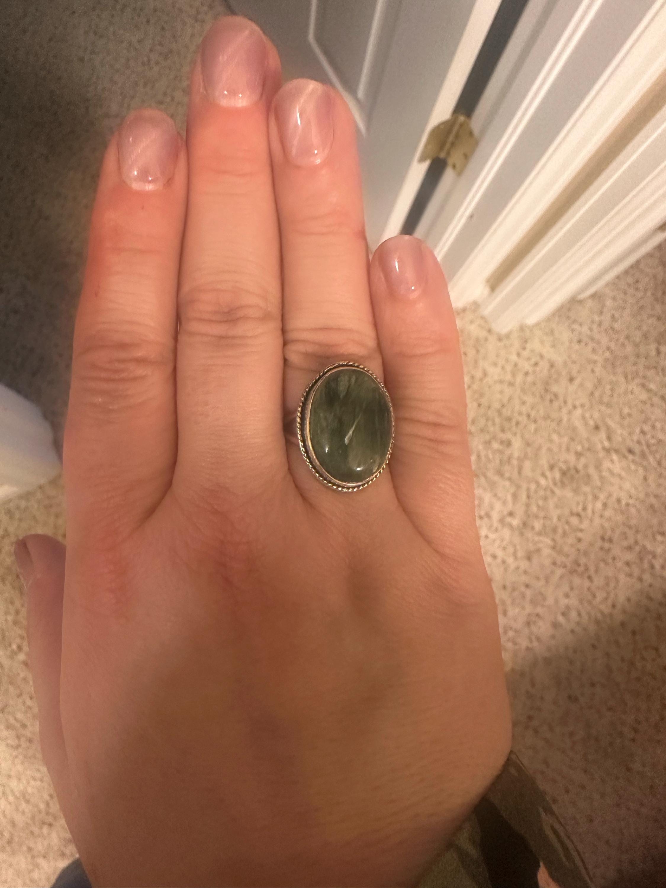 The Boho Ring design looks and feels like it could have been made by a master silversmith from another time and place. Simple, classic design with the .925 Sterling Silver twist wire and double round split shank make it feel like you're sliding on something that someone will still wear in 50 years. The oxidized and polished .925 Sterling Silver looks amazing against the earthy green seraphinite stone. You might want to make room on your hand -- you're going to want to wear this big statement ring all the time.