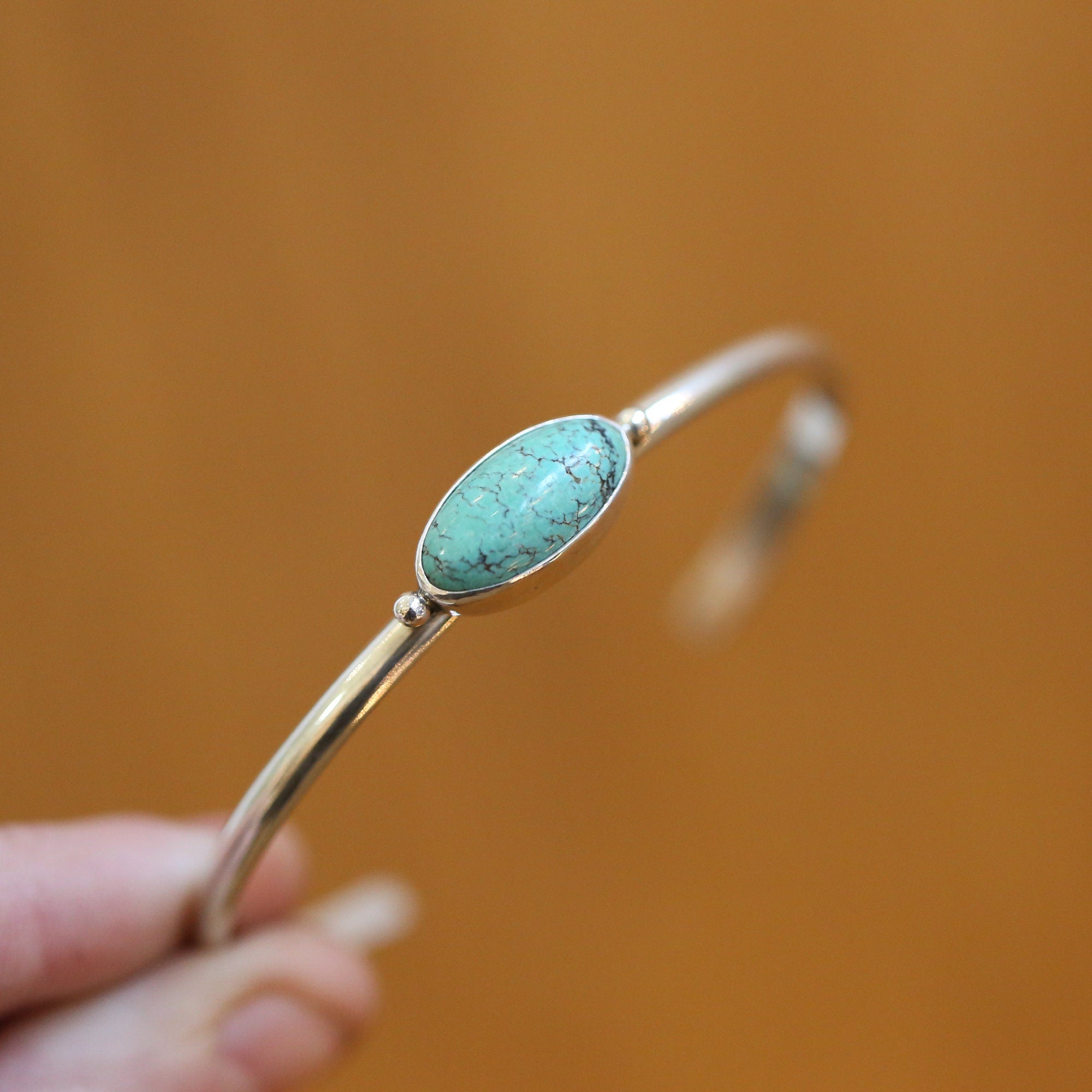 Our LBJ Simple Cuff Bracelet from gorgeous, AAA turquoise with a low-dome half-round wire and two sterling silver bead embellishments to flank the 8X16mm Turquoise oval. Wear alone or stack 'em up! All traditional silversmithing is done in my Baltimore, MD studio.