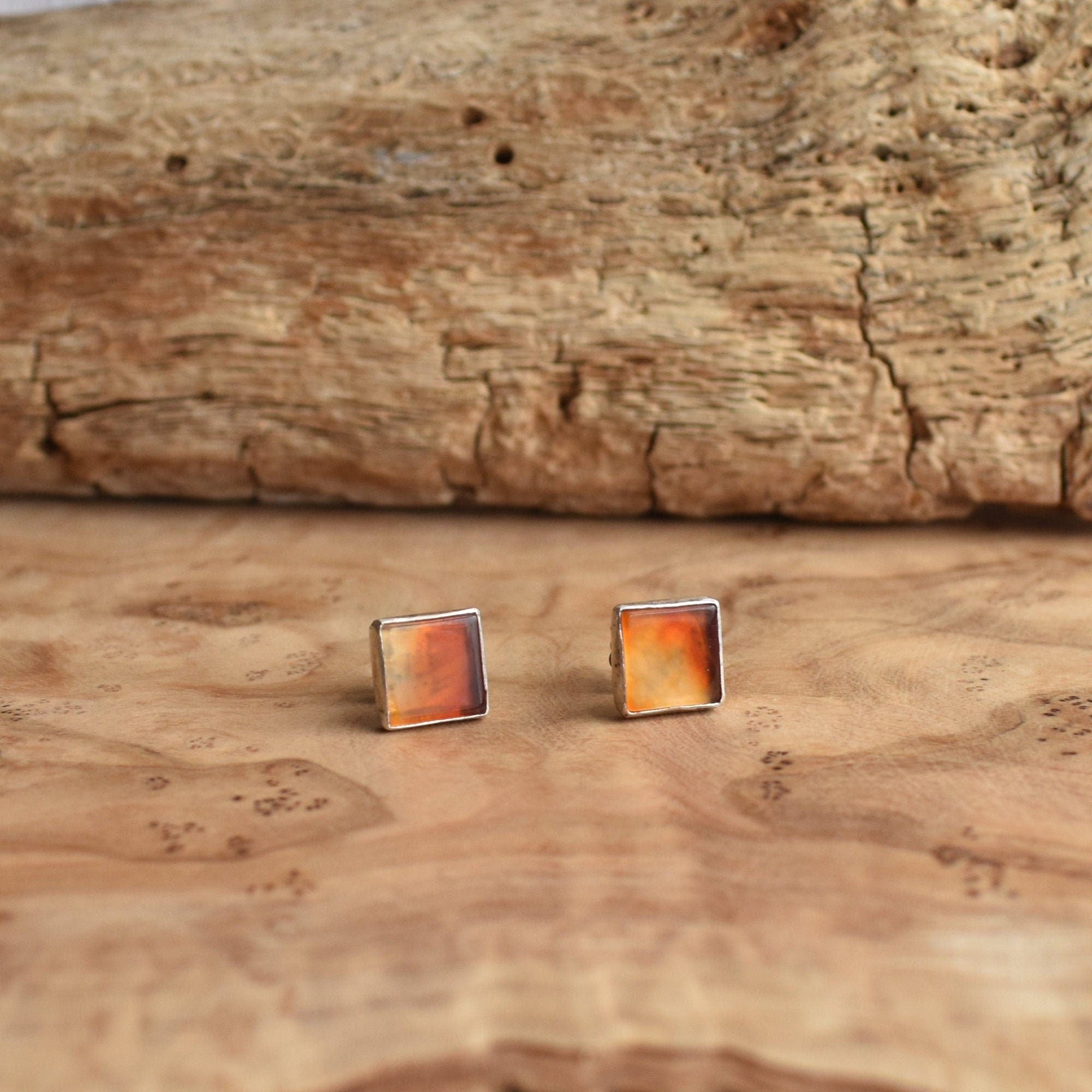 Stunning AA Carnelian flat, square cabochons are the star of the show in these posts! Wonderful flat, right-angled square is so unique -- we already know we didn't grab enough of these hot carnelian stones. We've super polished the .925 Sterling silver beneath so you can see the lovely gradation of color in the orangey-red natural carnelian posts.