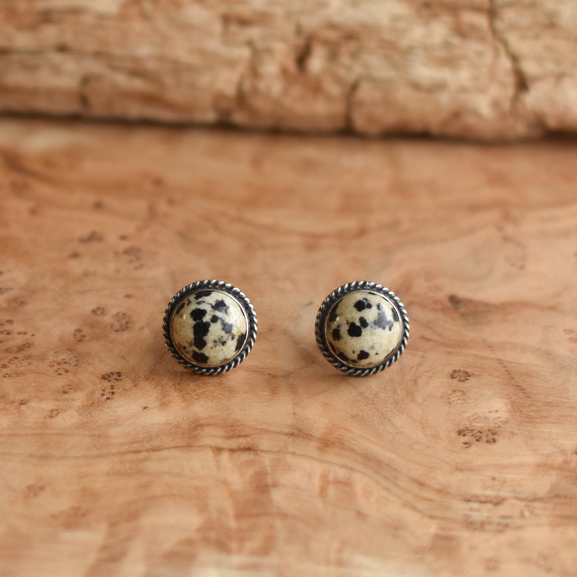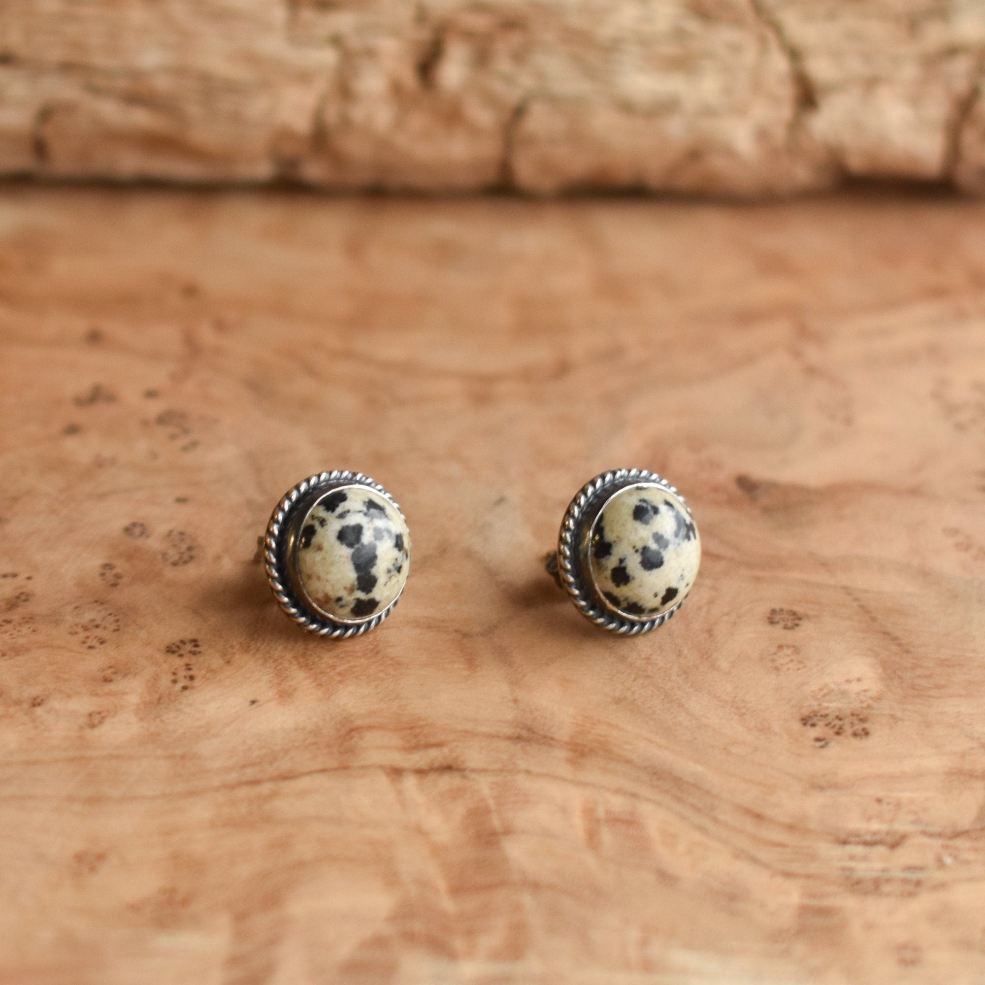 Dalmatian Jasper has to be the cutest stone nature has to give. Like a spotted dalmatian -- the patterns appear in this natural jasper stone - 10mm. So expressive and fun -- all you need are these little post earrings to make a statement with this stone. Just fun! And natural! And a bang for your buck! ) -- simply bezel set in .925 Sterling Silver -- 10mm.