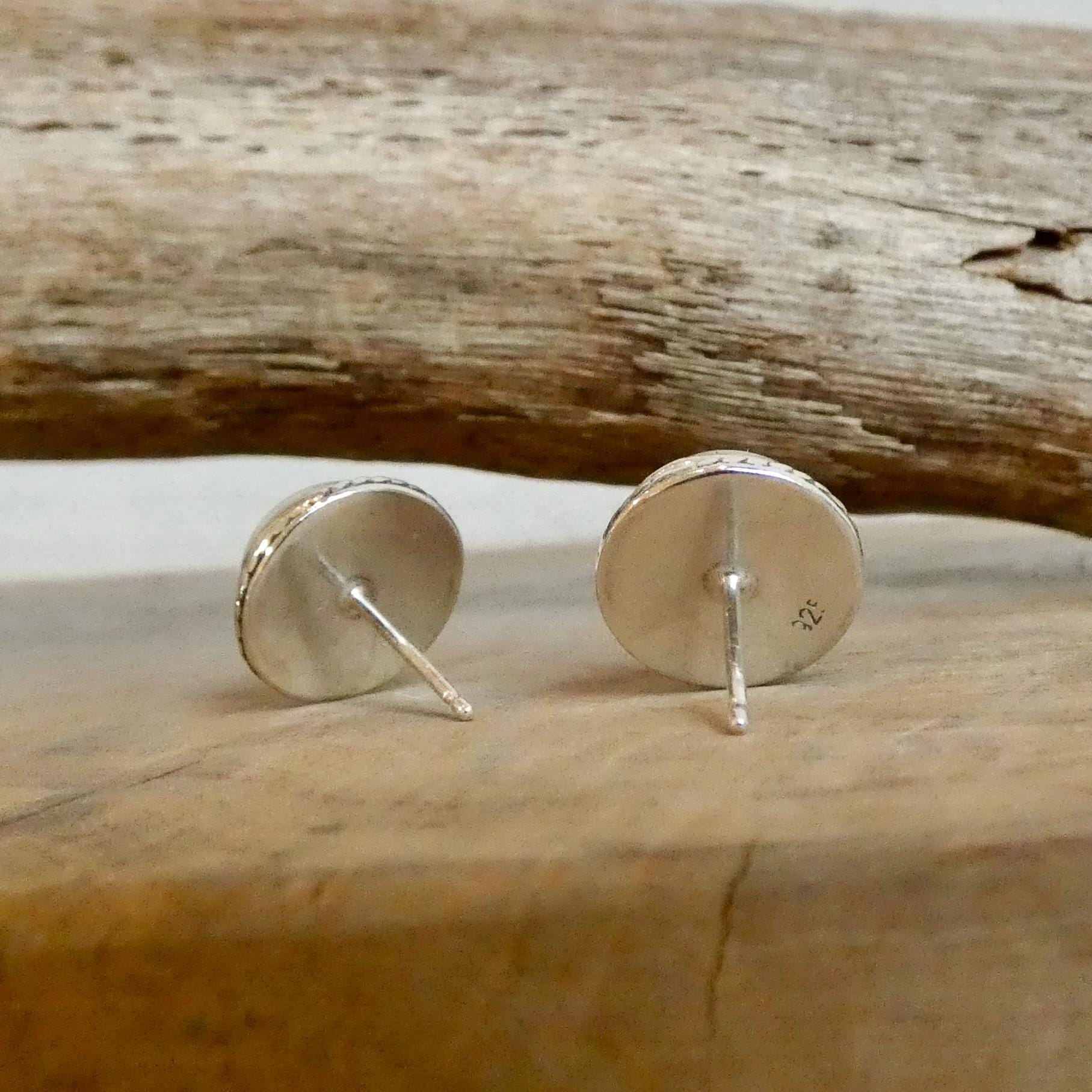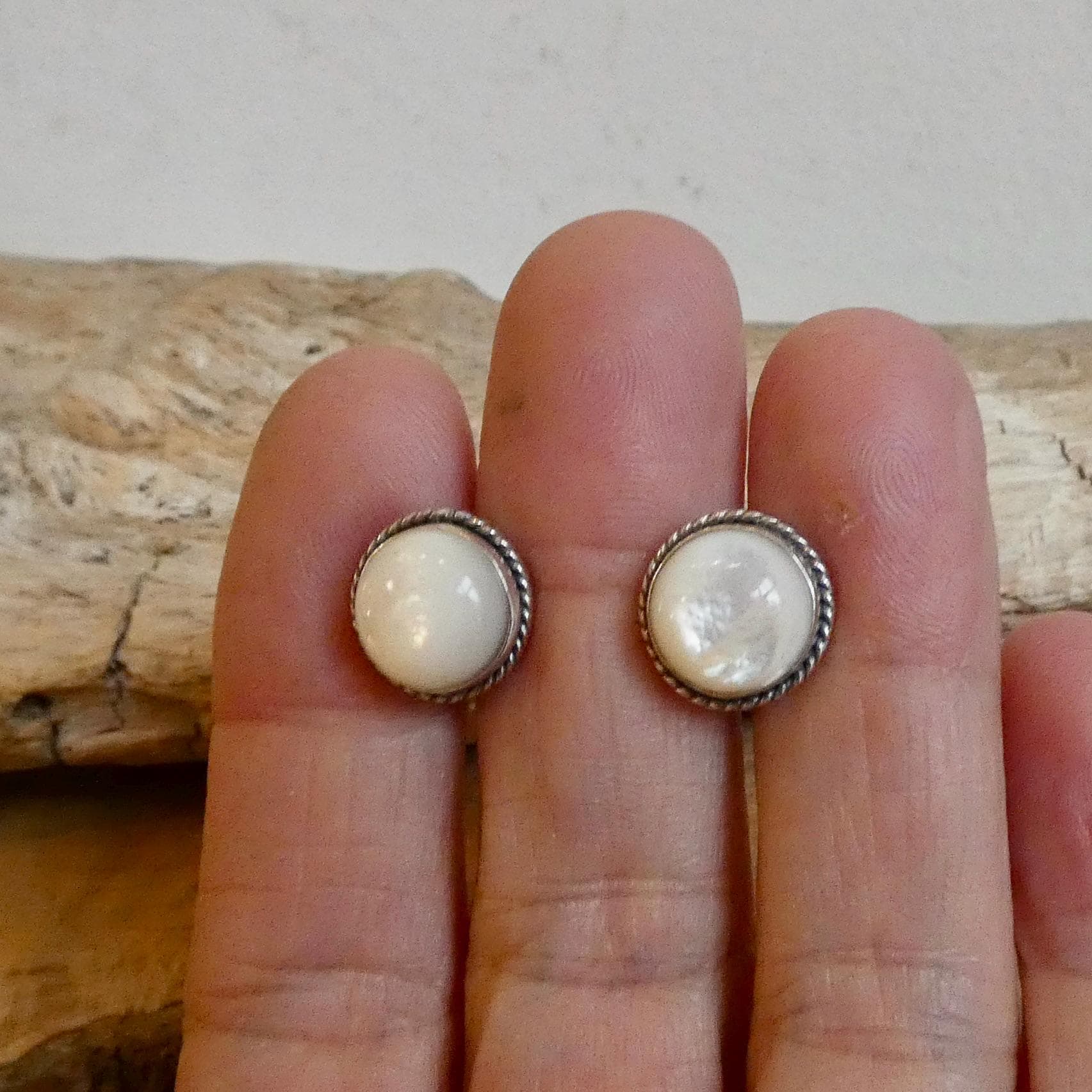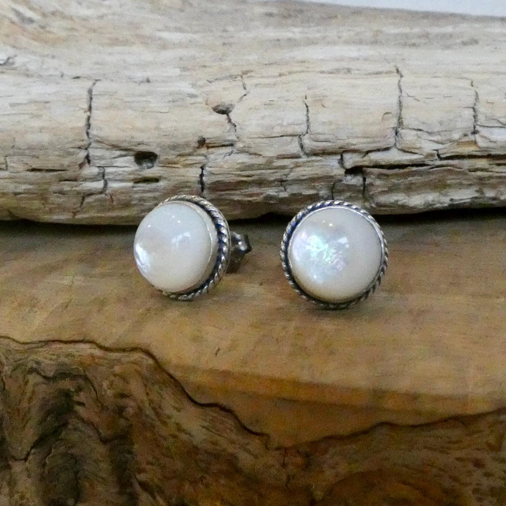 10mm Mother of Pearl (Nacre) cabochon - highlighted by .925 oxidized sterling silver twist wire. They are classic, Western and Modern - with just a little texture and interest. All traditional silversmithing is done in my Baltimore, MD studio.