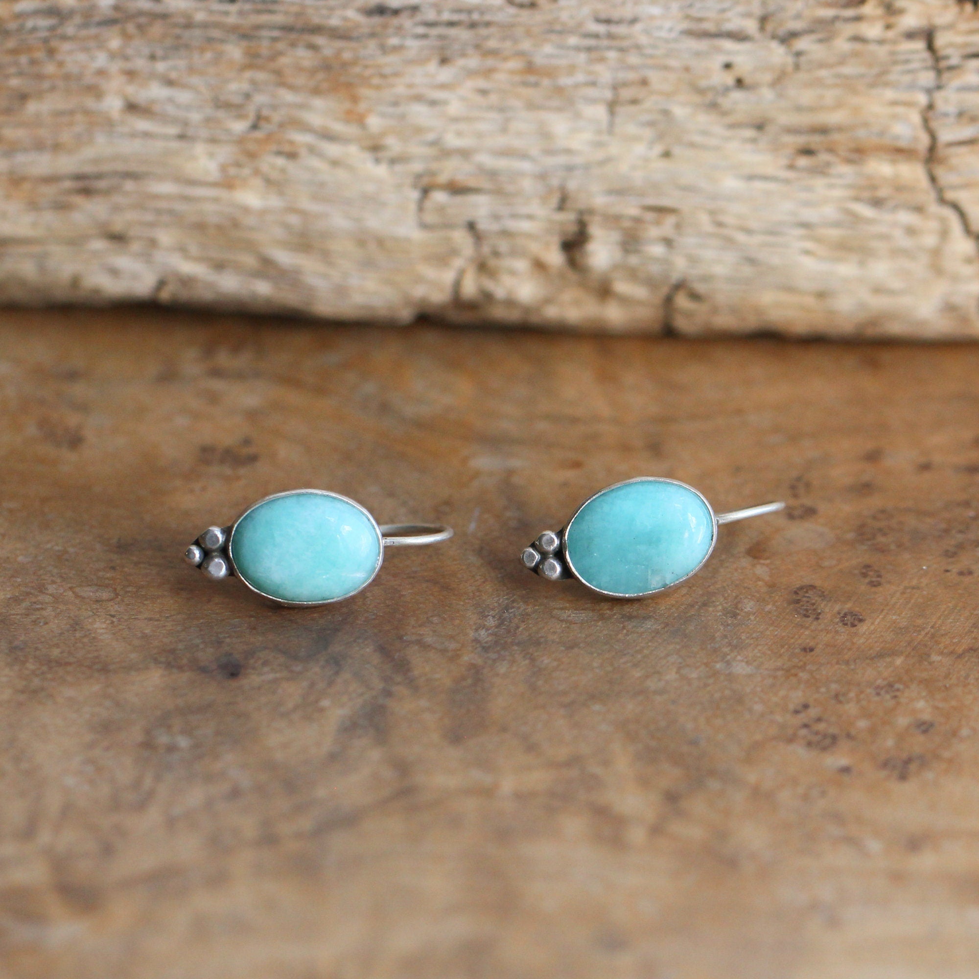 This is the Piper Earring design -- new at LBJ -- but soon to be a favorite! And we couldn't love it more than here in this fabulous, super robine egg blue Amazonite. Modern and traditional at the same time! Minimal amazonite earrings with few embellishments except for the trio of sterling silver beads ... just enough to add mystique to these. All .925 Sterling Silver -- oxidized, sanded and burnished to the perfect finish. Easy on and squeeze although they will come with a rubber stopper.
