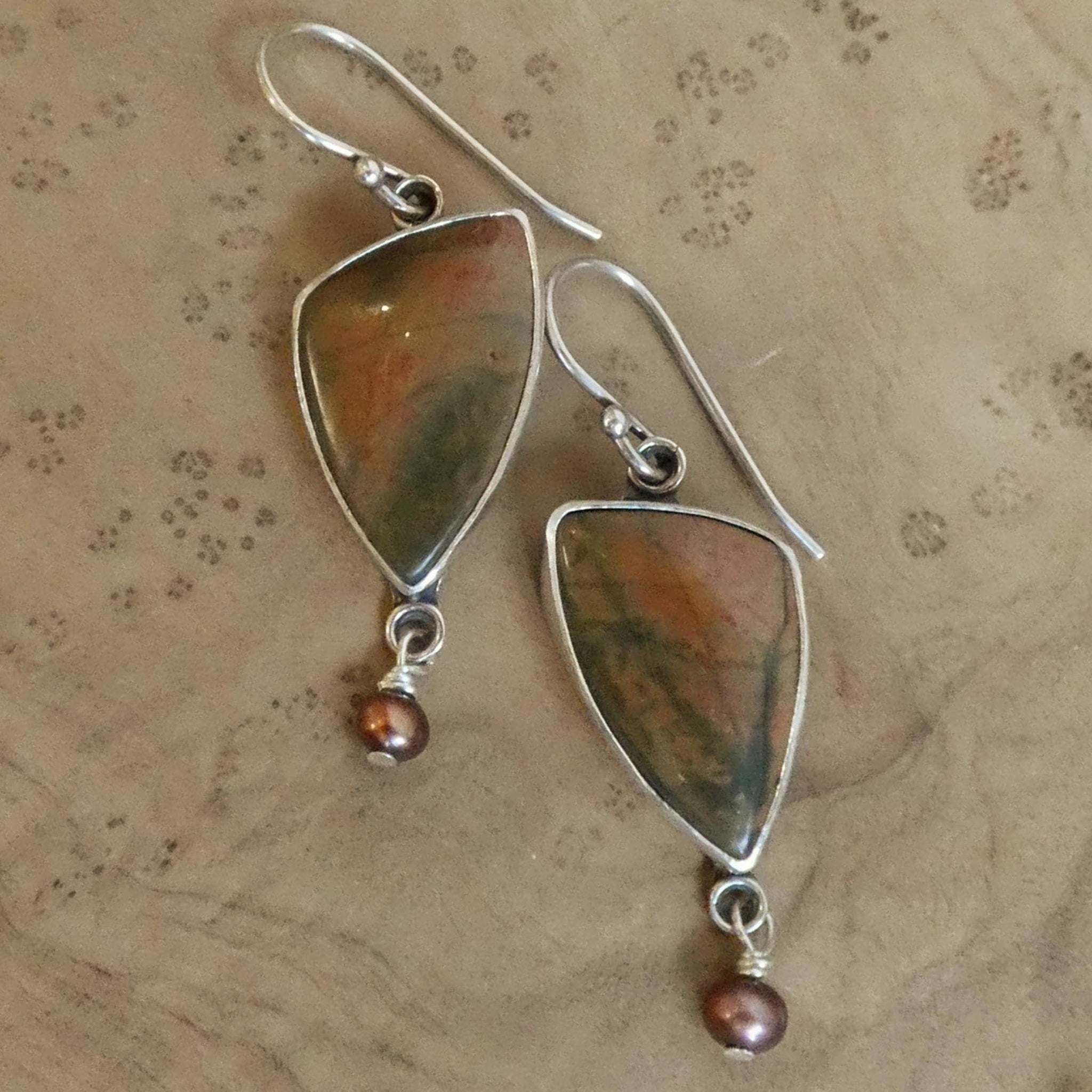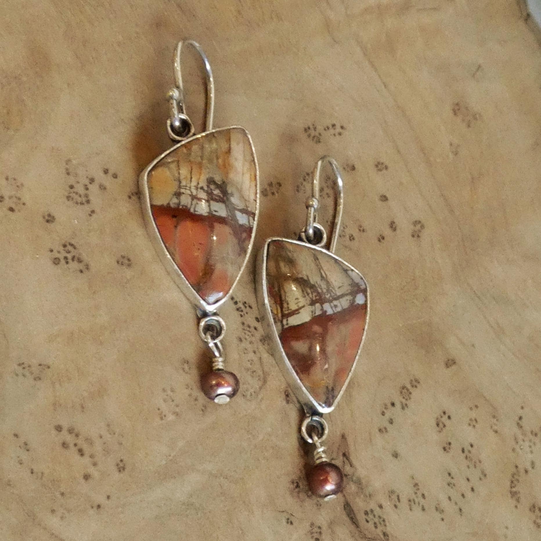 There are two pairs of Red Creek Jasper Earrings with Pearls Drop Earrings in this listing - Choose your pair - your pair will be highlighted as you choose and are ready to ship. Beautiful cherry creek jasper matched pair set with lovely, copper colored Freshwater Pearls - hand wire wrapped and swinging freely 4/5mm. Fun and Boho jasper drop earrings - .925 sterling silver.