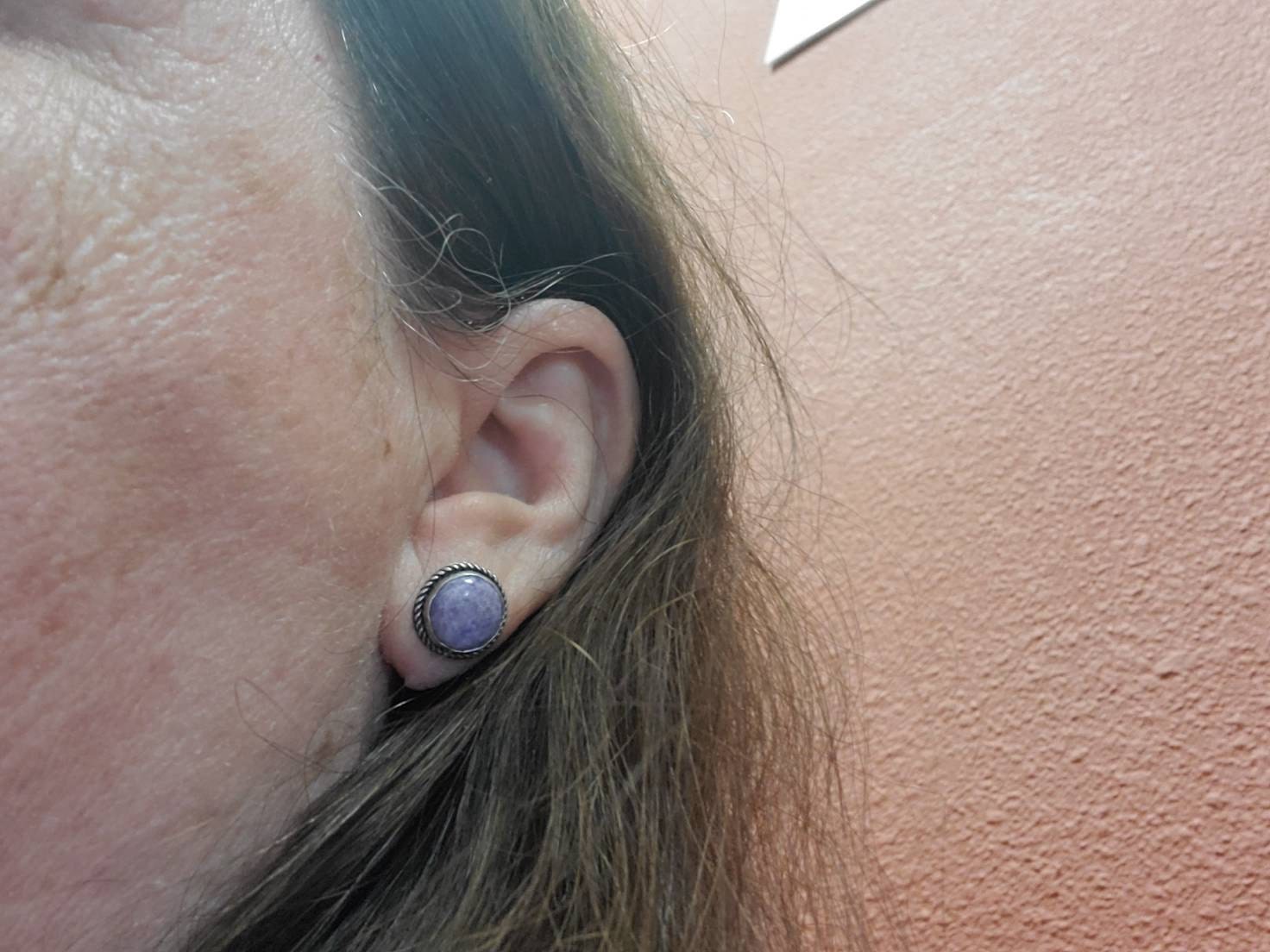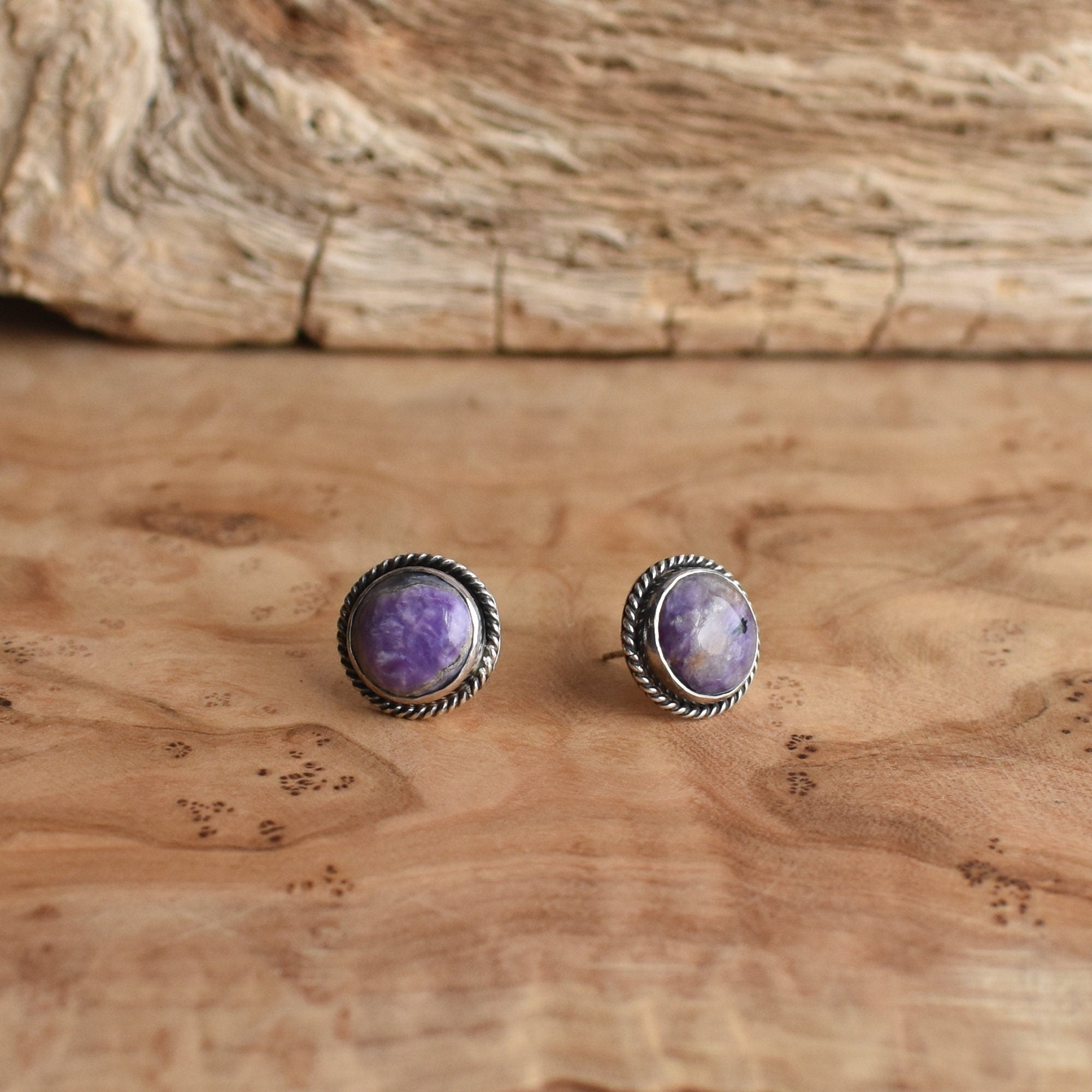 10mm, AA Russian, Purple Charoite set in .925 Sterling Silver bezel with sterling silver twist wire accent -- .925 sterling silver back and posts -- titanium clutches. All traditional silversmithing done in my Baltimore, MD studio.