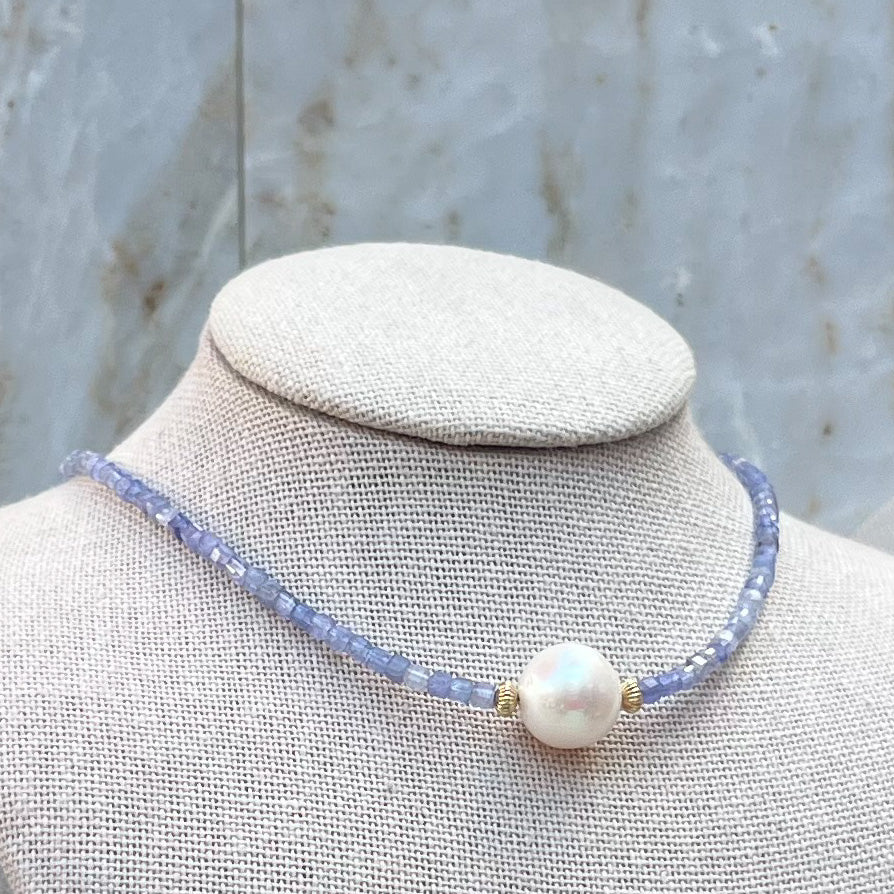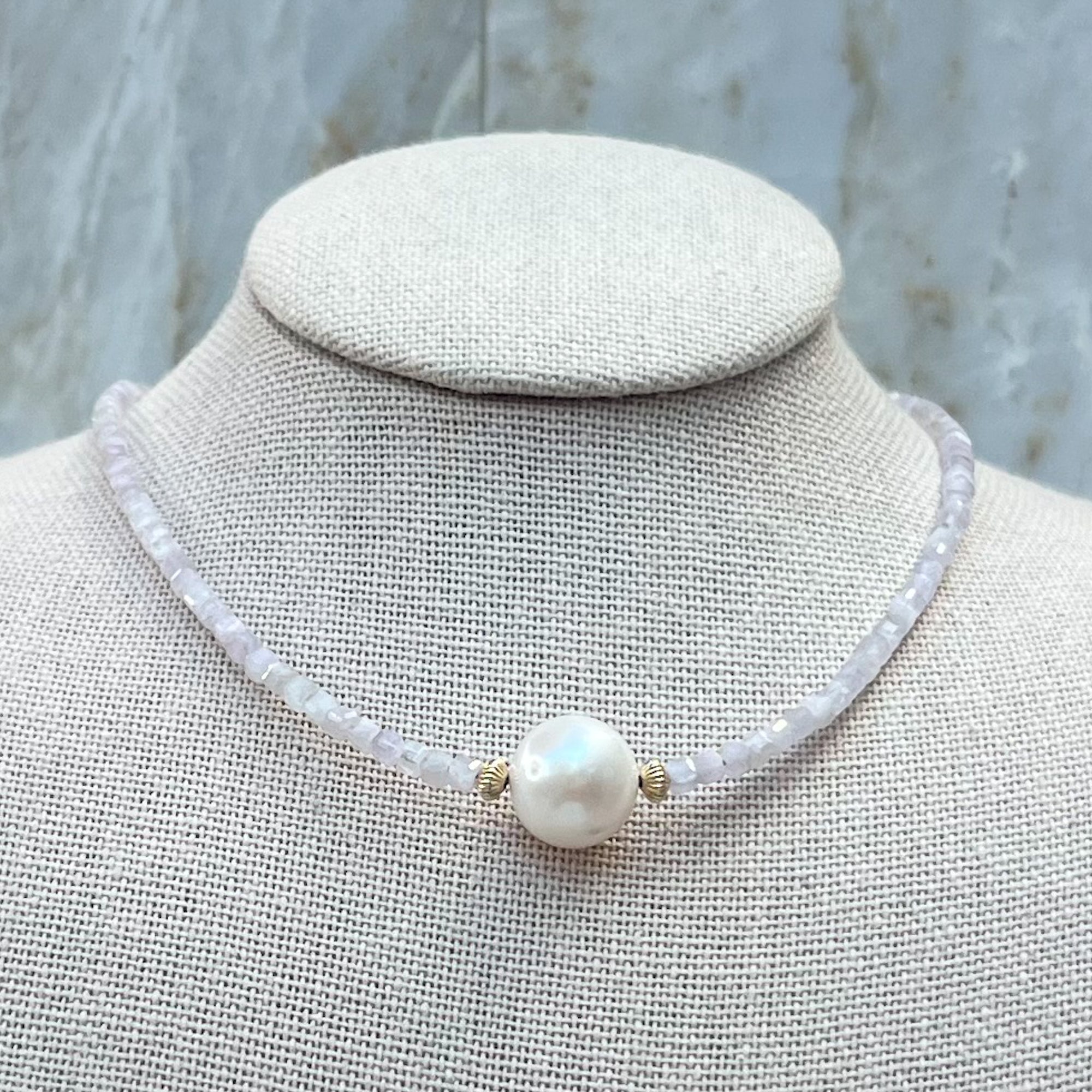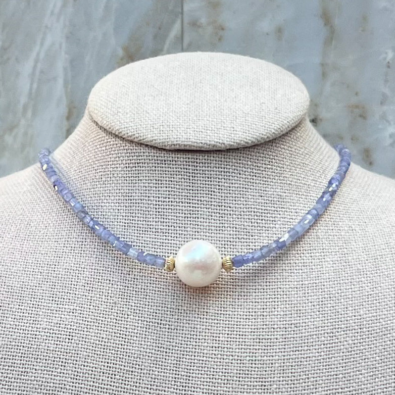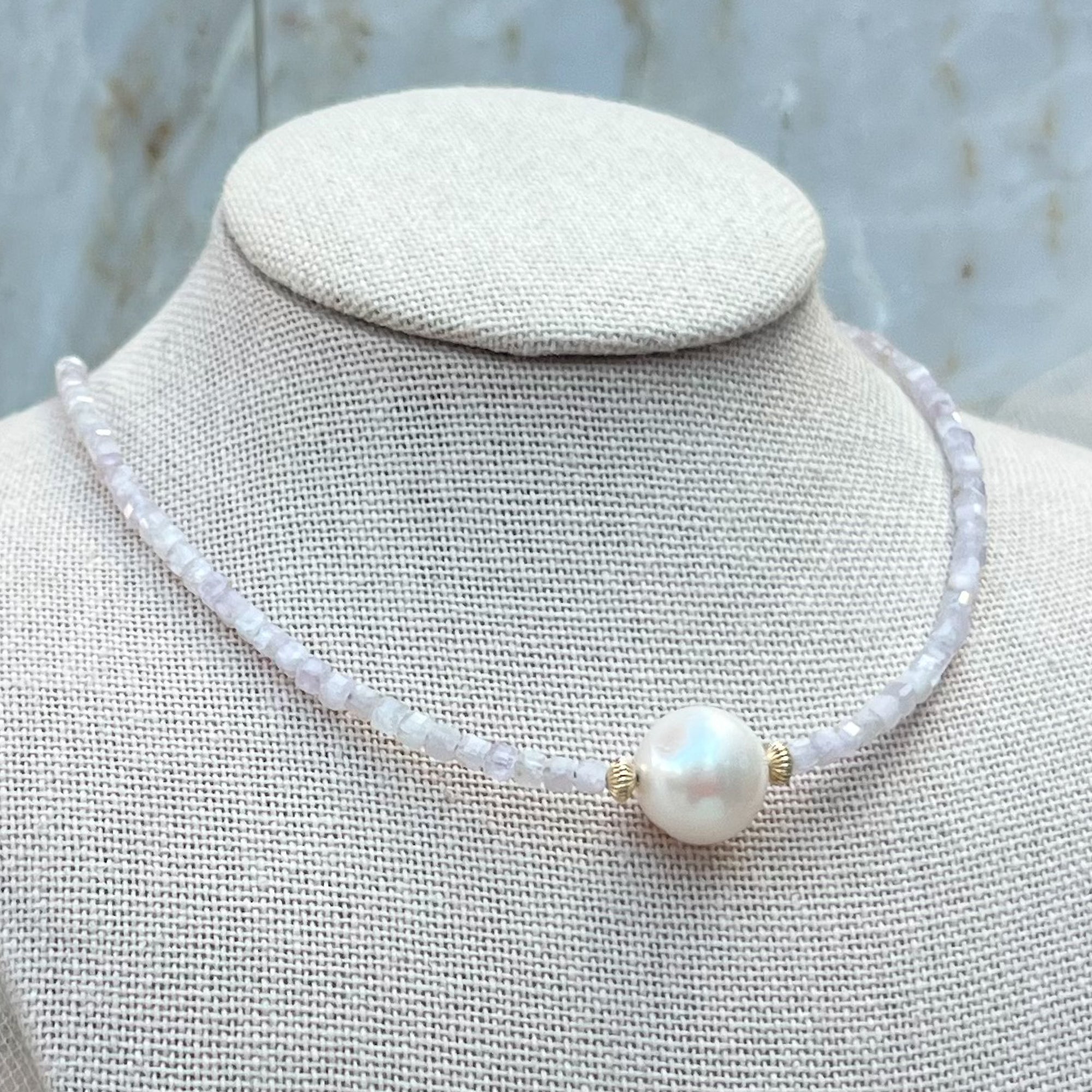 High quality gemstones - choose Apatite, Kunzite or Tanzanite. Glorious 11-12mm central Freshwater Pearl is lustrous and creamy - highlighted simply with fluted, 14 Kt Gold Filled, Beads and findings.