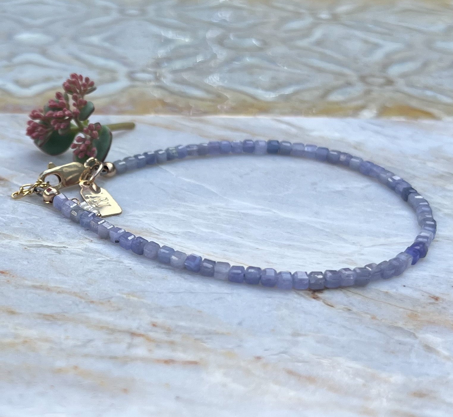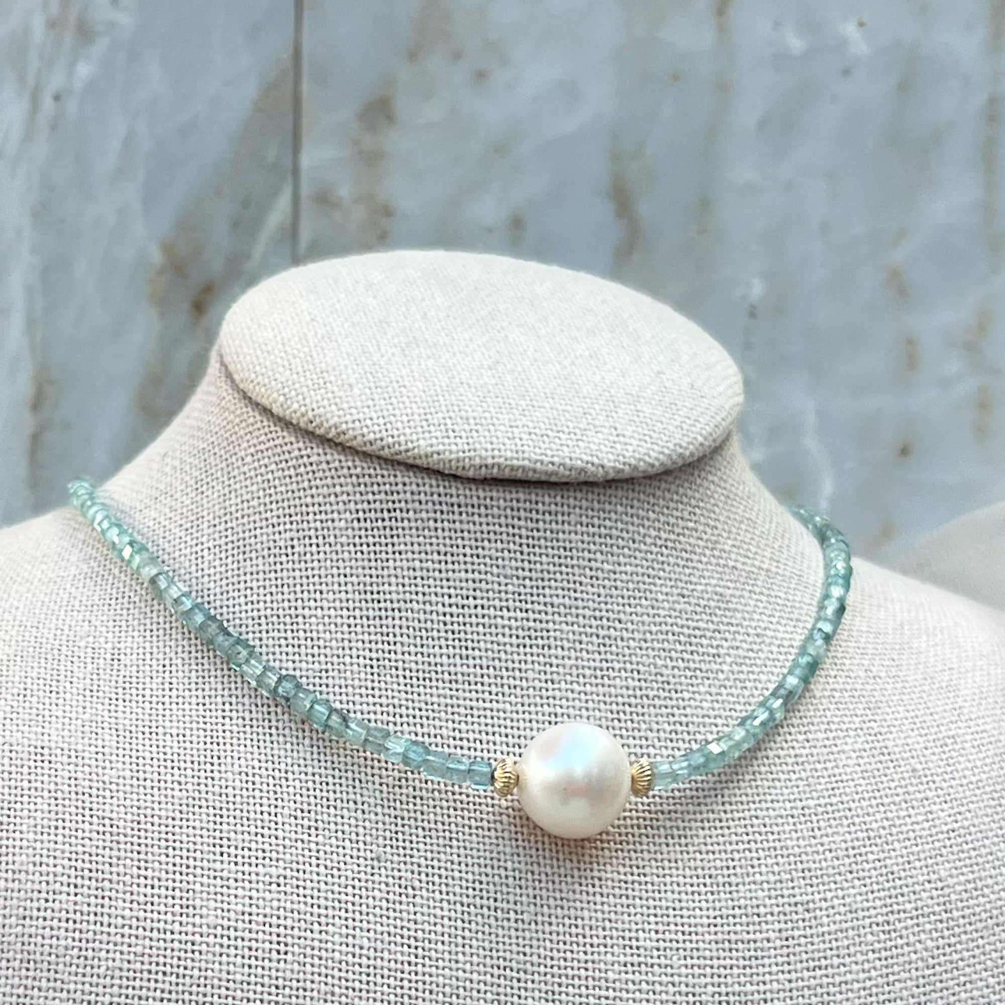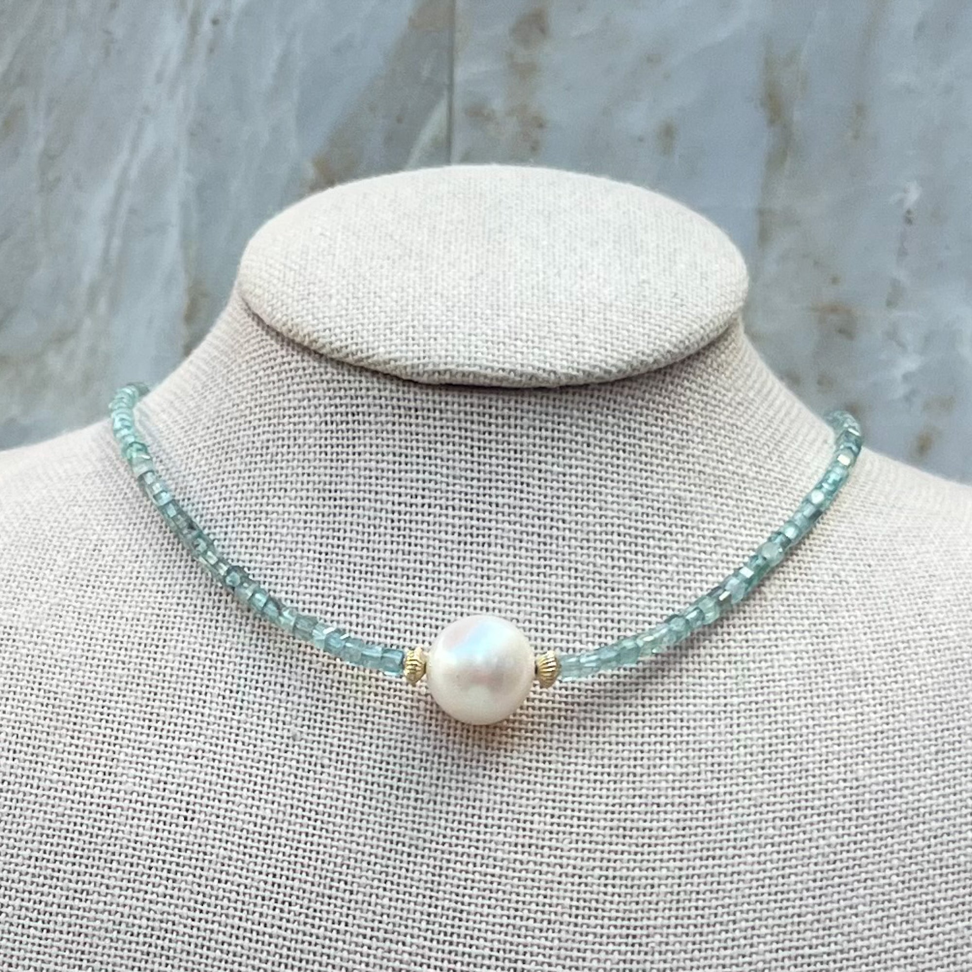 High quality gemstones - choose Apatite, Kunzite or Tanzanite. Glorious 11-12mm central Freshwater Pearl is lustrous and creamy - highlighted simply with fluted, 14 Kt Gold Filled, Beads and findings.