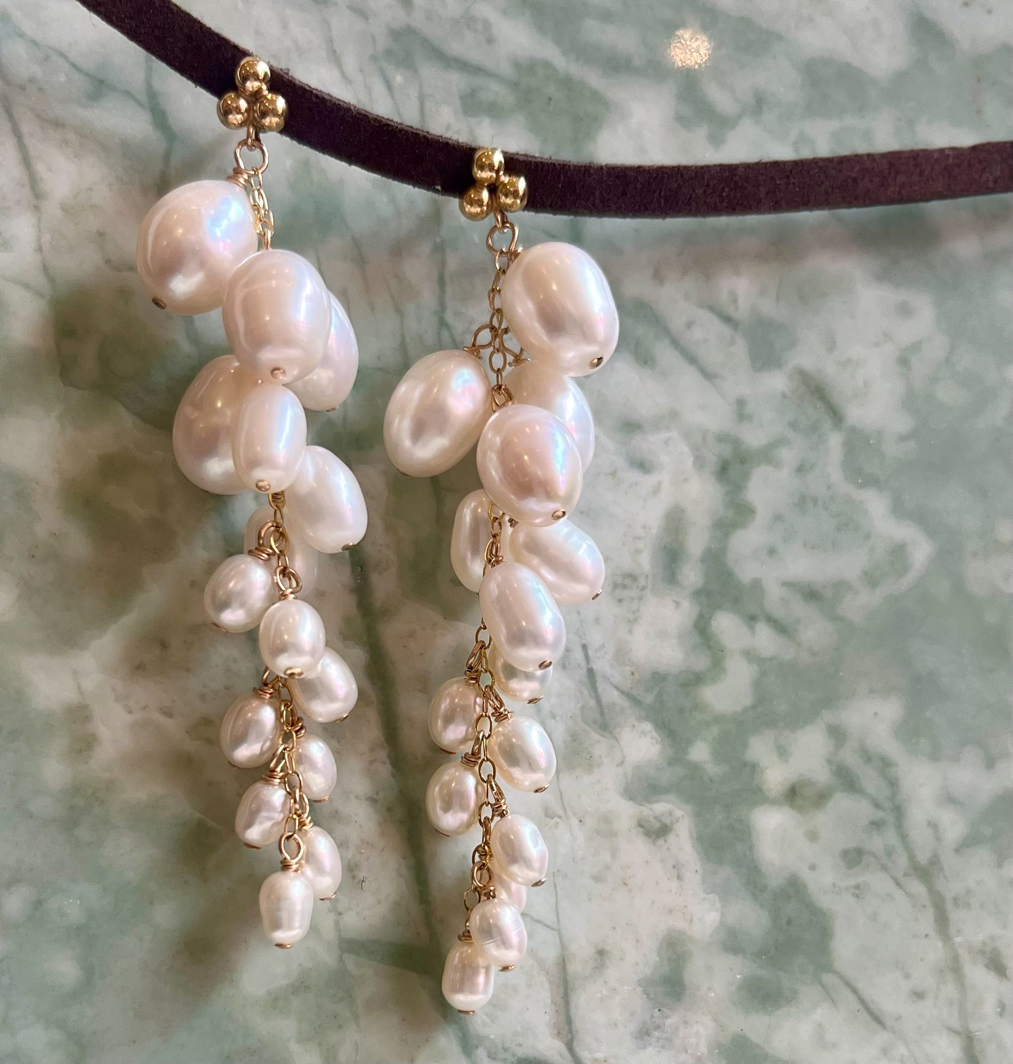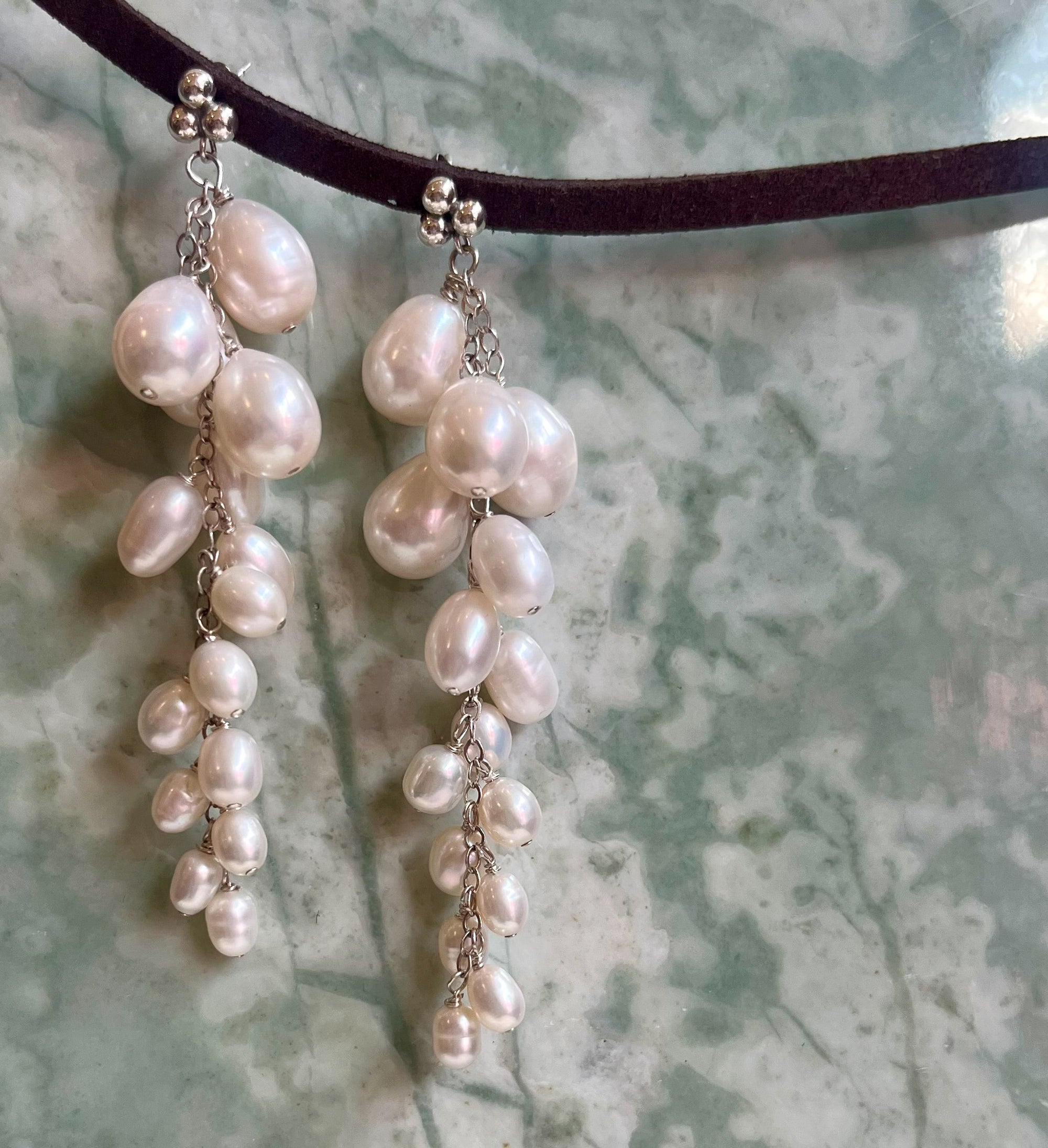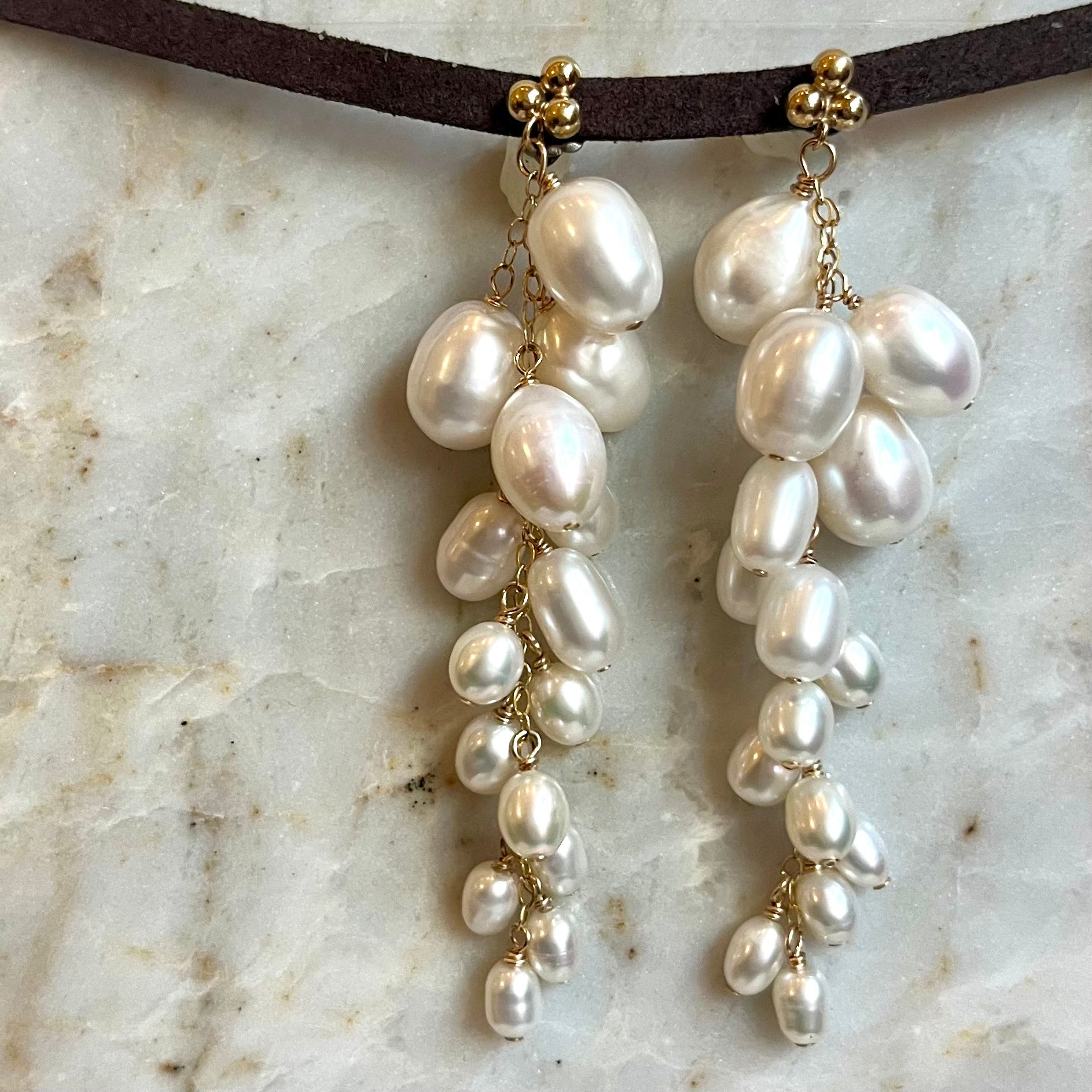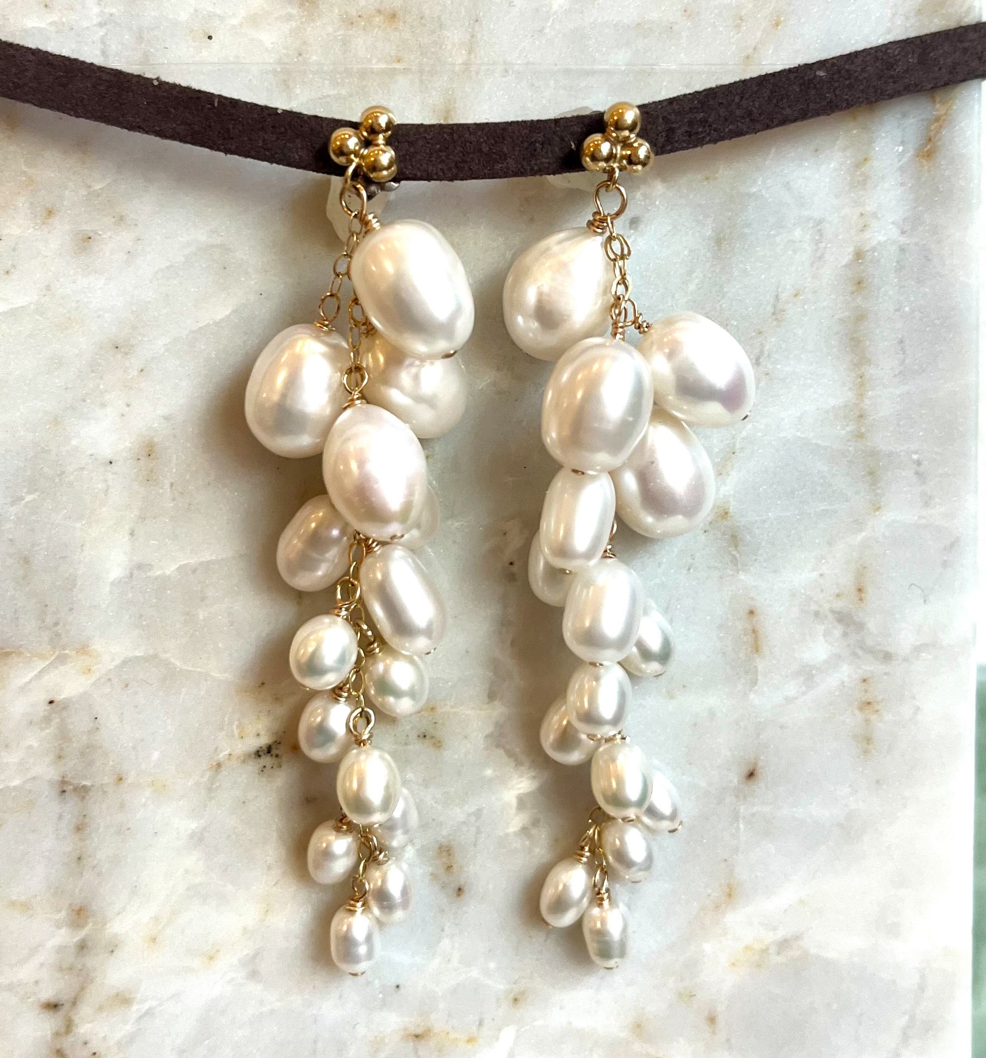 You can't get more glamorous and elegant than our LBK Pearl Cluster Drapes. We've chosen creamy, white, high-quality, freshwater rice pearls and carefully created these distinctly rich and elegant, 'night out' pearl Earrings. Whether for the bride or any lover of pearls - these LBJ Long, Formal Freshwater Pearl Cluster Earrings are available in .925 Sterling Silver or 14KTGF Metals.