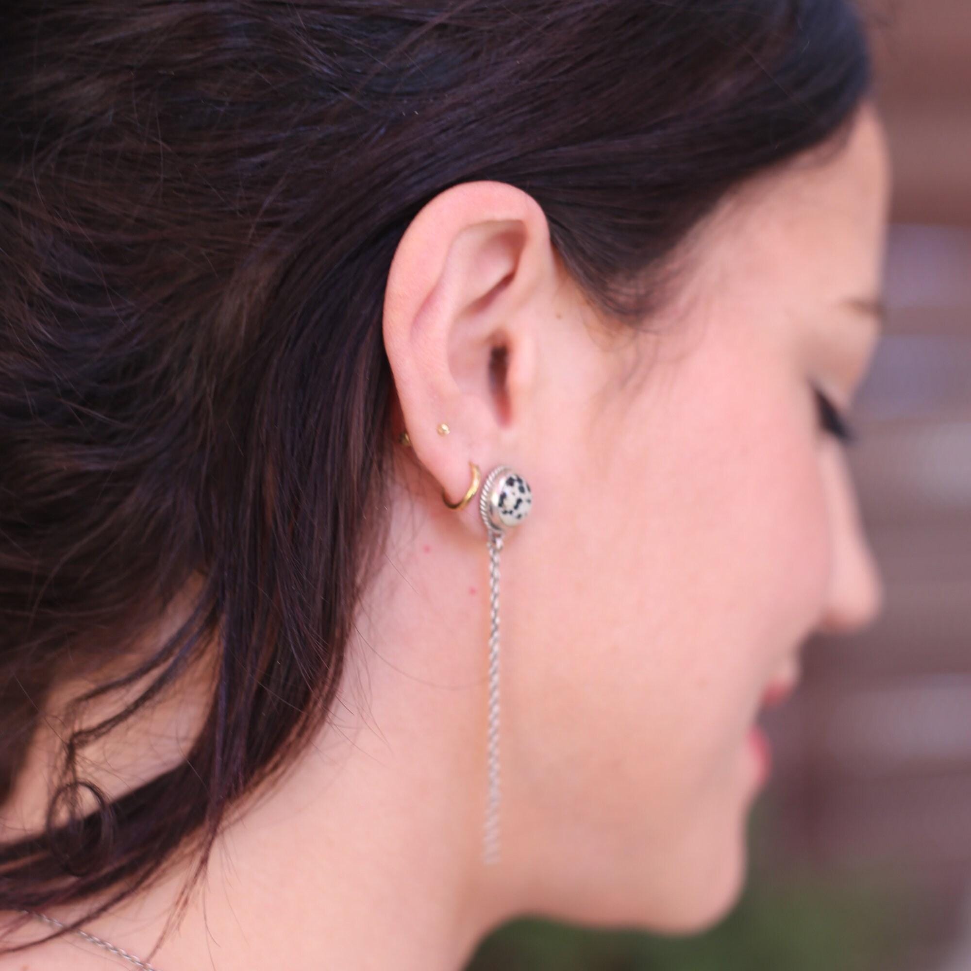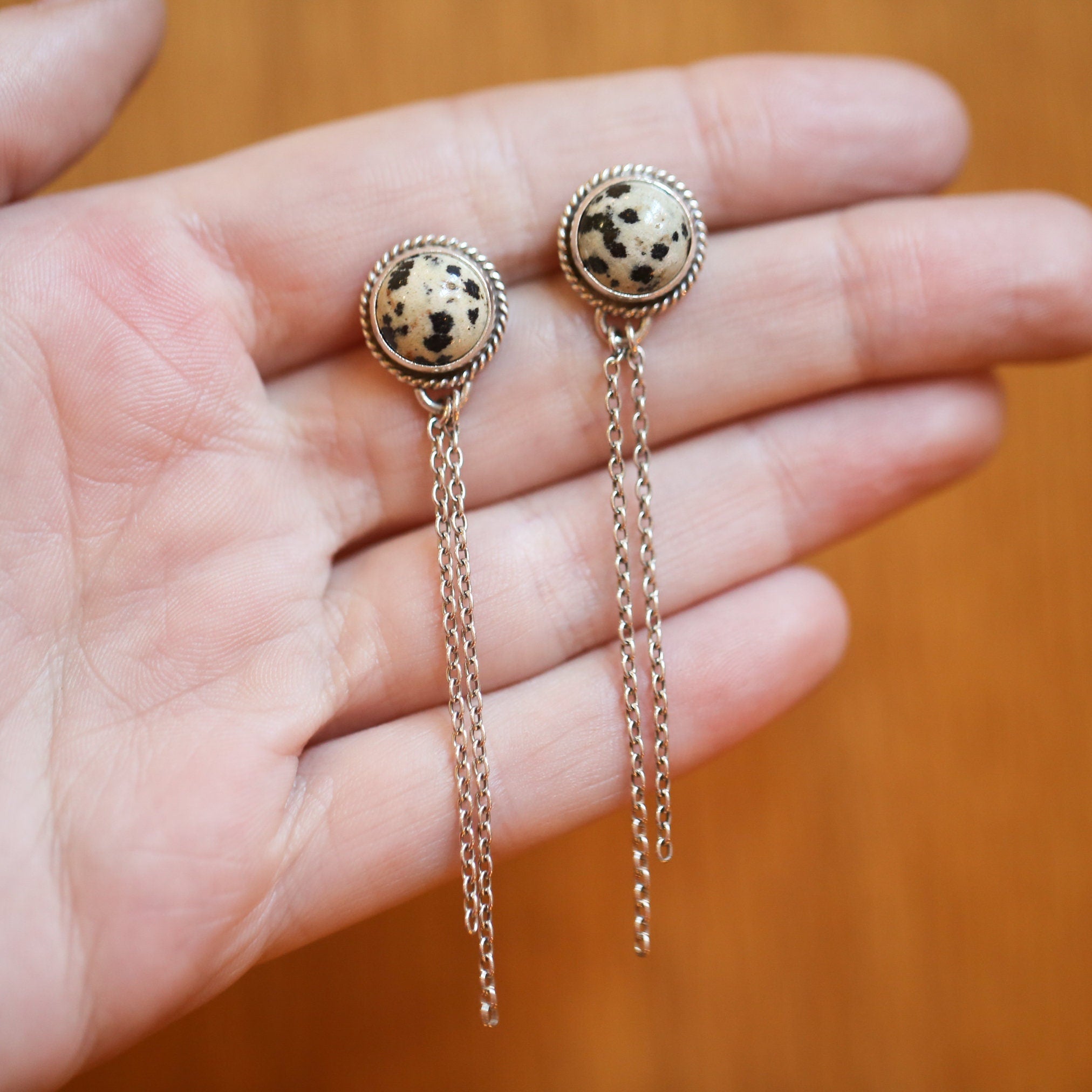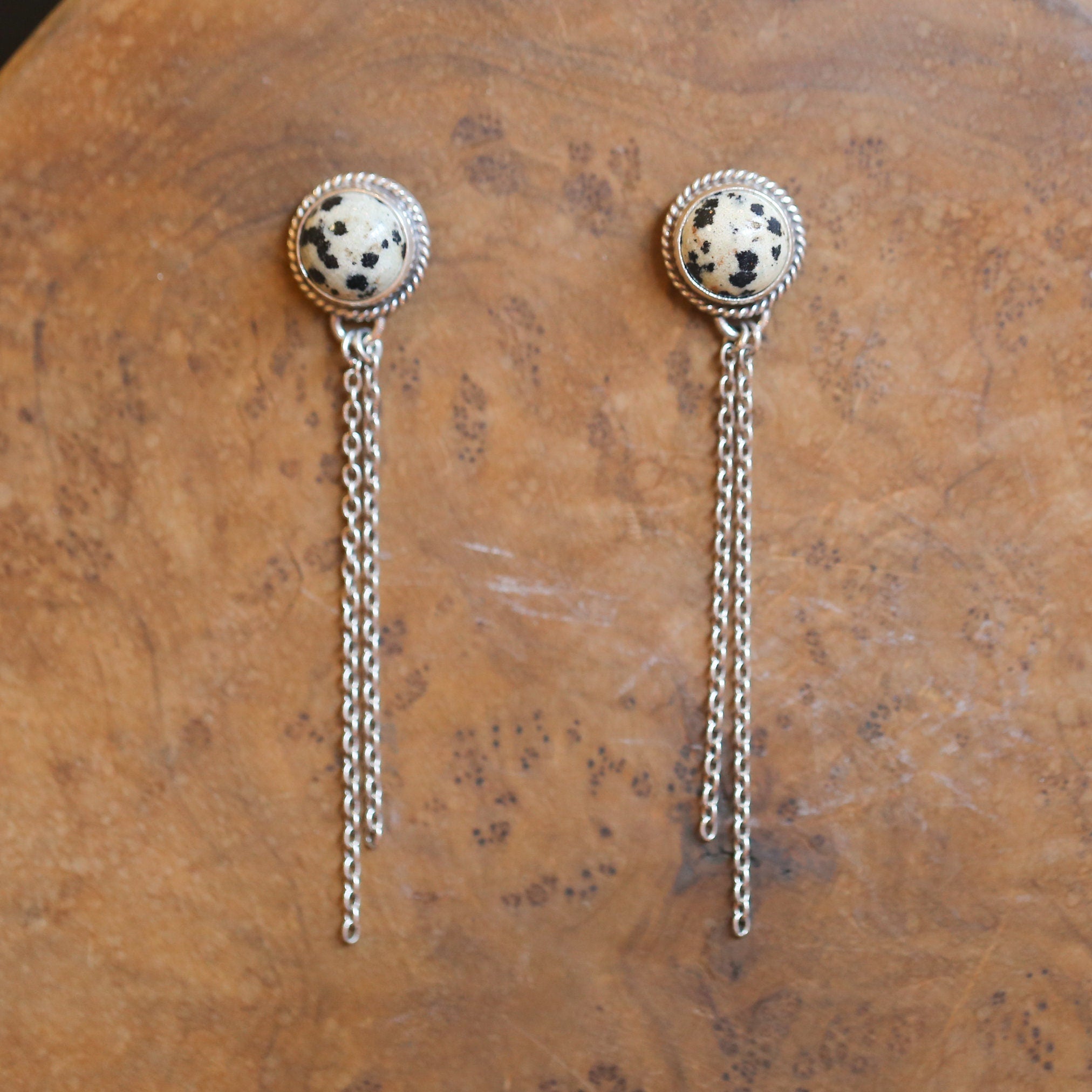 Elegant and Modern, Dalmation Jasper Chain Earrings. Dalmation Jasper is such a western stone. Like a Palamino or a Jersey Cow Pattern - the black spots on Dalmation Jasper are completely natural! Beautiful, Dalmation Jasper Posts on top - 10mm stone - 2, graceful, free dangling, sterling silver chain dangles below. All traditional silversmithing is done in my Baltimore, MD studio