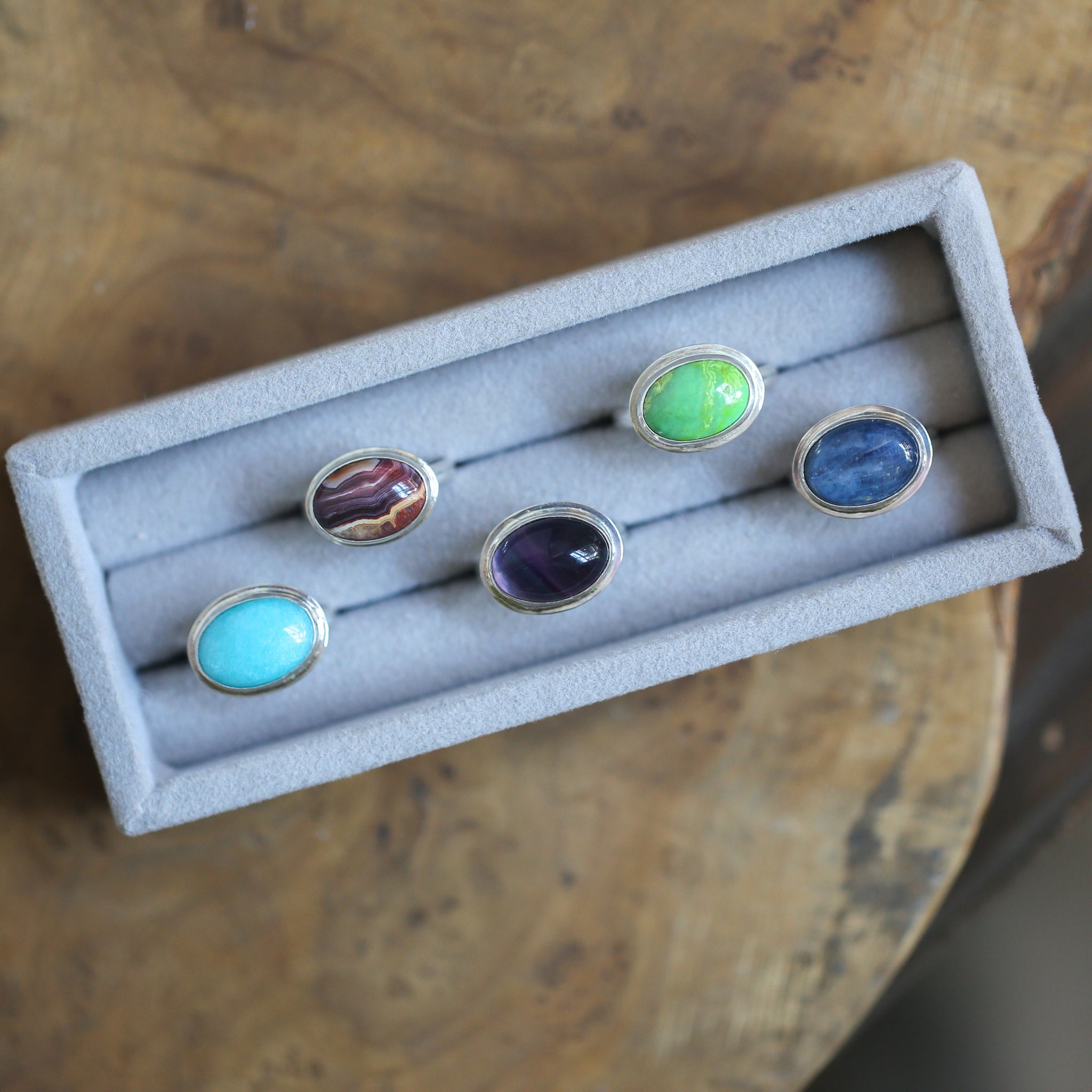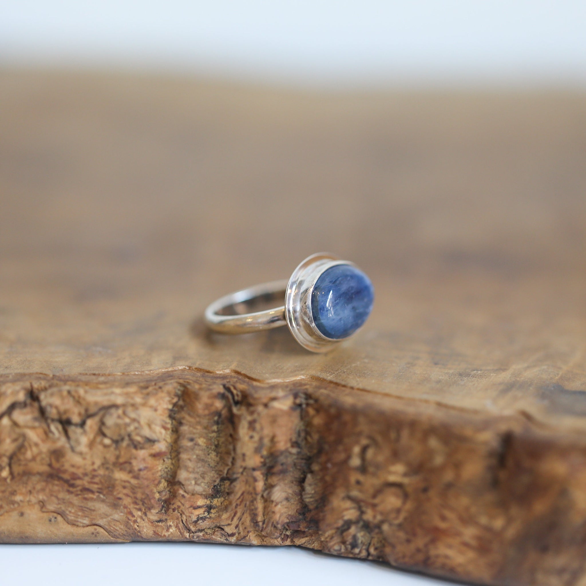This is such a comfortable ring - you won't want to take it off! Perfectly balanced with a healthy-sized 10X14mm high quality, Blue Kyanite stone, minimal yet substantial, .925 Sterling silver edge and half-round shank - super easy to wear on any finger. This ring is all .925 sterling silver.