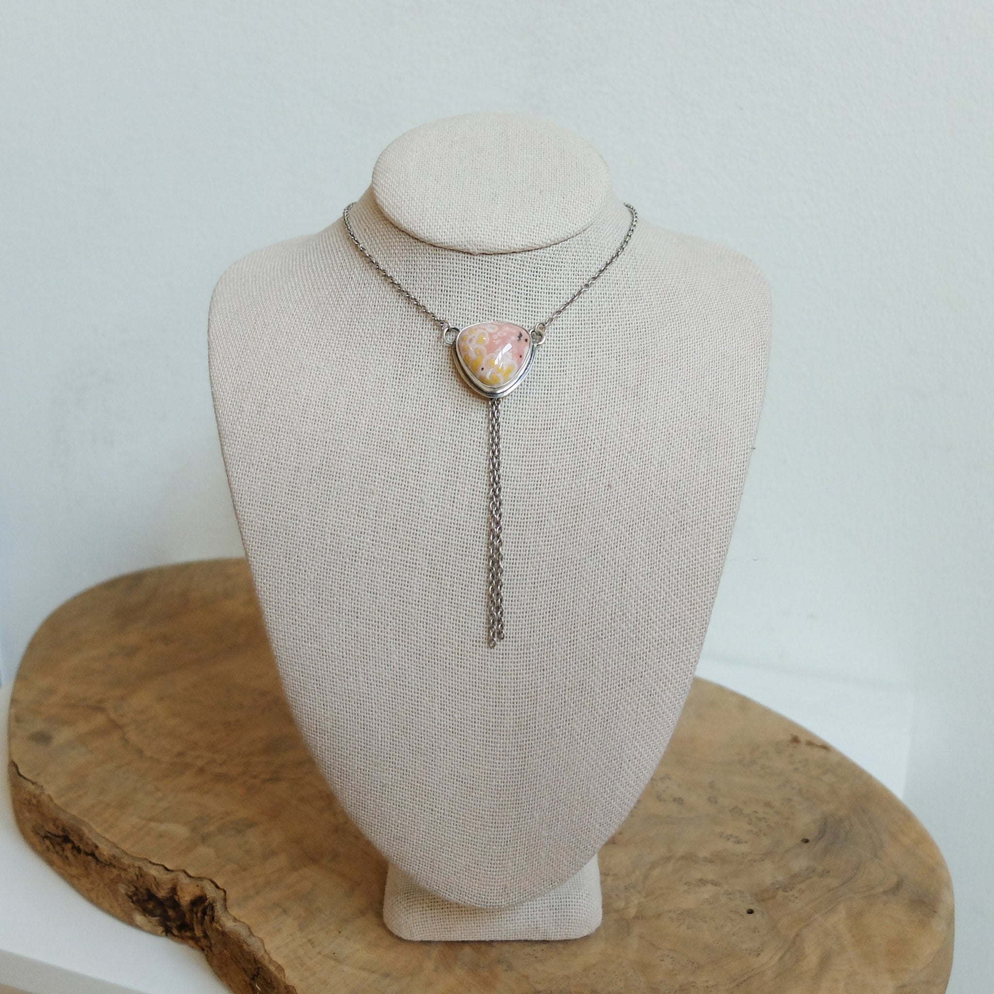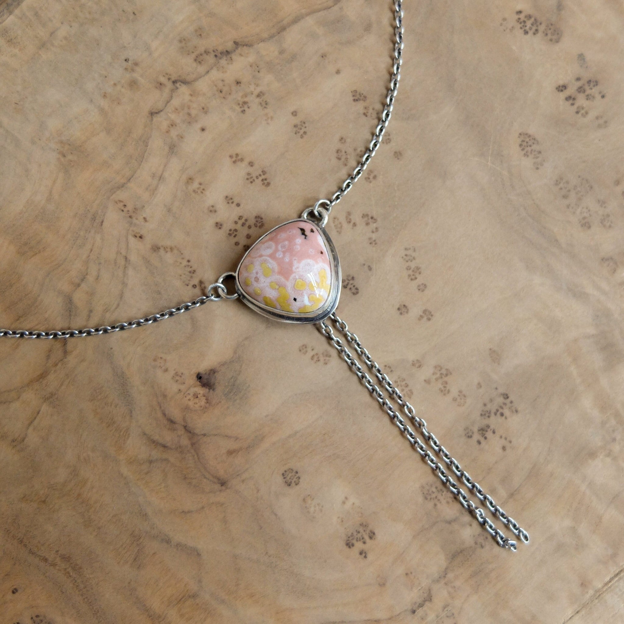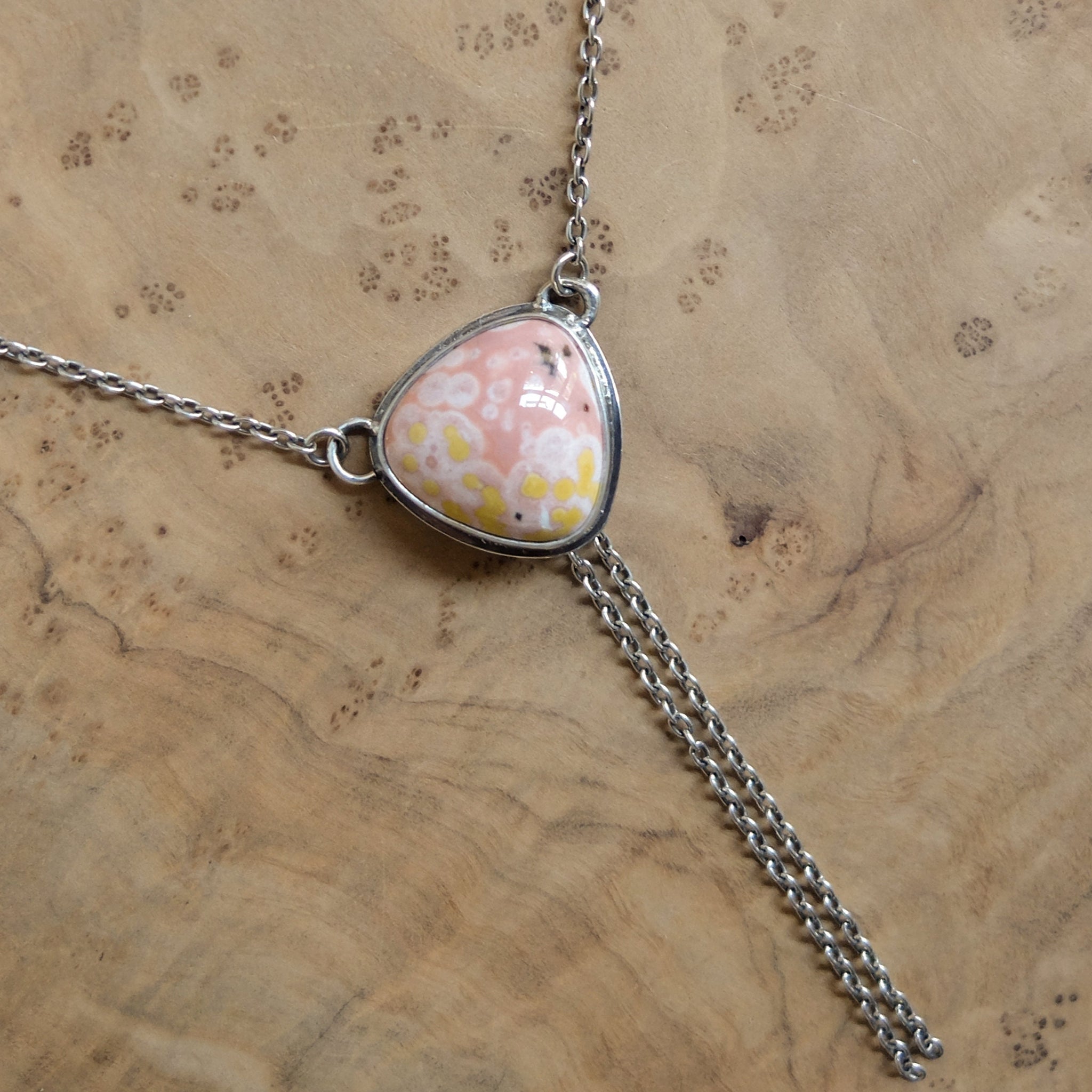 This Natural, Ocean Jasper Y necklace design is a success in so many ways. We love the traditional Western bolo tie, but we wanted a more feminine version of it. We've used traditional southwestern silversmithing using oxidized, sanded and polished .925 Sterling Silver. This necklace closes in the back with a clasp like any necklace and uses a dainty yet sturdy, .925 Sterling Silver cable chain. An LBJ original! The Ocean Jasper Mock Bolo features a .925 Sterling Silver Lobster Clasp.