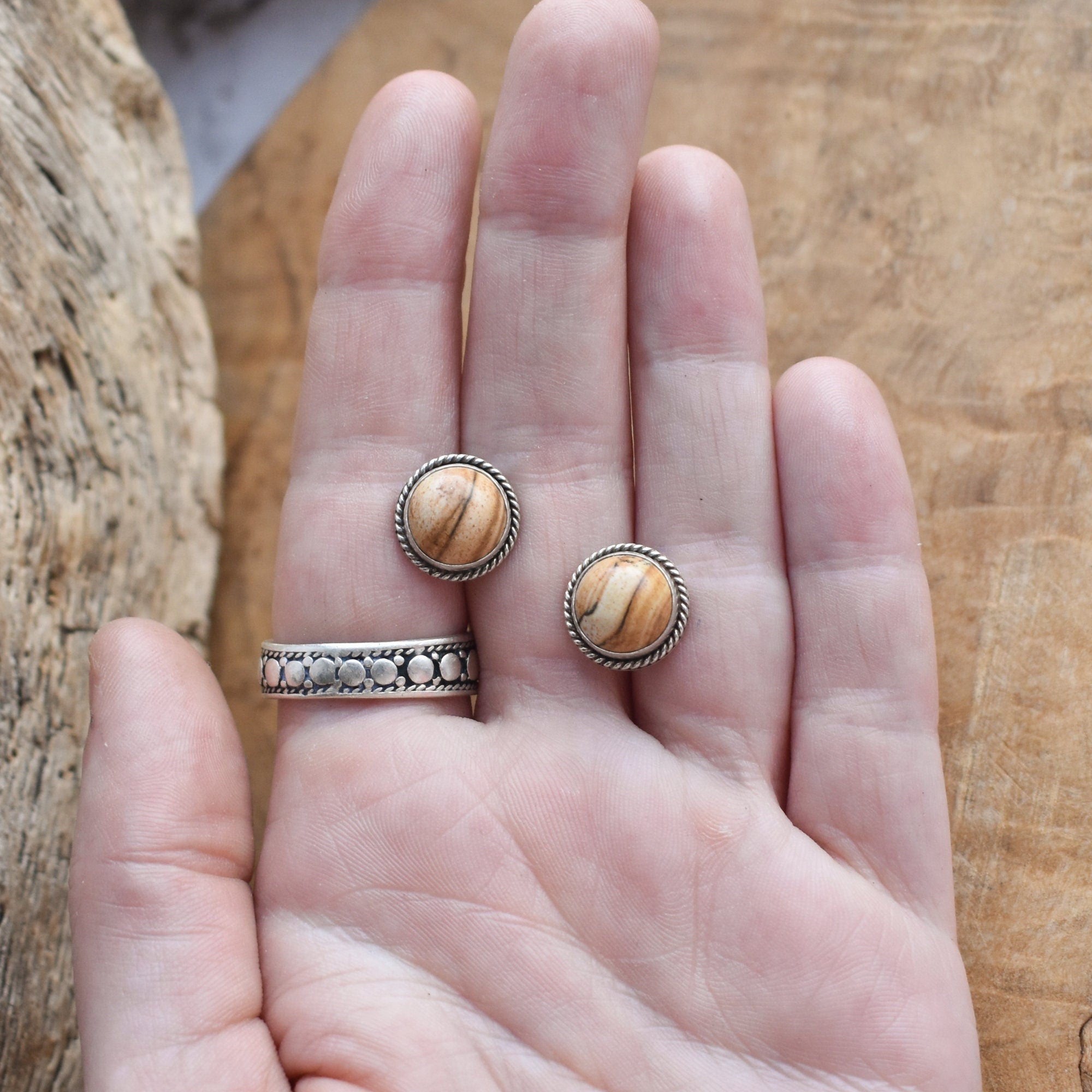 Everybody loves the warmth of Picture Jasper and this bunch is gorgeous, full of natural markings. Kind of what you think of when you say jasper. These Traditional Picture Jasper Posts earrings are practically perfect! Silversmith Earrings in Picture Jasper - 10mm, highlighted by a twist wire and .925 oxidized sterling silver. They are classic and modern ... with just a little texture and interest. All traditional silversmithing is done in my Baltimore, MD studio.