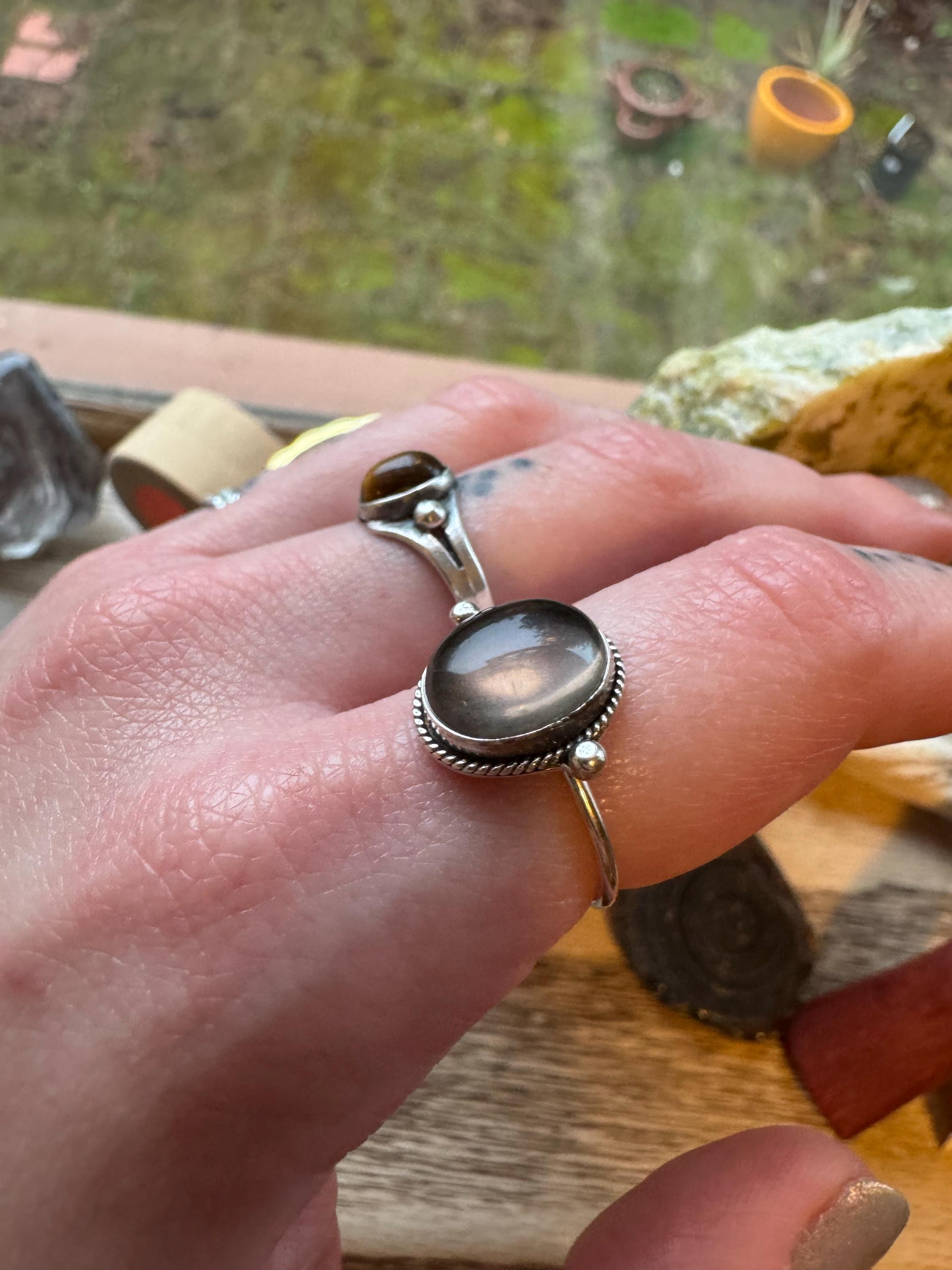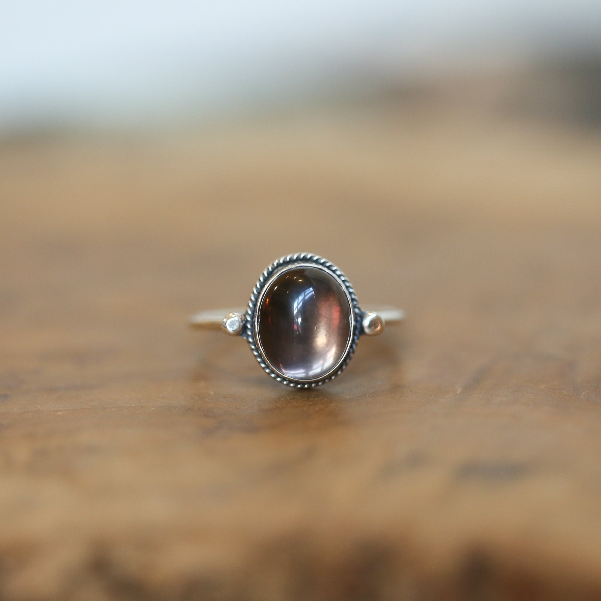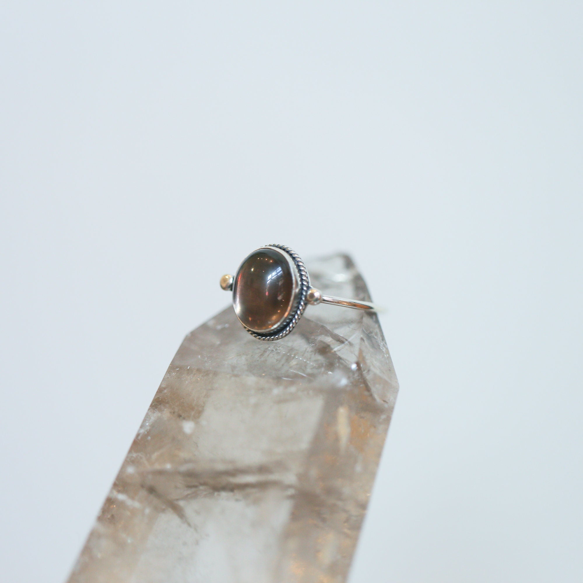 Sometimes you want to gaze down at your ring and see perfect balance and grace. That's what this Dainty Smoky Quartz Delica Ring has to offer. High-grade smoky quartz stone with a simple, sterling silver design. Perfect little ring. Lovely, traditional, dainty ring of 10X12 mm Smoky quartz cabochon set in .925 sterling silver oxidized and burnished bezel and wire. Simple, elegant and perfect. This lovely, translucent, and sparkling warm, taupe grey-colored ring is created using traditional silversmithing techniques in my Baltimore, MD studio.