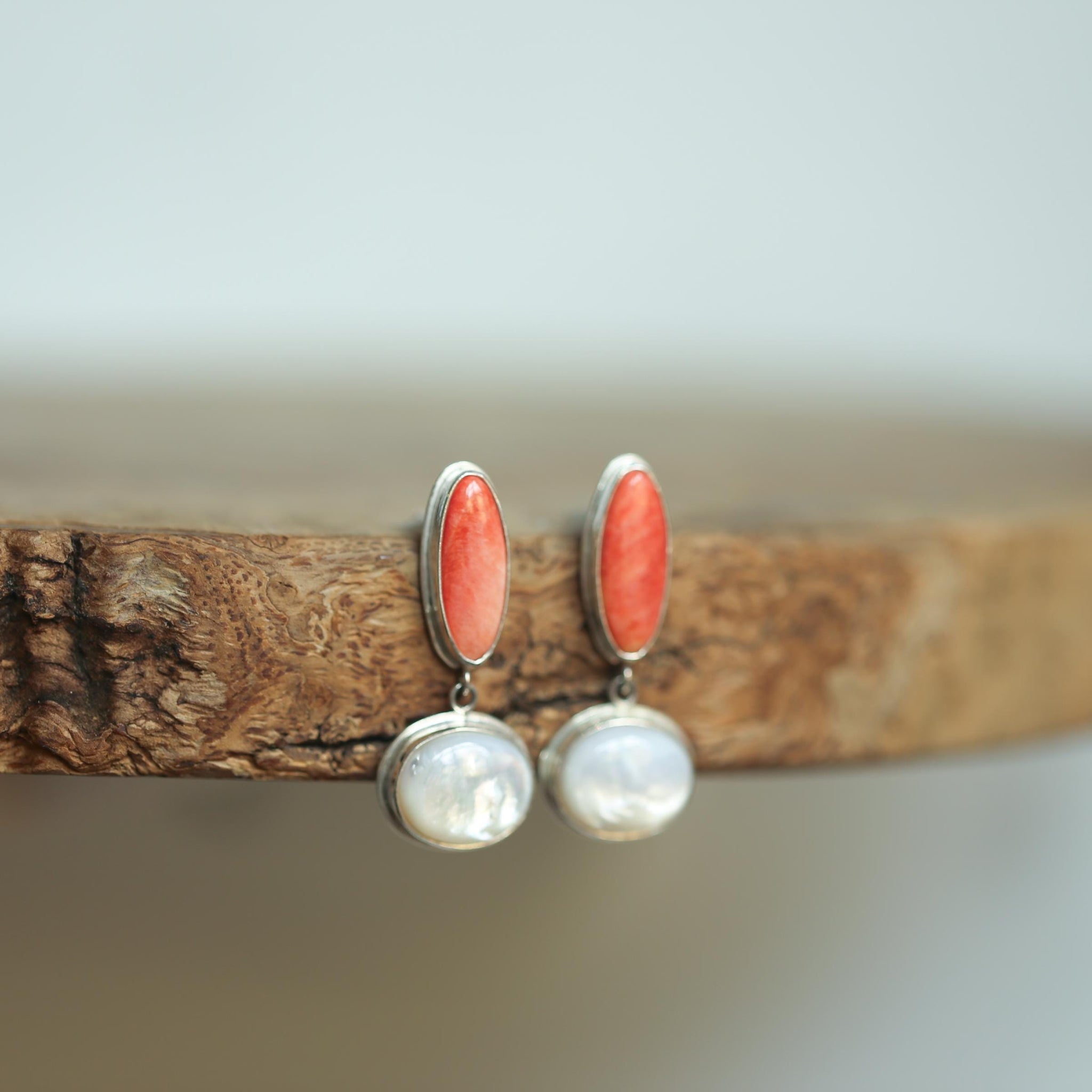 We love the post-drop design at LBJ. Here, the top posts are substantial and come with a large, snug, no-droop, silicone back, and our standard titanium clutch backs. Spiny Oyster Shell offers a beautiful pop of red-orange color. The free-swinging bottoms are natural, unique, Mother of Pearl ovals, milky and glowing like a pearl that's been poured into the bezel. Traditional silversmithing is done in our Baltimore, MD studio.