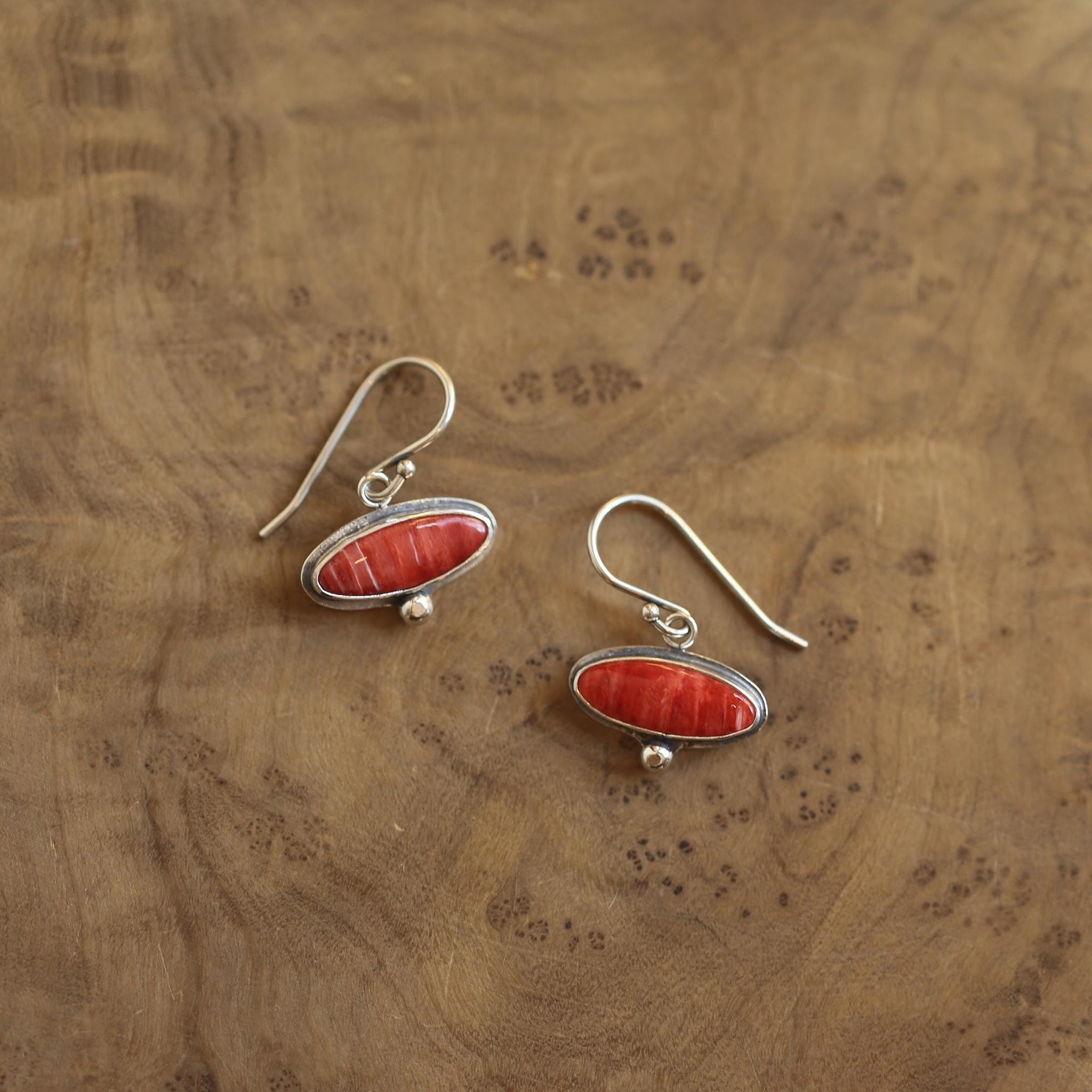 These are just the perfect, easy to wear, orange, spiny oyster drop earrings. Just that perfect pop of red/orange you want! Modern and traditional at the same time! Minimal embellishments except for the silver beads centering ther bottom of the red/orange, spiny oyster east west oval - just enough to add mystique to these poppy red Spiny Oyster Shell. All .925 Sterling Silver - oxidized, sanded, and burnished to the perfect finish. Easy on and squeeze although they will come with a rubber stopper.