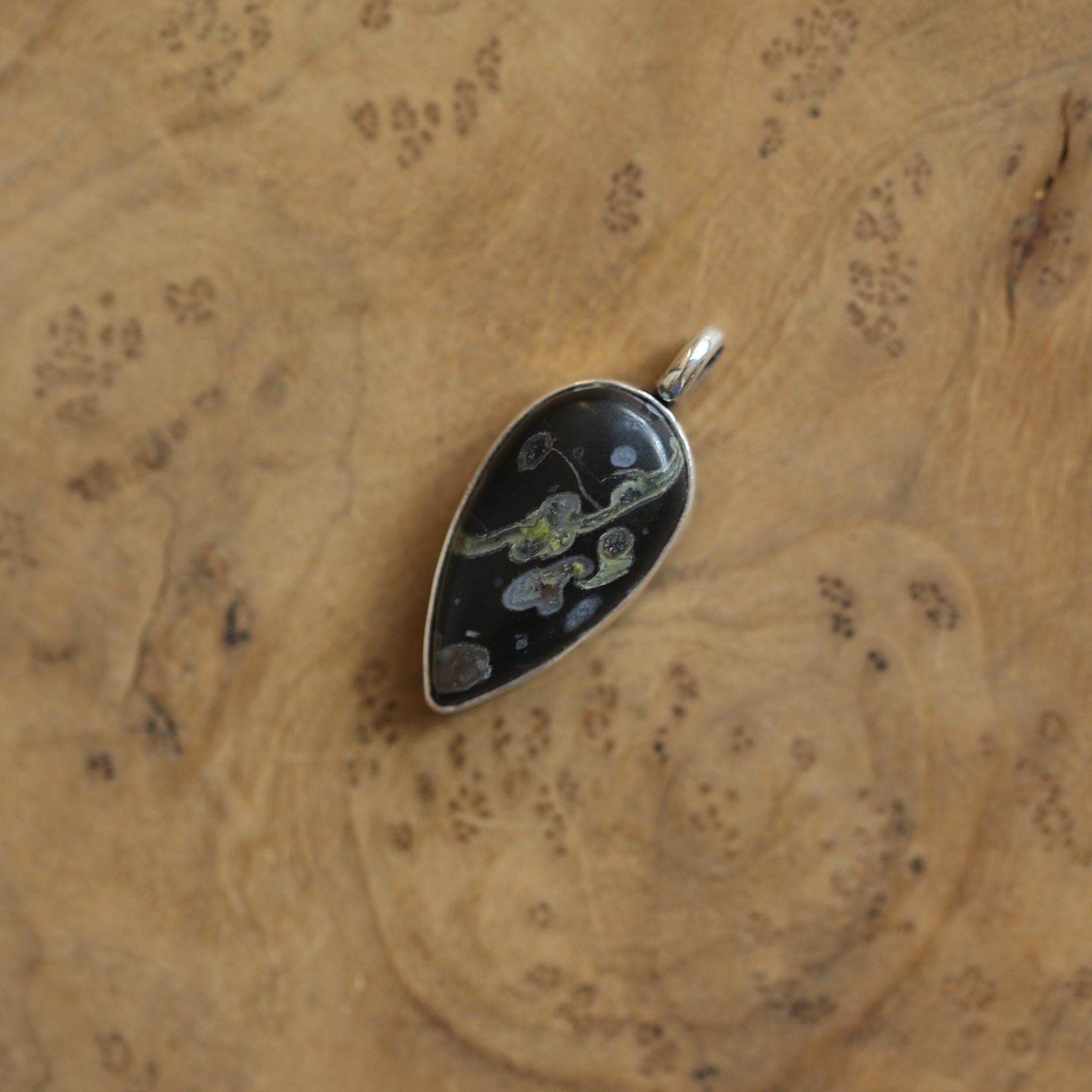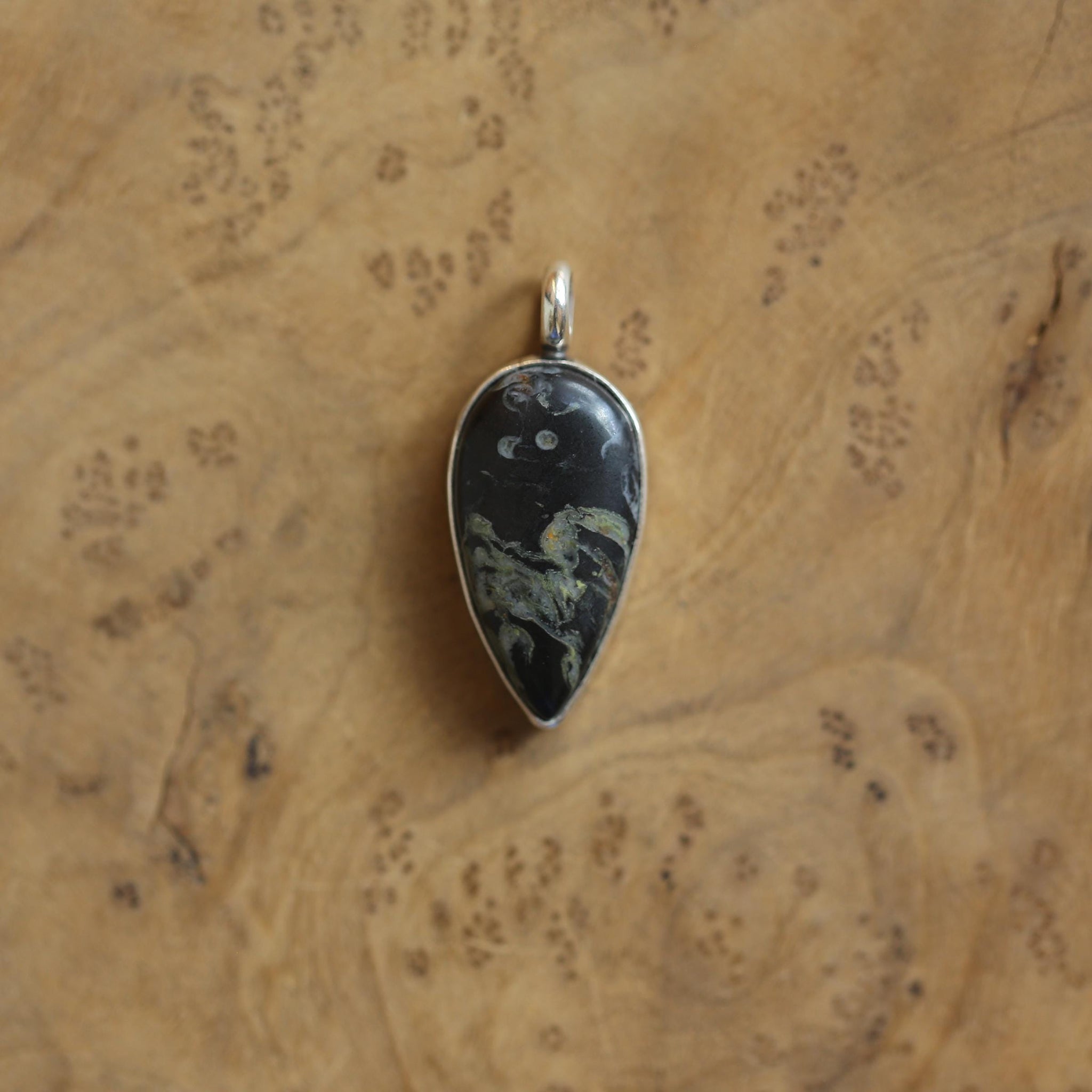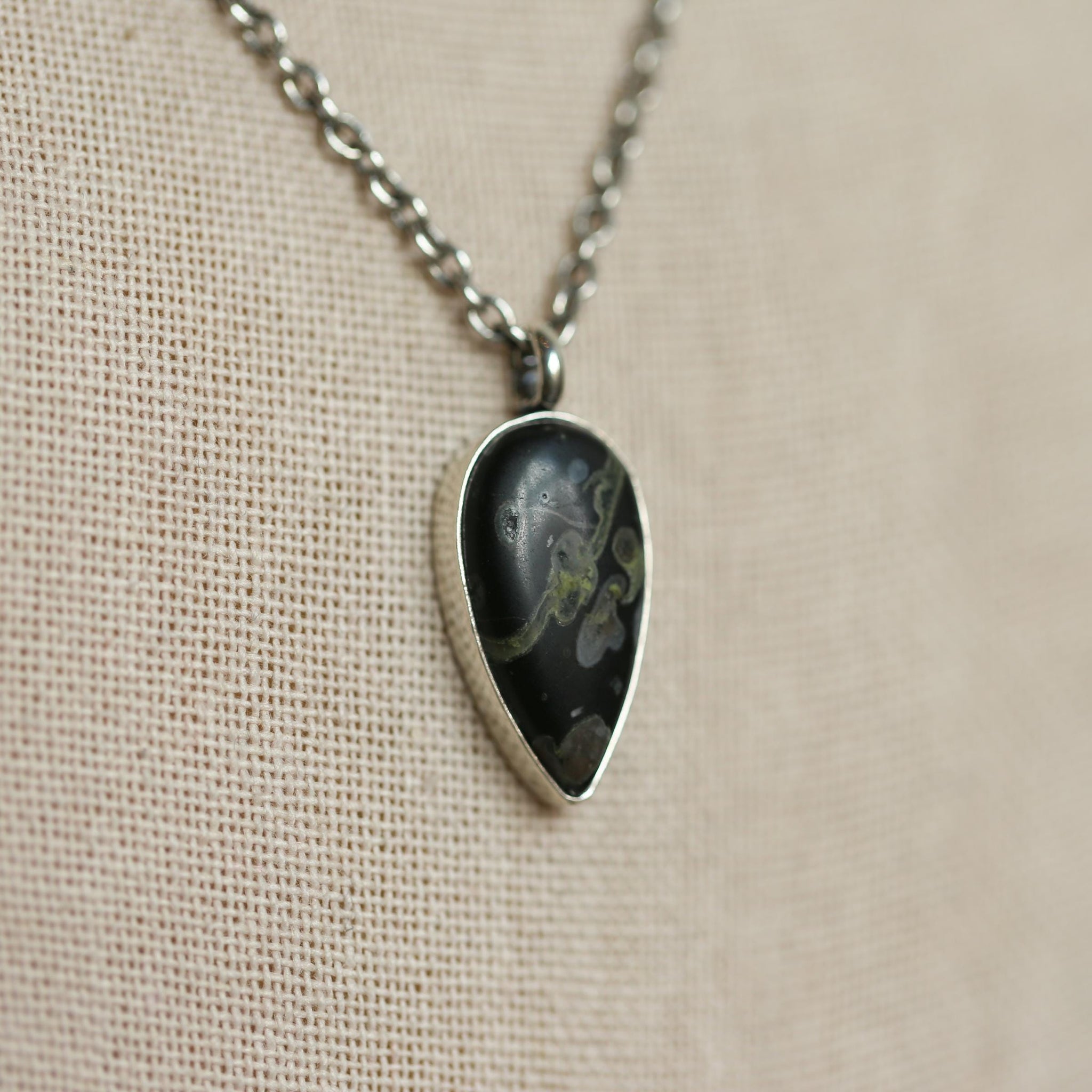 The Fossil Jasper Pendant is shown with an optional Sterling Silver chain (16-18 inches.)