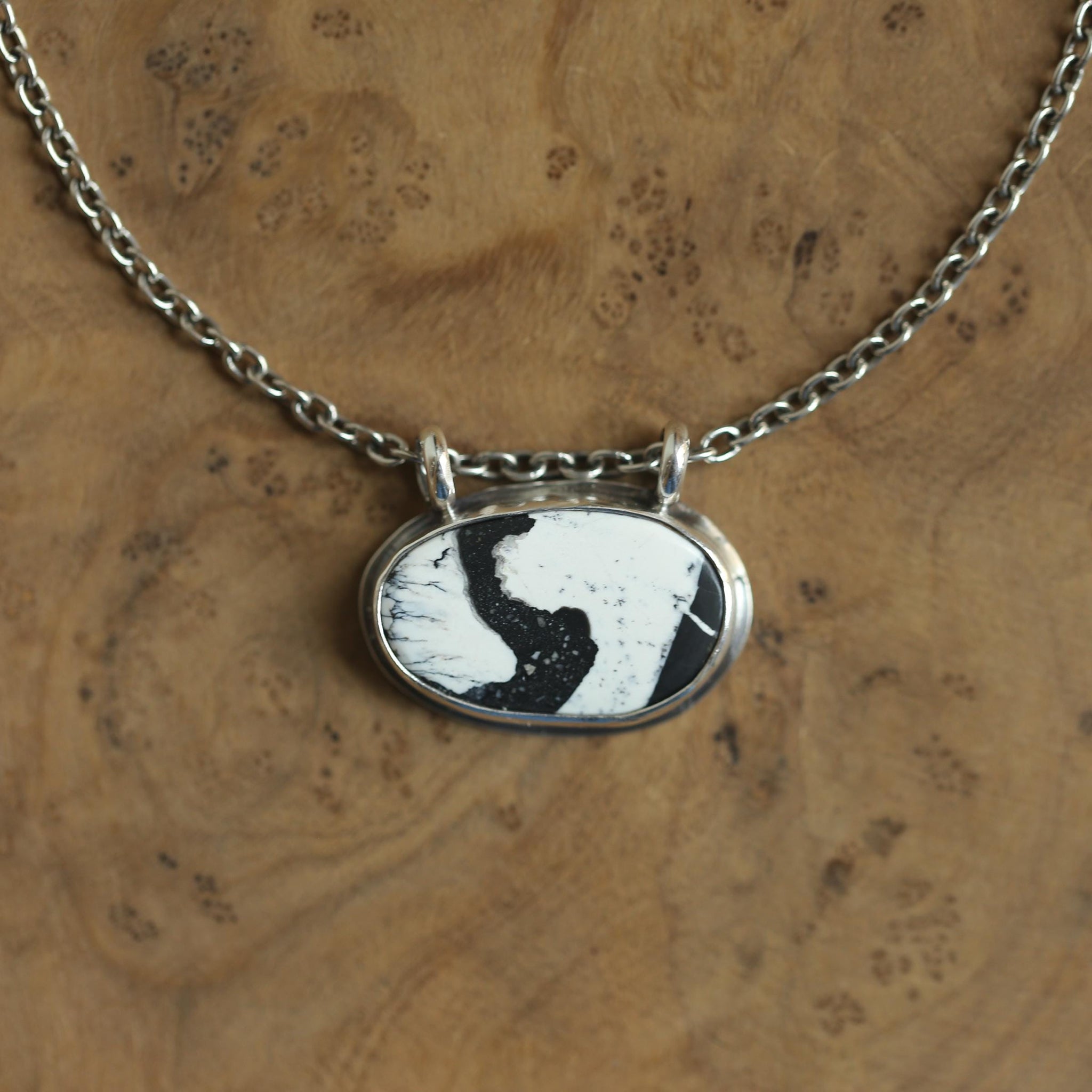 A true minimal design that allows the stone to be the one and only! The original mounting of the double bails along the top of the pendant allows you to move it freely while the specially chosen, substantial, sterling silver chain closes between 16 and 18 inches. Chain is optional.