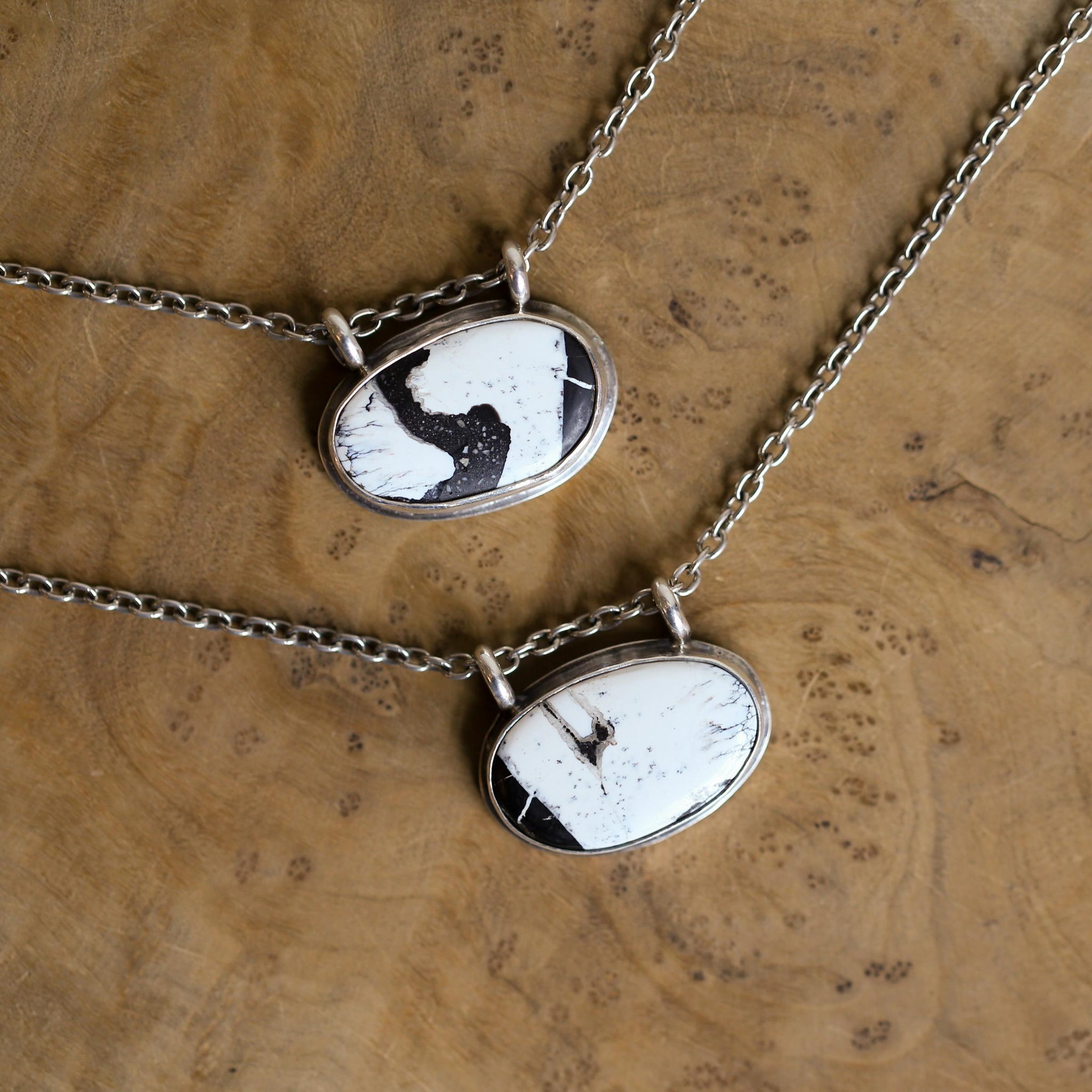 This listing is for ONE White Buffalo hanging rock pendant - you choose from the 2, finished, White Buffalo pendants in the photos. Your choice will be highlighted in the photo as you choose. (for reference - Stone A top in group photo, Stone B bottom) .925 Sterling Silver Chain, optional. Choose 0 for no chain. Both of these are stunning and unique - good luck choosing!