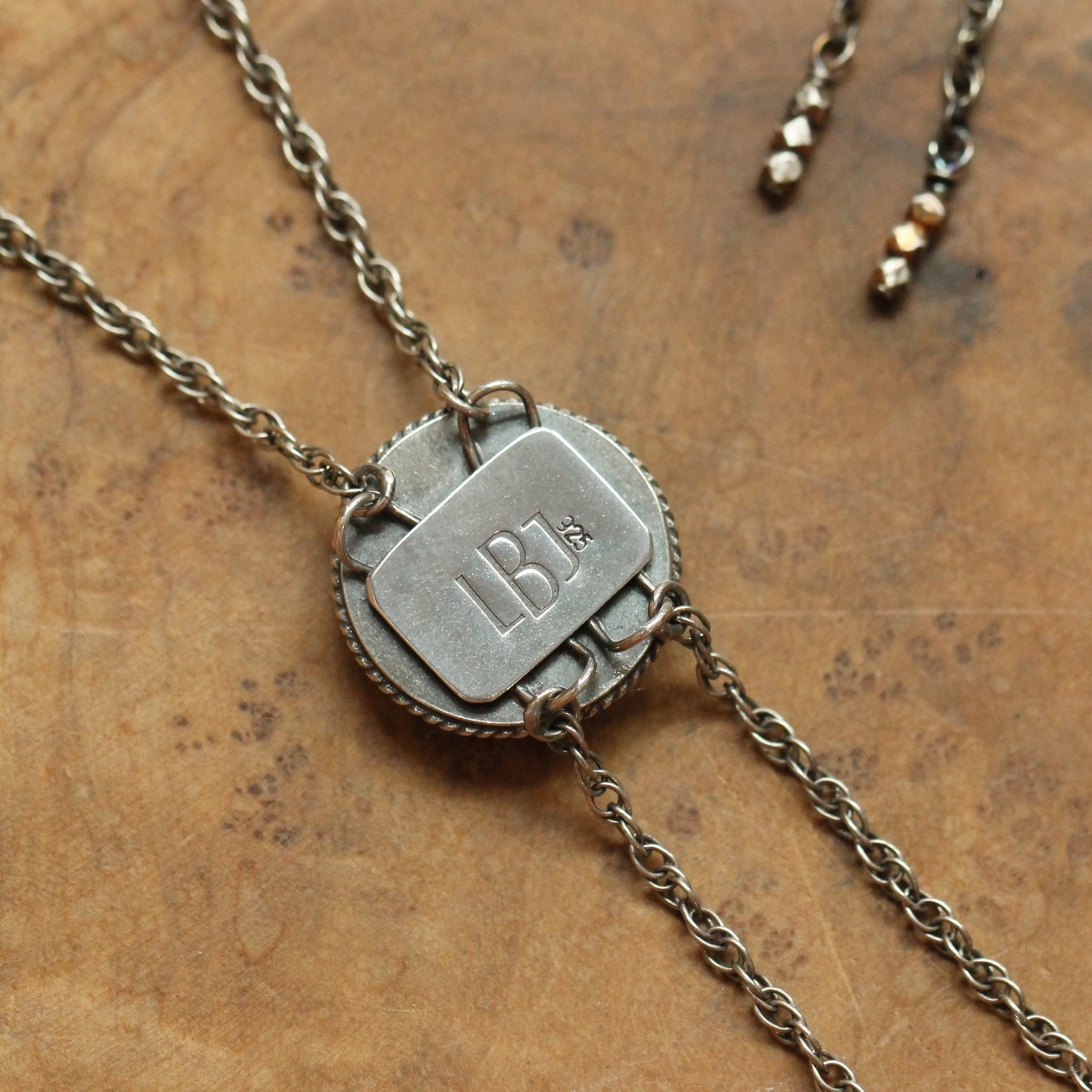 This design is a success in so many ways. We love the traditional western bolo tie, but we wanted a more feminine version of it. We've used traditional southwestern silversmithing using .925 twist wire accents - oxidized, sanded, and polished. This necklace closes in the back with a clasp like any necklace and uses an ultra-comfortable .925 Sterling Silver rope chain - the sterling silver chain "tips" are an added bonus, and really add a lot. An LBJ original!