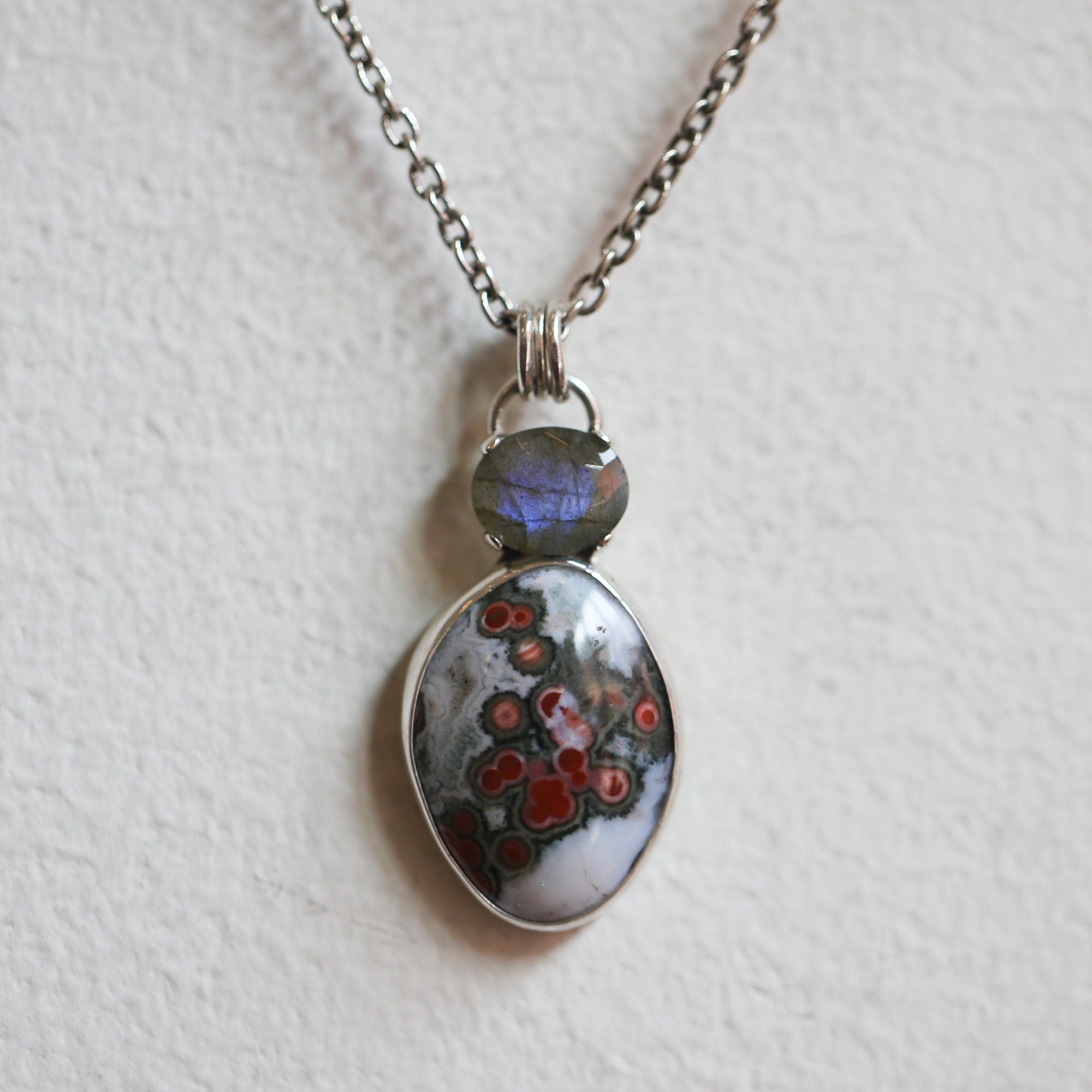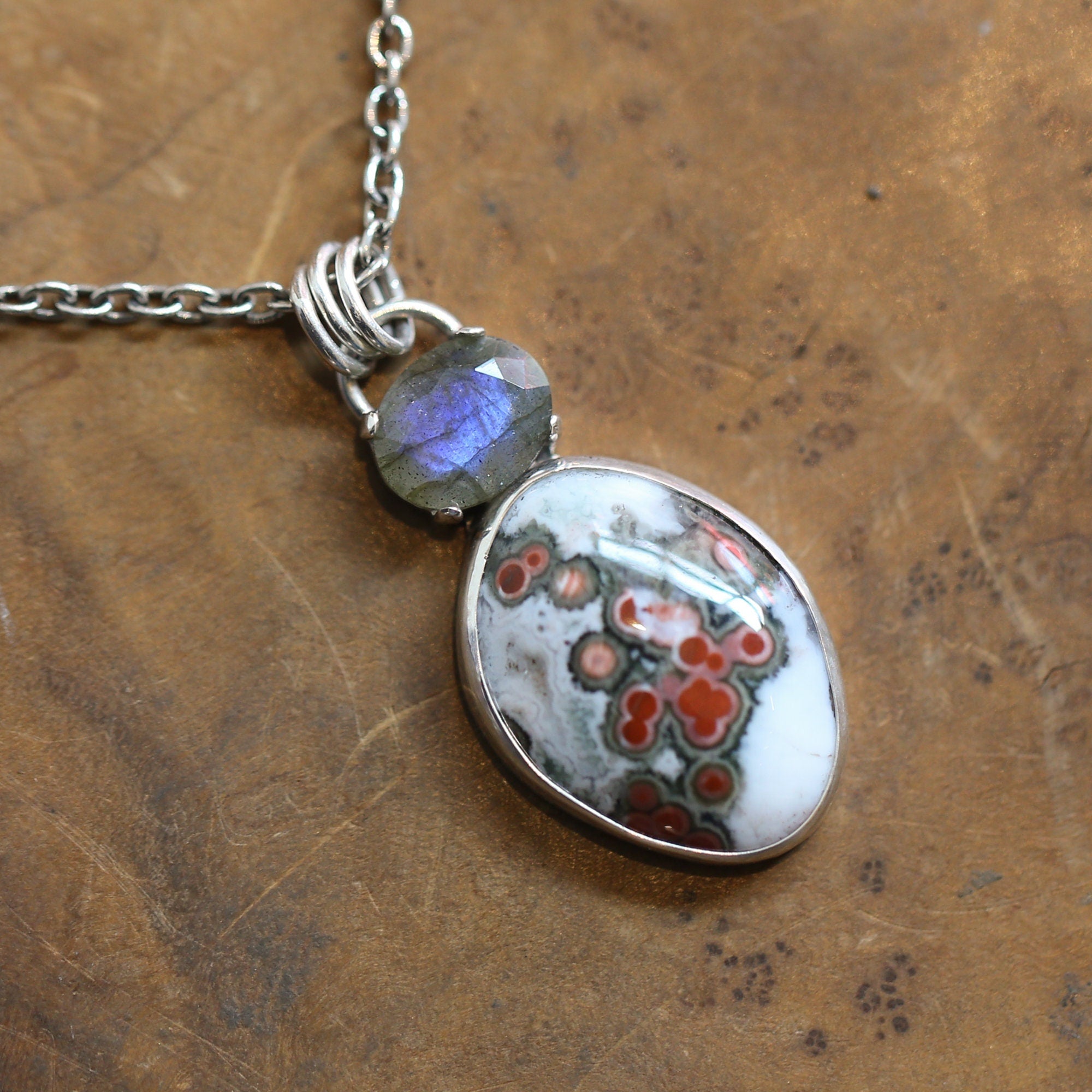 This is a beautiful, two-stone, sterling silver, statement pendant. Choose your Ocean Jasper focal from the drop down for your new, favorite, made to order, power pendant. Each Ocean Jasper is chosen to work in this design with the flashy, faceted, prong set Labradorite. The stunning selection of Ocean Jasper cabochons in this Choose Your Stone listing will knock your socks off. Your Ocean Jasper choice will be highlighted in the photo as you choose - we will make your pendant to order - the labradorite will be equally flashy.