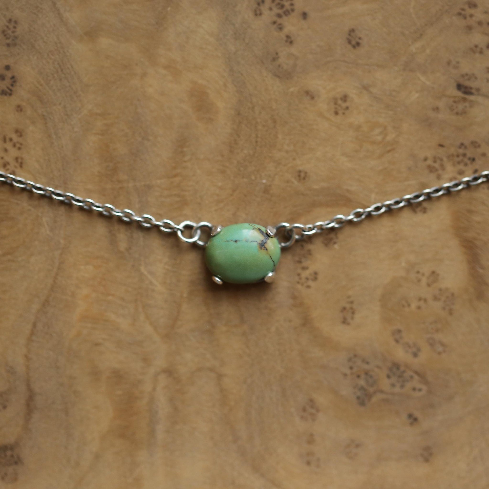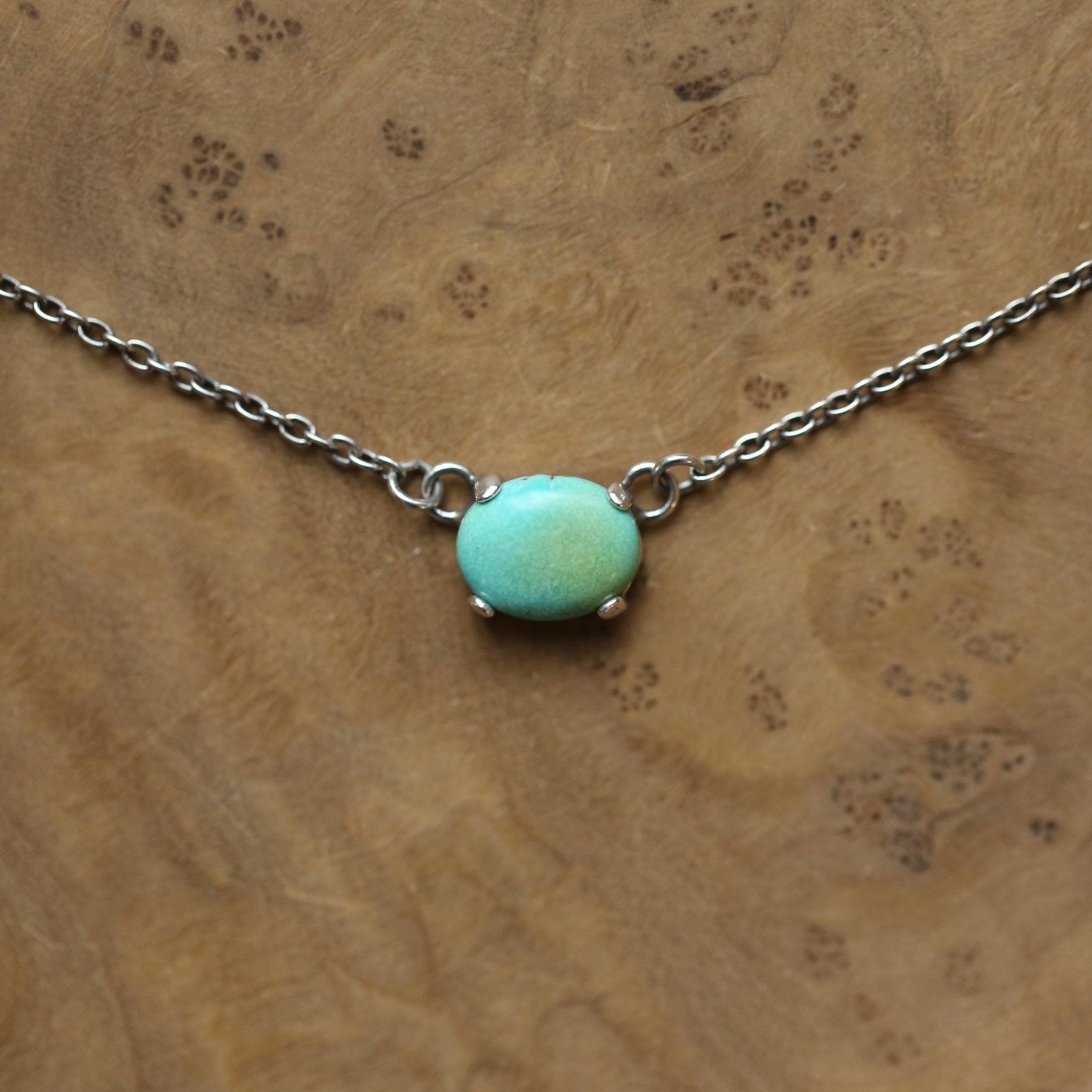 Delicate, dressy and casual at the same time and so easy to wear you may forget you have it on. 8x10 Turquoise set in oxidized and polished, .925 Sterling Silver prong setting from integrated .925 Sterling silver chain (included).