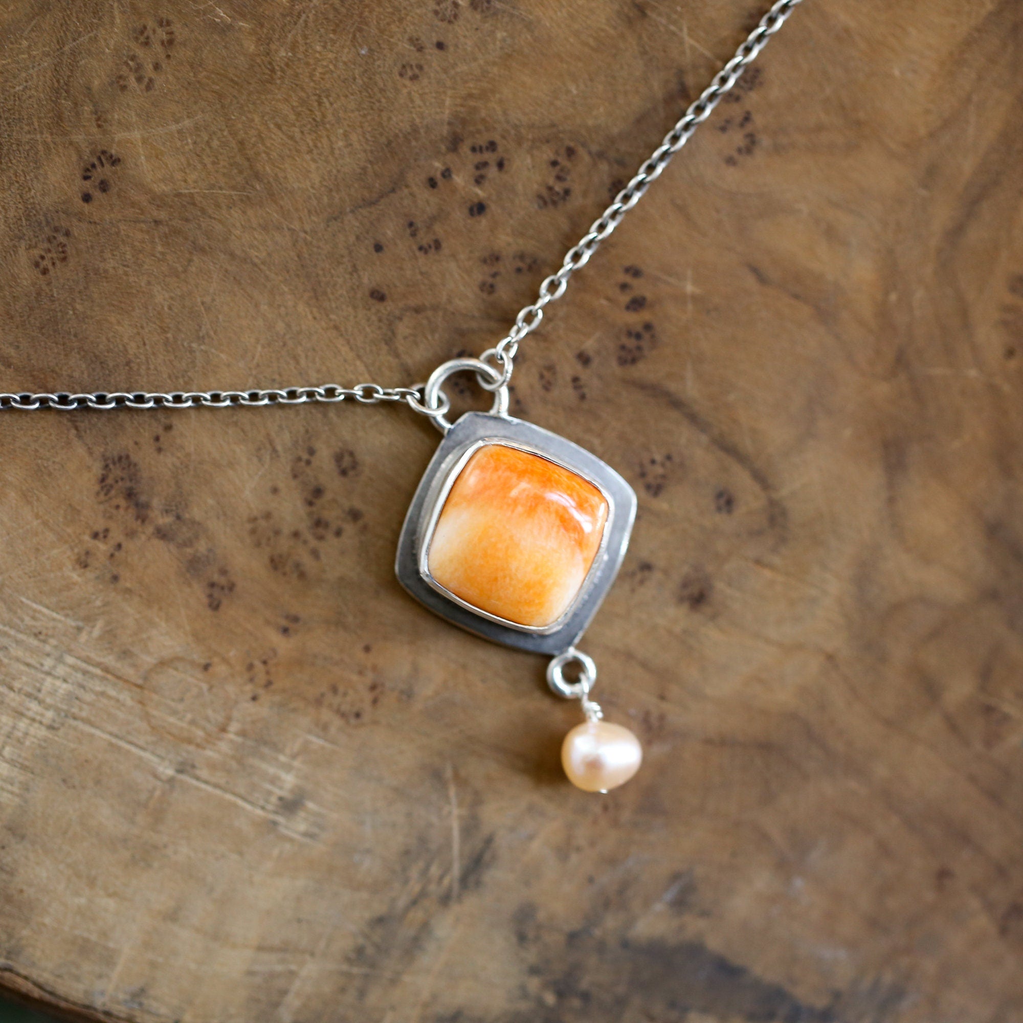 We just love our new Spiny Oyster Dyna Necklace. Gorgeous and unique Salmon/Orange Spiny Oyster Cushion Square Cabochon is set like a diamond in.925 Sterling Silver - paired with a lustrous, freshwater pearl dangle. All .925 Sterling Silver. Pendant/Necklace includes the .925 Sterling Silver chain.