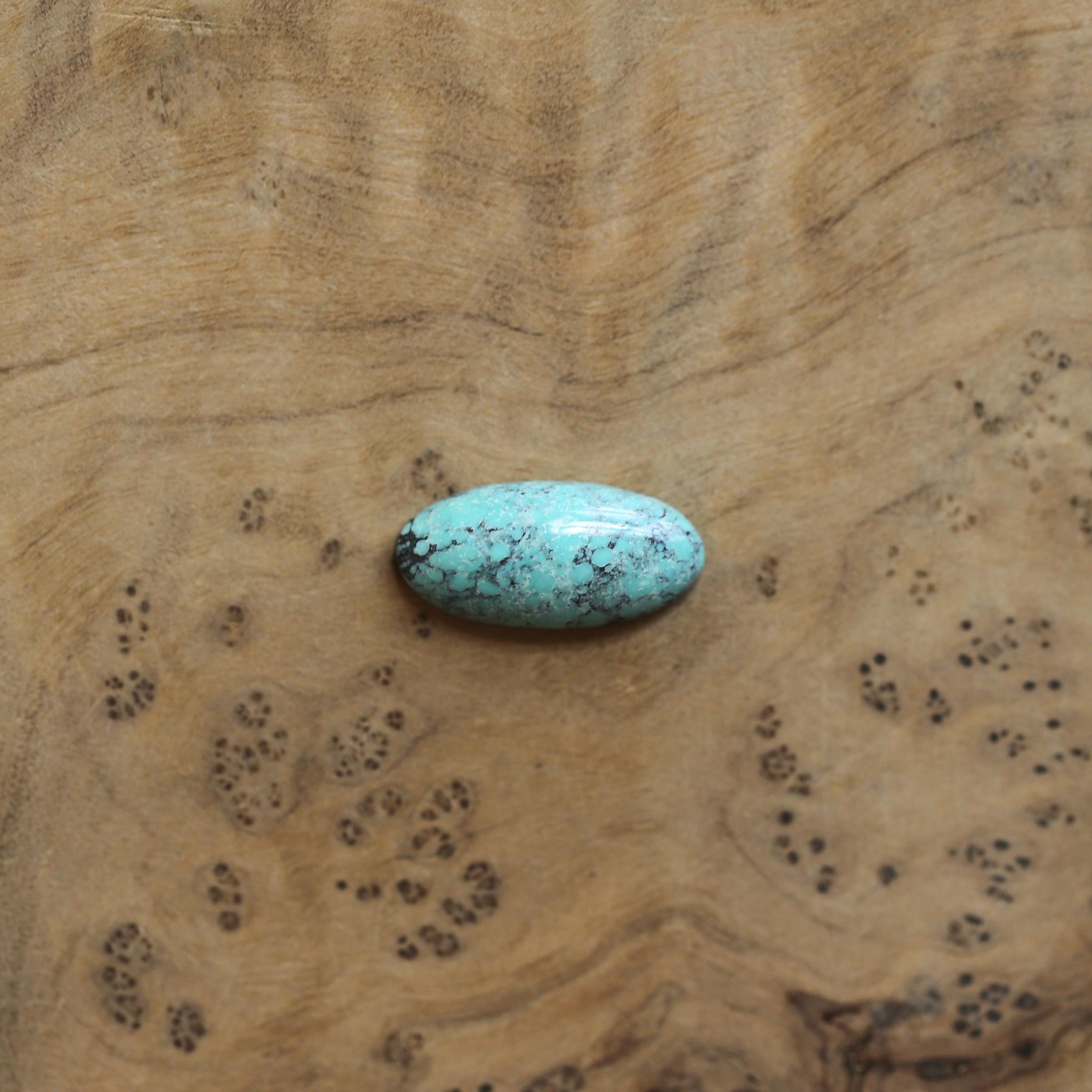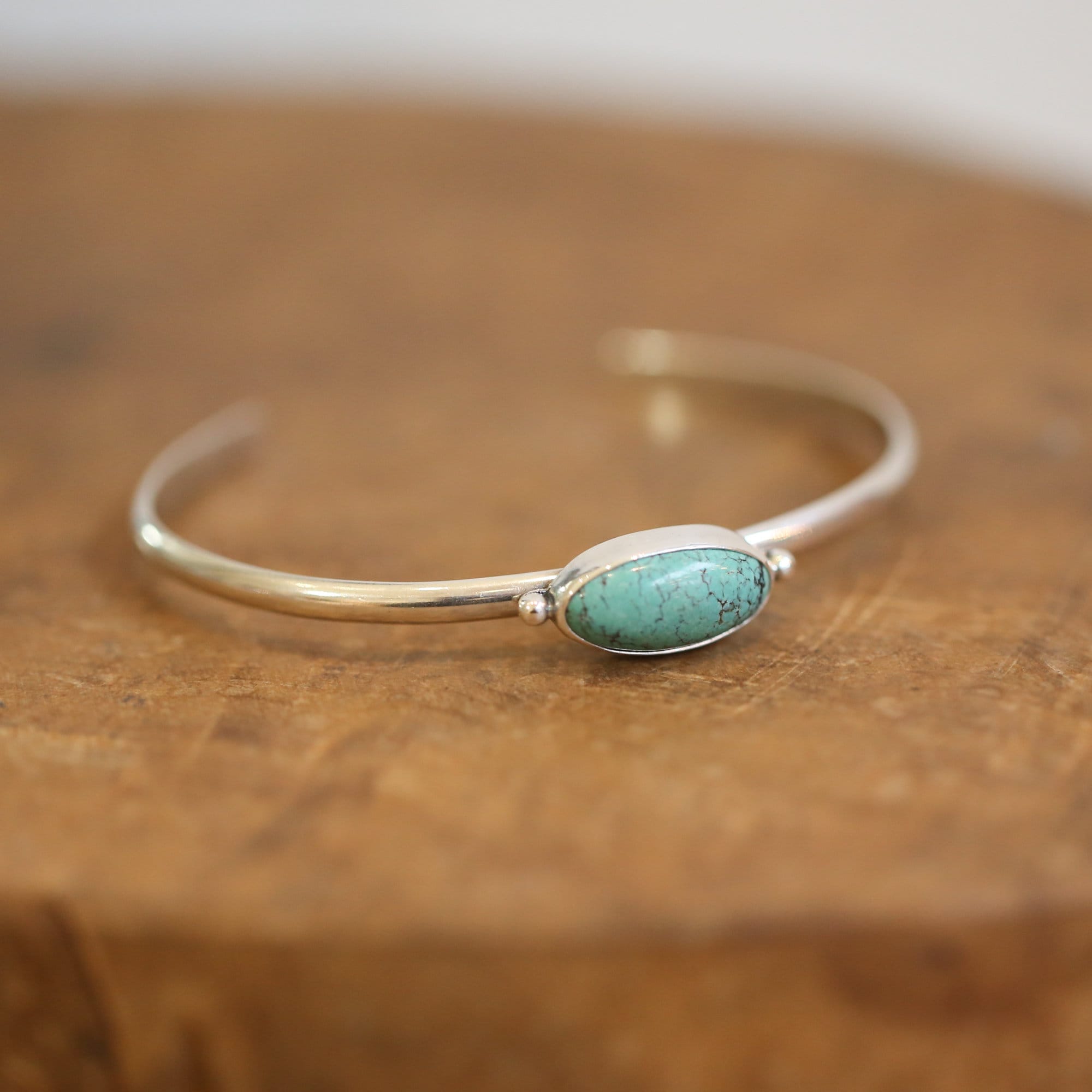 Our LBJ Simple Cuff Bracelet from gorgeous, AAA turquoise with a low-dome half-round wire and two sterling silver bead embellishments to flank the 8X16mm Turquoise oval. Wear alone or stack 'em up! All traditional silversmithing is done in my Baltimore, MD studio.