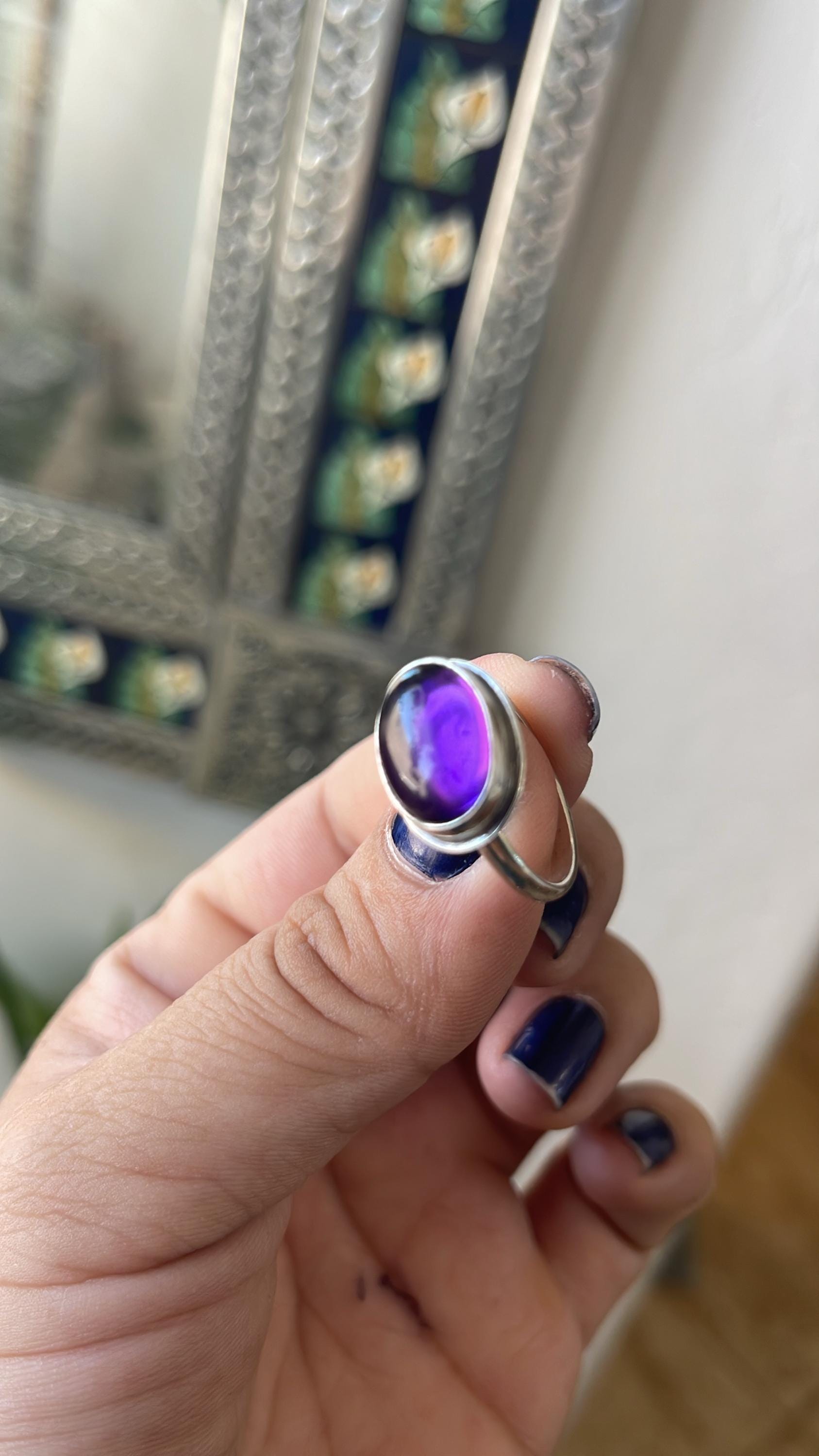 Deep purple, gorgeous AAA Amethyst is absolutely breathtaking here in this minimal, East-West Oval, .925 Sterling Silver Ring. If you love amethyst, the depth of color here is rich. Beautiful, Purple Amethyst is highlighted by the modern sterling silver design. All traditional Silversmithing techniques done in our Baltimore, MD studio