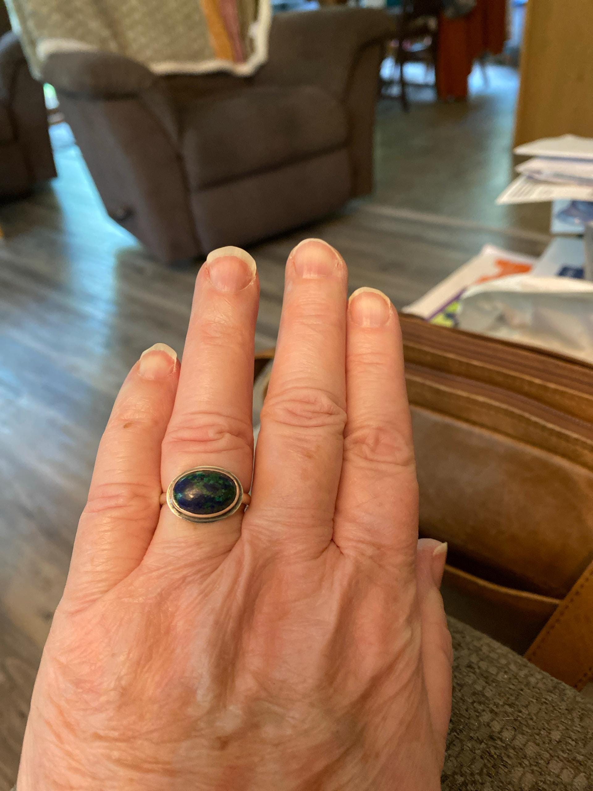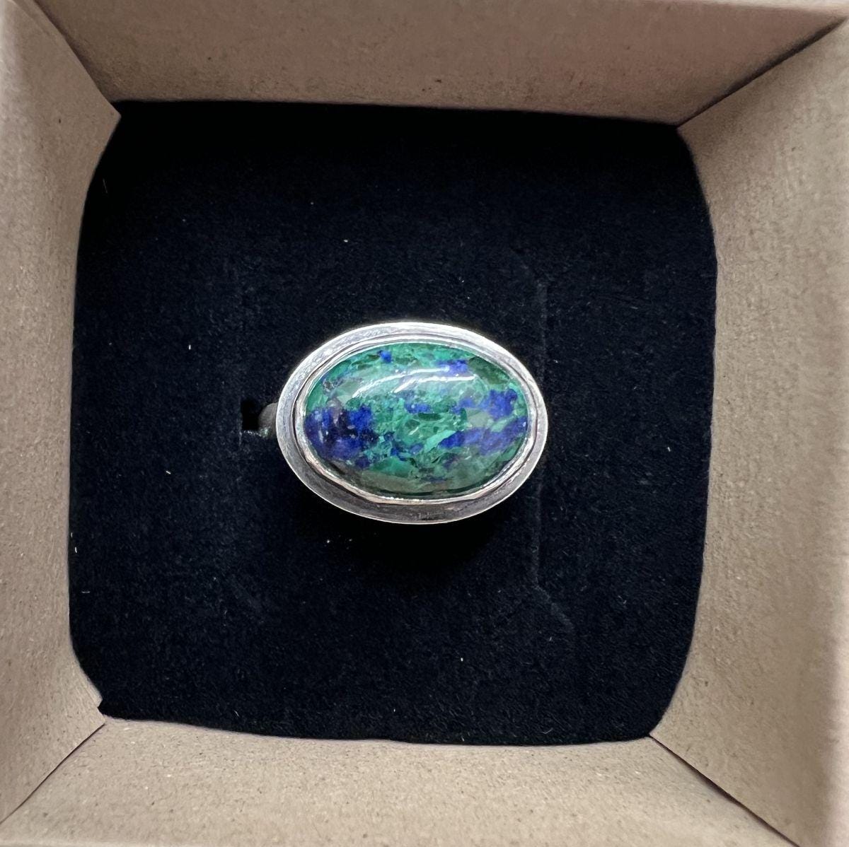 This is the perfect East-West Oval Ring and this Azurite Malachite is so gorgeous, revealing the classic blue of Lapis Lazuli and green of Malachite. The 10X14mm stone rests perfectly in this east west oval configuration. Simple and perfect with just an edge of .925 Sterling Silver. Wear this Azurite Malachite Statement Ring alone or on a hand full of rings. All traditional Silversmithing is done in my Baltimore MD studio.