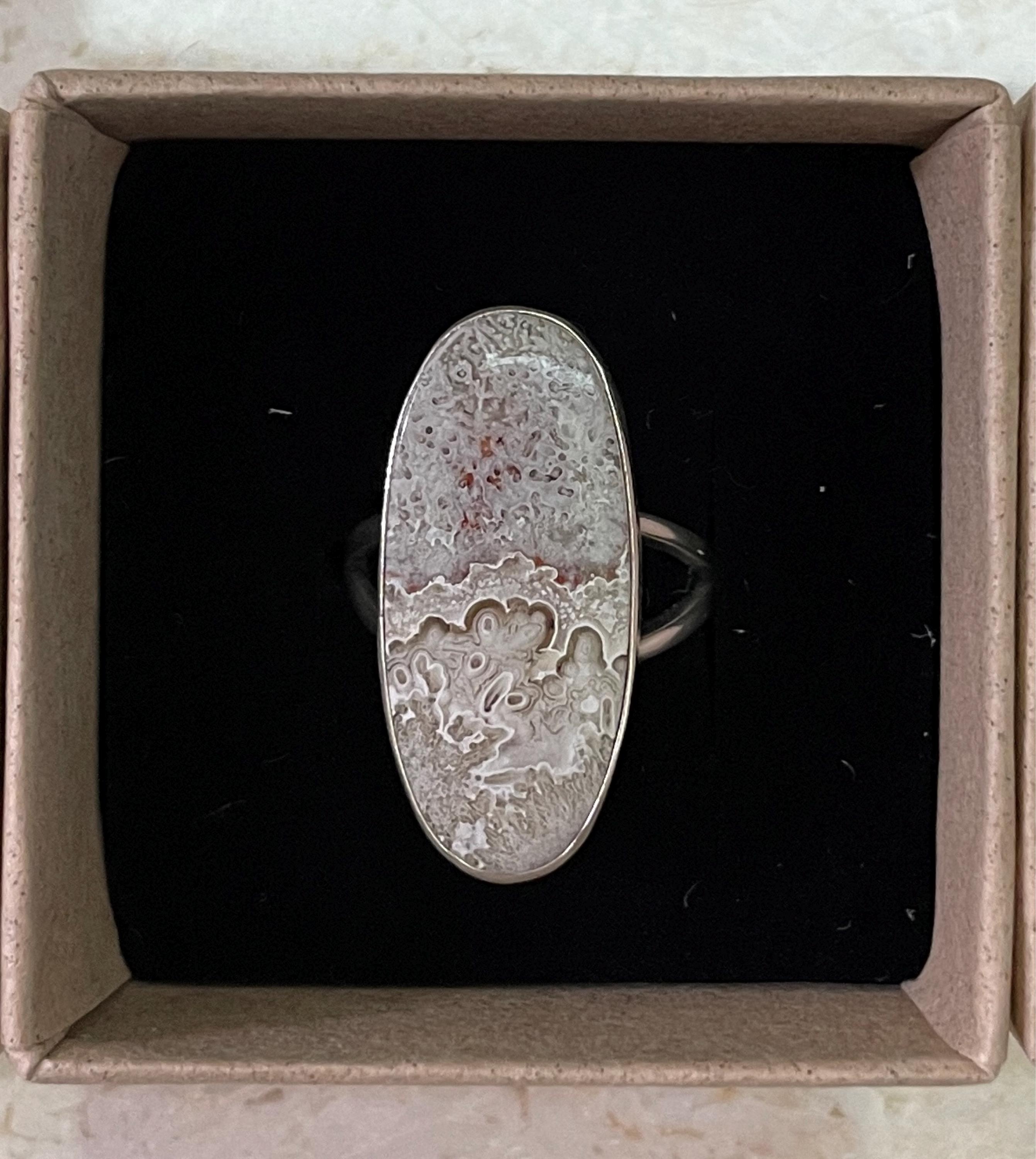 Our minimal Crazy Lace Agate and Sterling Silver ring is stunning. The simple setting is perfect for these magnificent and unique Crazy Lace Agate Stones - and these beautiful, crazy lace agate stones are GORGEOUS! Choose your own Stone from the drop-down below - it will be highlighted in the photo. Simple, "less is more" silversmithing is enough in this modern sterling silver design. Split Shank for comfort. Beautiful .925 Sterling Silver Crazy Lace Agate Ring. All traditional silversmithing is done in my Baltimore, MD studio.