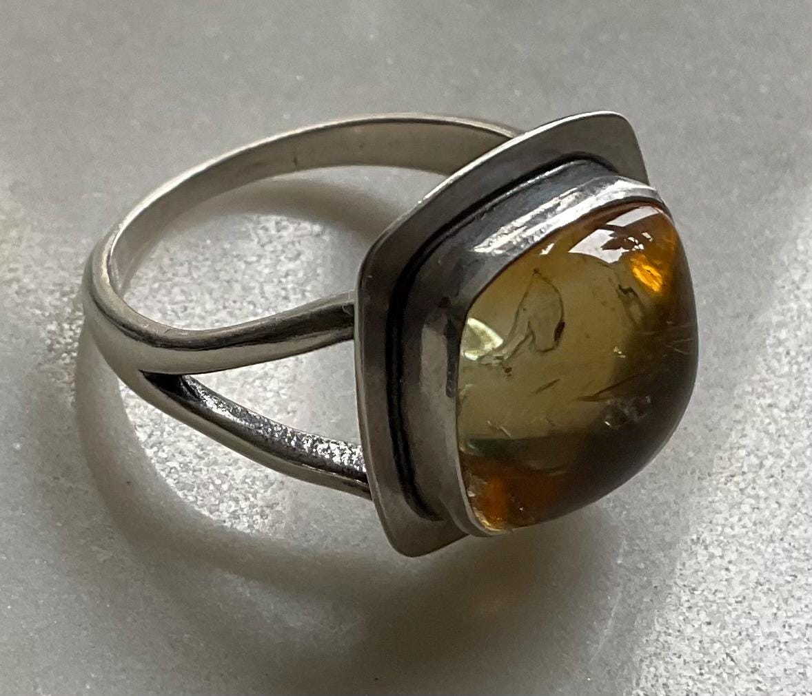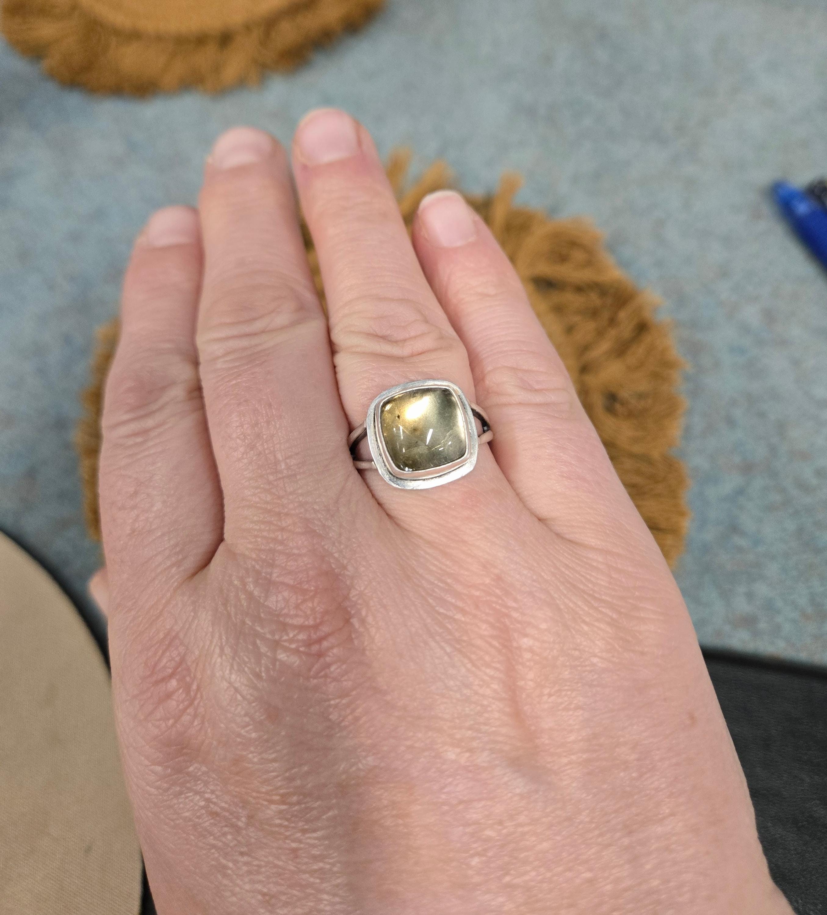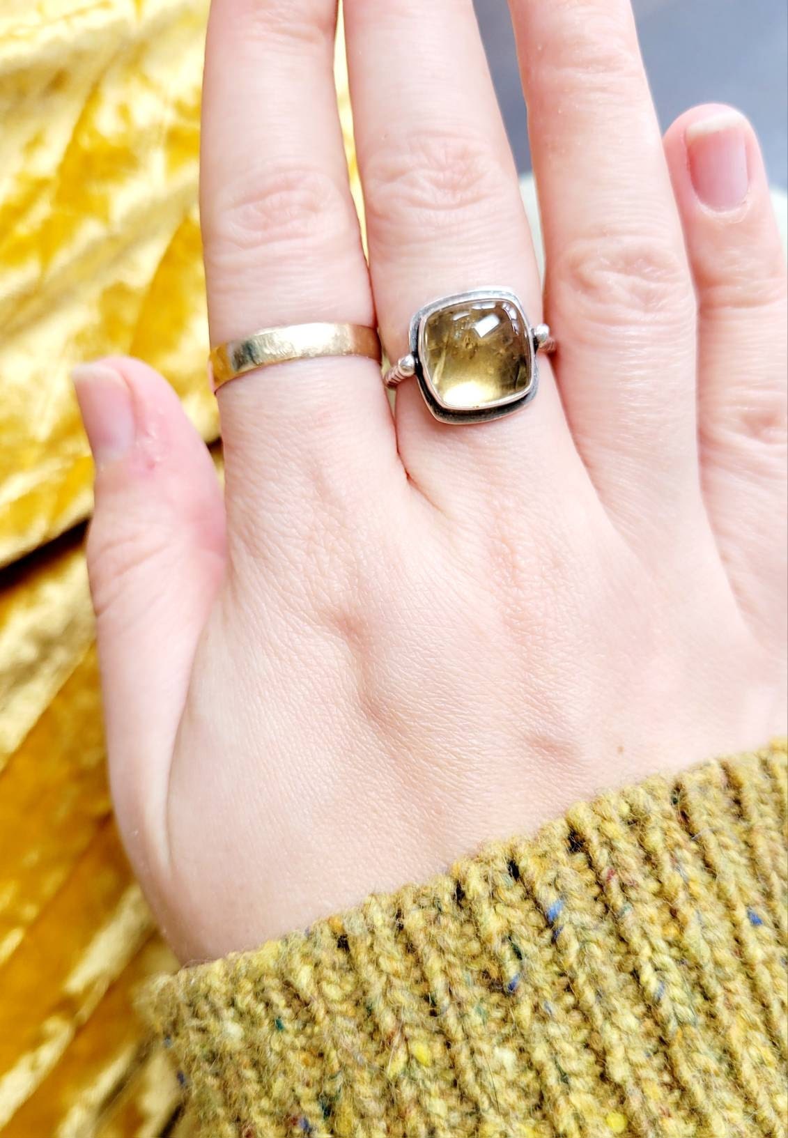 Wear it alone or as a centerpiece to a hand of rings - the square is such a strong shape, and is perfectly enhanced here in this .925 Sterling Silver, Citrine Ring. This bright Citrine ring is perfectly unisex, with a minimal, .925 Sterling Silver Split Shank and Gorgeous Yellow Citrine centerpiece cabochon.