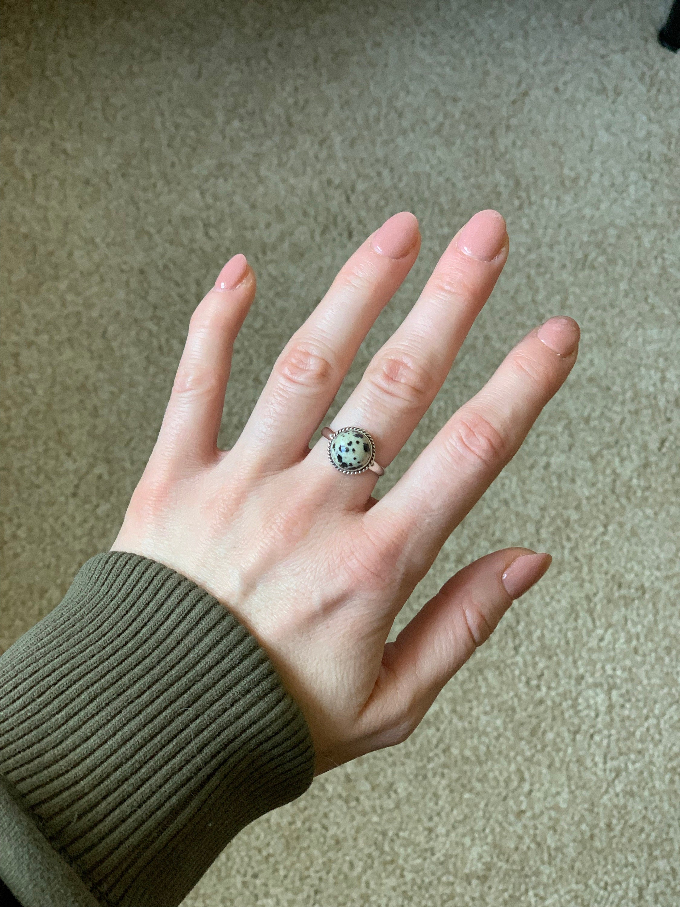 Everybody loves this Dalmation Jasper ring. Dalmation Jasper is a natural Black and White spotted jasper - super fun and names itself! Our Pop Rock Ring lets thee 10mm Dalmation Jasper be the center of the show! Just right - easy to wear. Enhanced with a simple twist wire, this Dalmation Jasper Ring stands alone or is a fantastic addition to a handful of rings. All .925 Sterling Silver. Choose your size in the drop-down below. All traditional silversmithing is done in our Baltimore Studio.