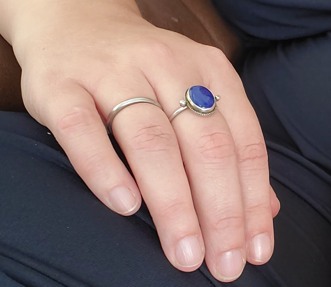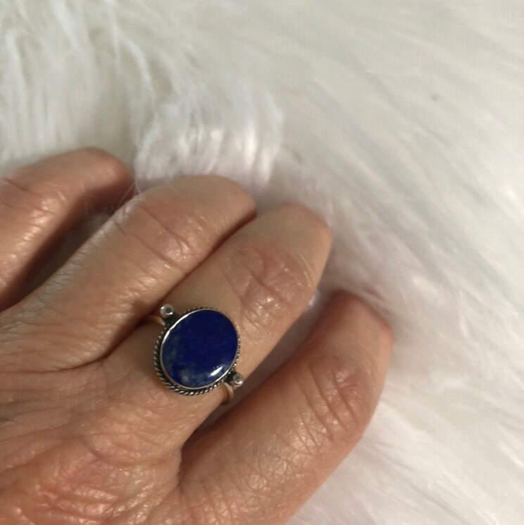 Sometimes you want to gaze down at your ring and see perfect balance and grace. That's what the Delica Dainty Ring has to offer. High- grade semi-precious stone with a simple, sterling silver design. Perfect little ring. Lovely, traditional, dainty ring of 10 x 12mm Lapis Lazuli cabochon set in .925 sterling silver oxidized and burnished bezel and wire. Simple, elegant and perfect. This lovely little ring is created using traditional silversmithing techniques in my Baltimore, MD studio.