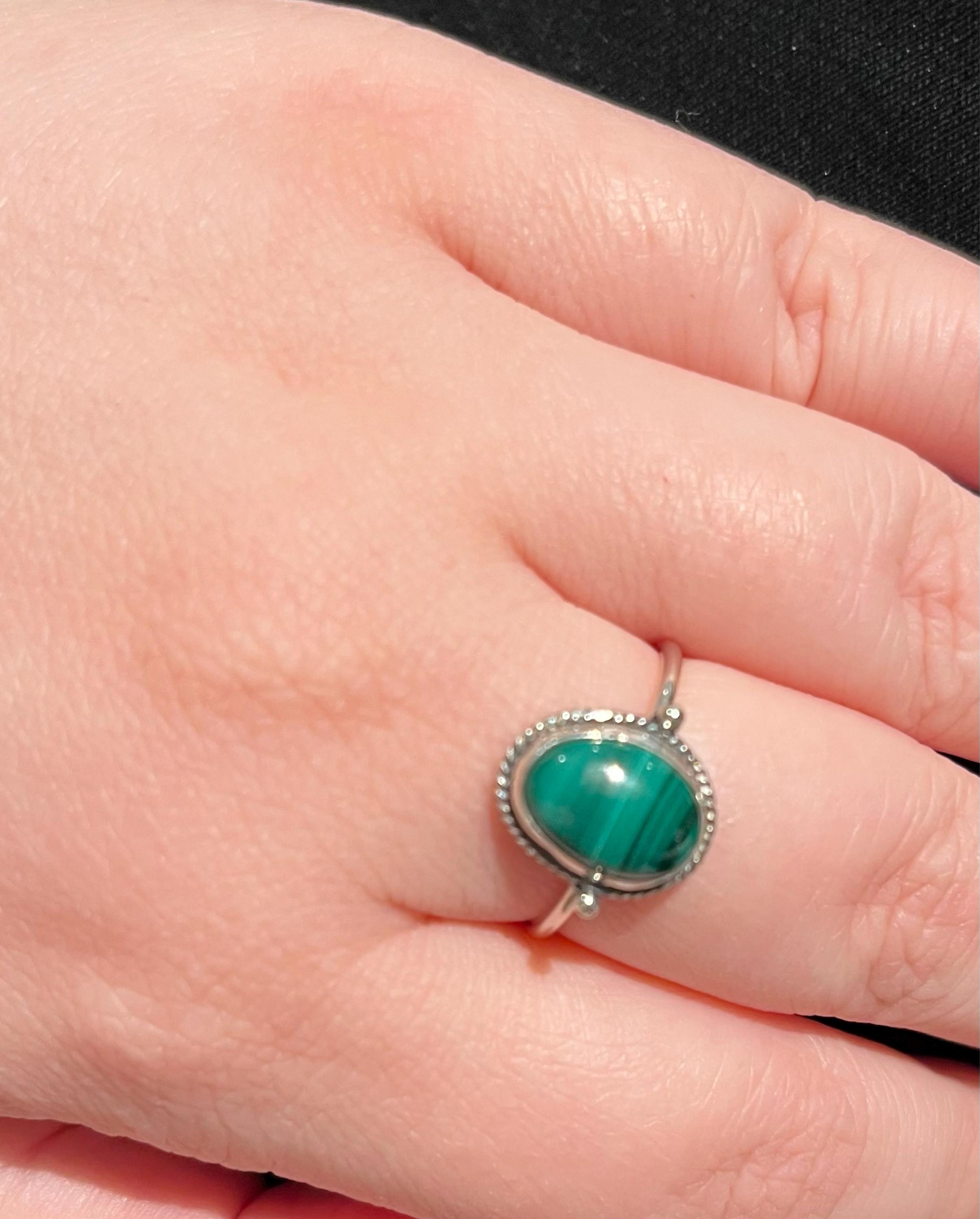 The Delica Ring offers a high grade semi-precious stone with a simple, sterling silver design. Perfect little ring. Lovely, traditional, dainty ring of slightly irregular 7X9 mm Malachite cabochon set in .925 sterling silver - ozidized and burnished bezel and wire. Simple, elegant and perfect. This lovely little ring is created using traditional silversmithing techniques in my Baltimore, MD studio.