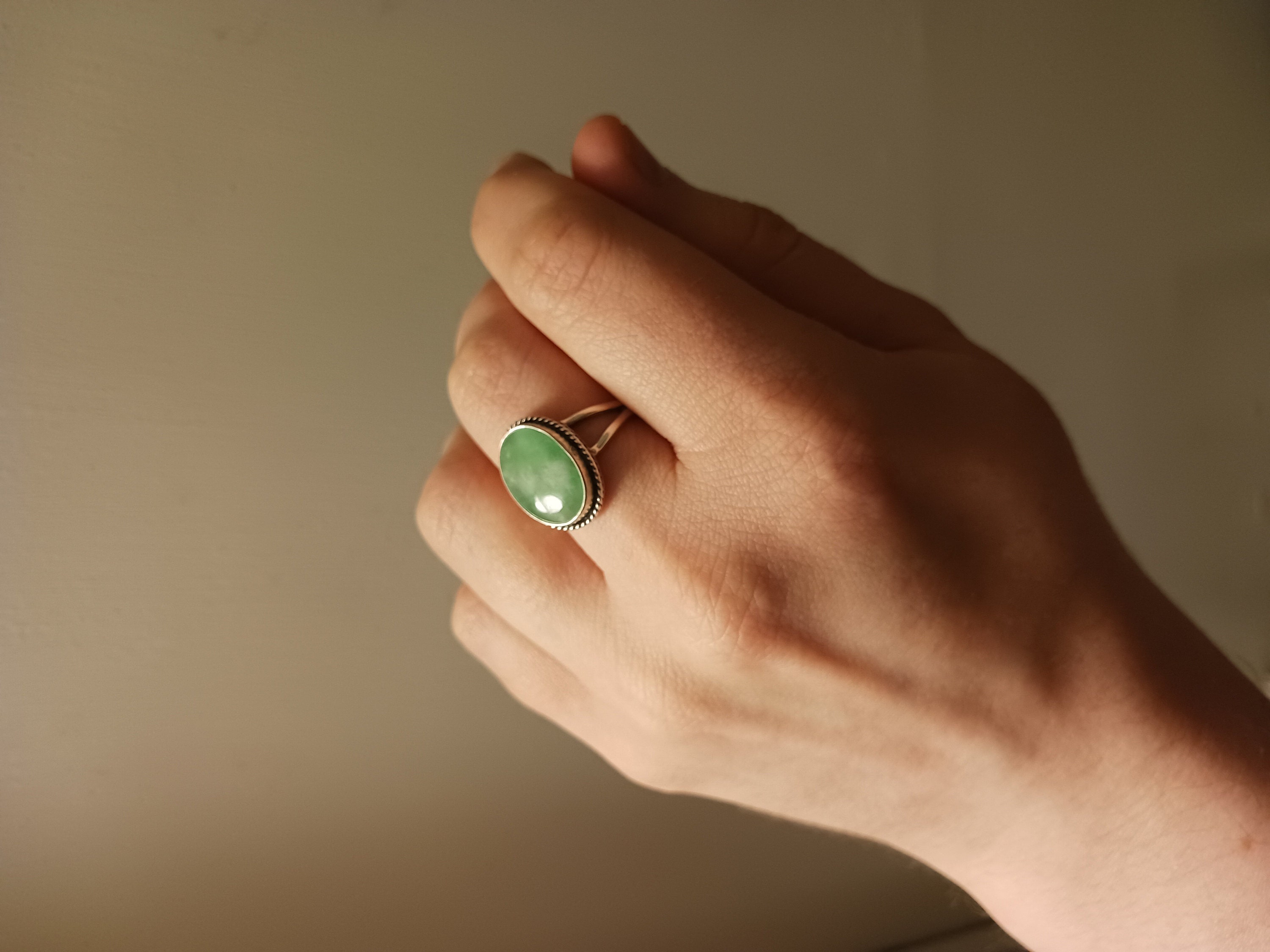 The Boho Ring design looks and feels like it was made by a master silversmith from another time. Here in stunning Burma Jade. The boho, classic design with the .925 Sterling Silver twist wire and double, half-round split shank make it feel like you're sliding on something that someone will still wear in 50 years. You might want to make room on your hand -- you're going to want to wear this Bright green Jade statement ring all the time. All metal is .925 Sterling Silver. All traditional Silversmithing is done in my Baltimore, MD studio.