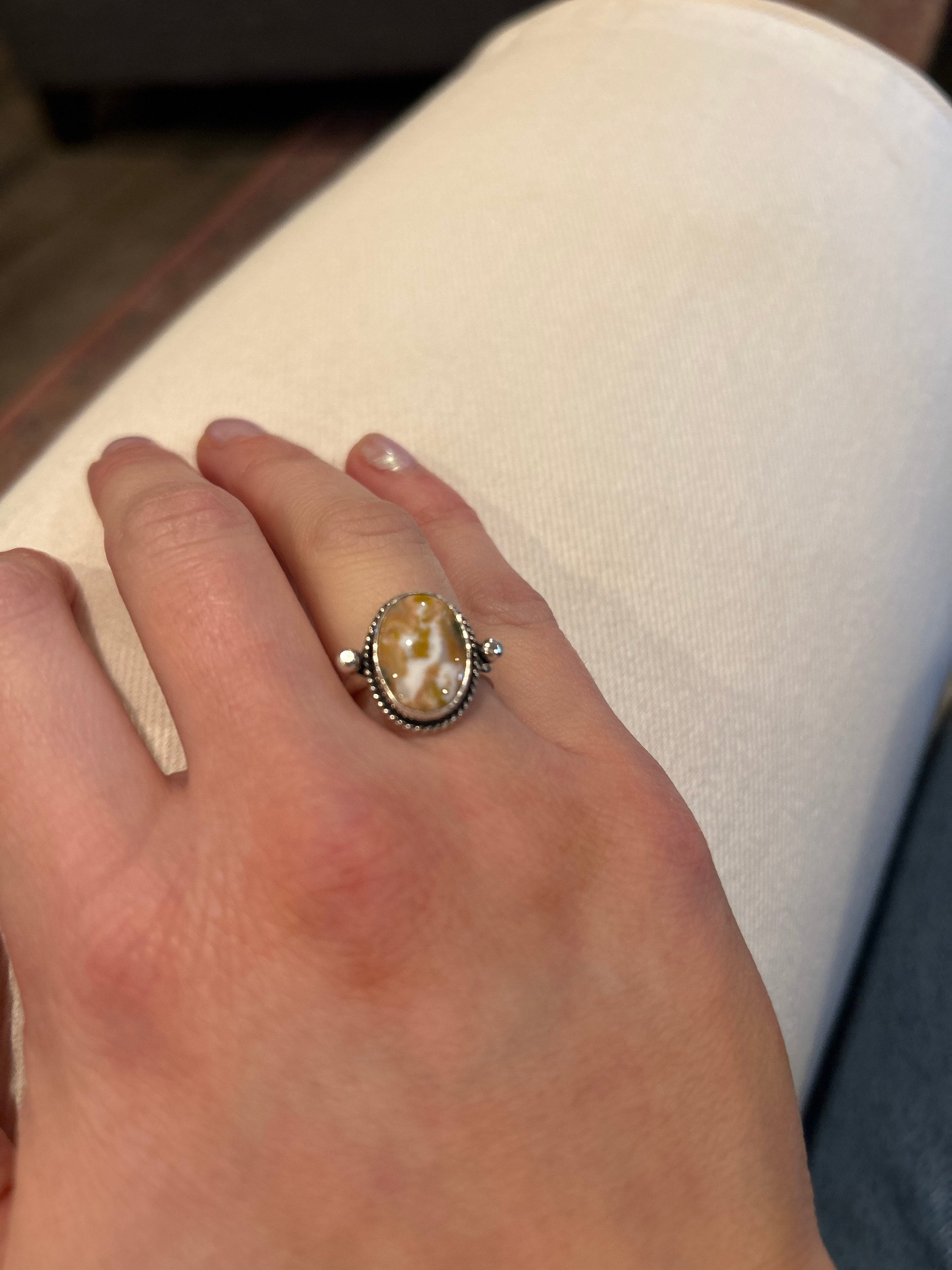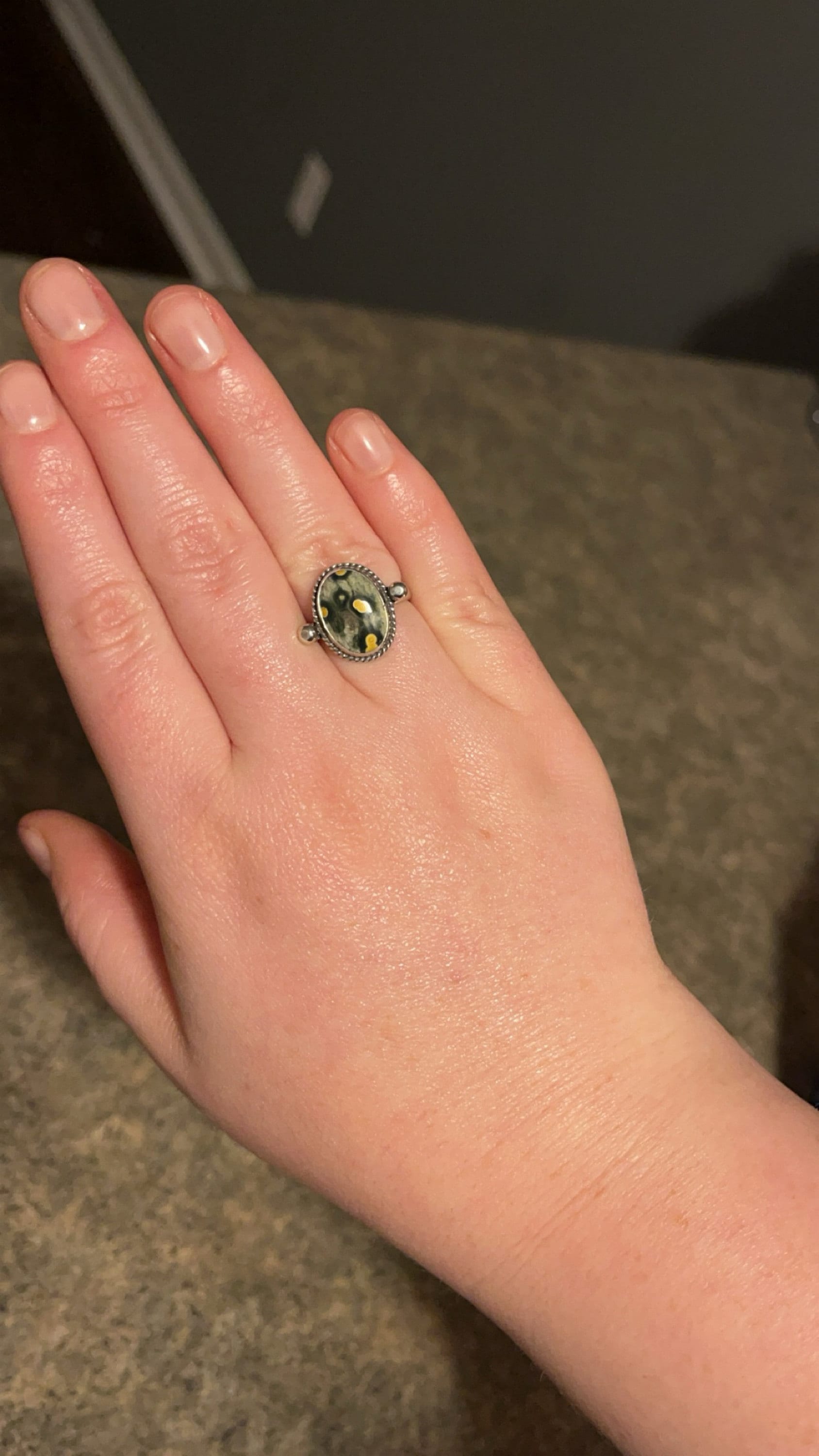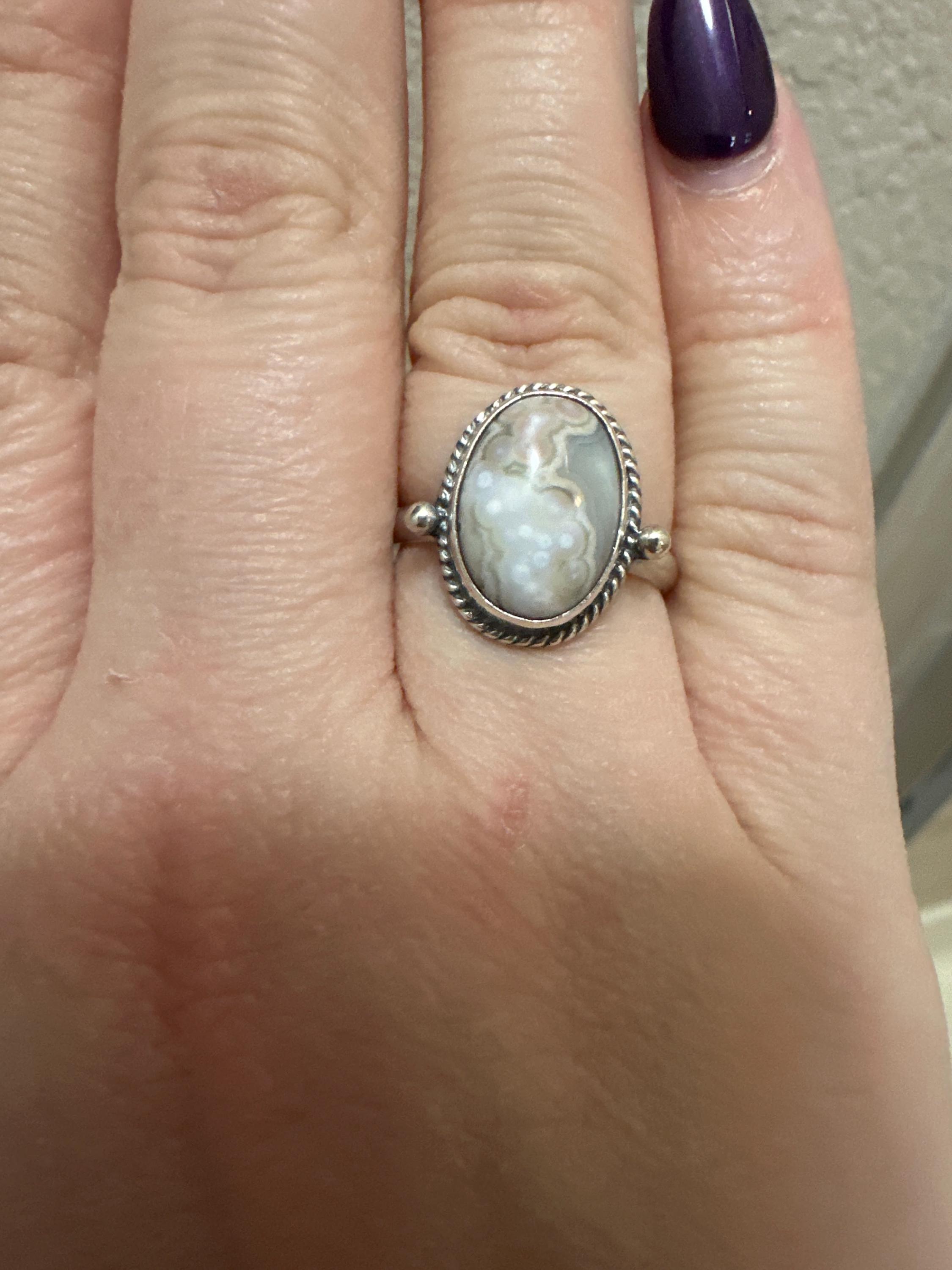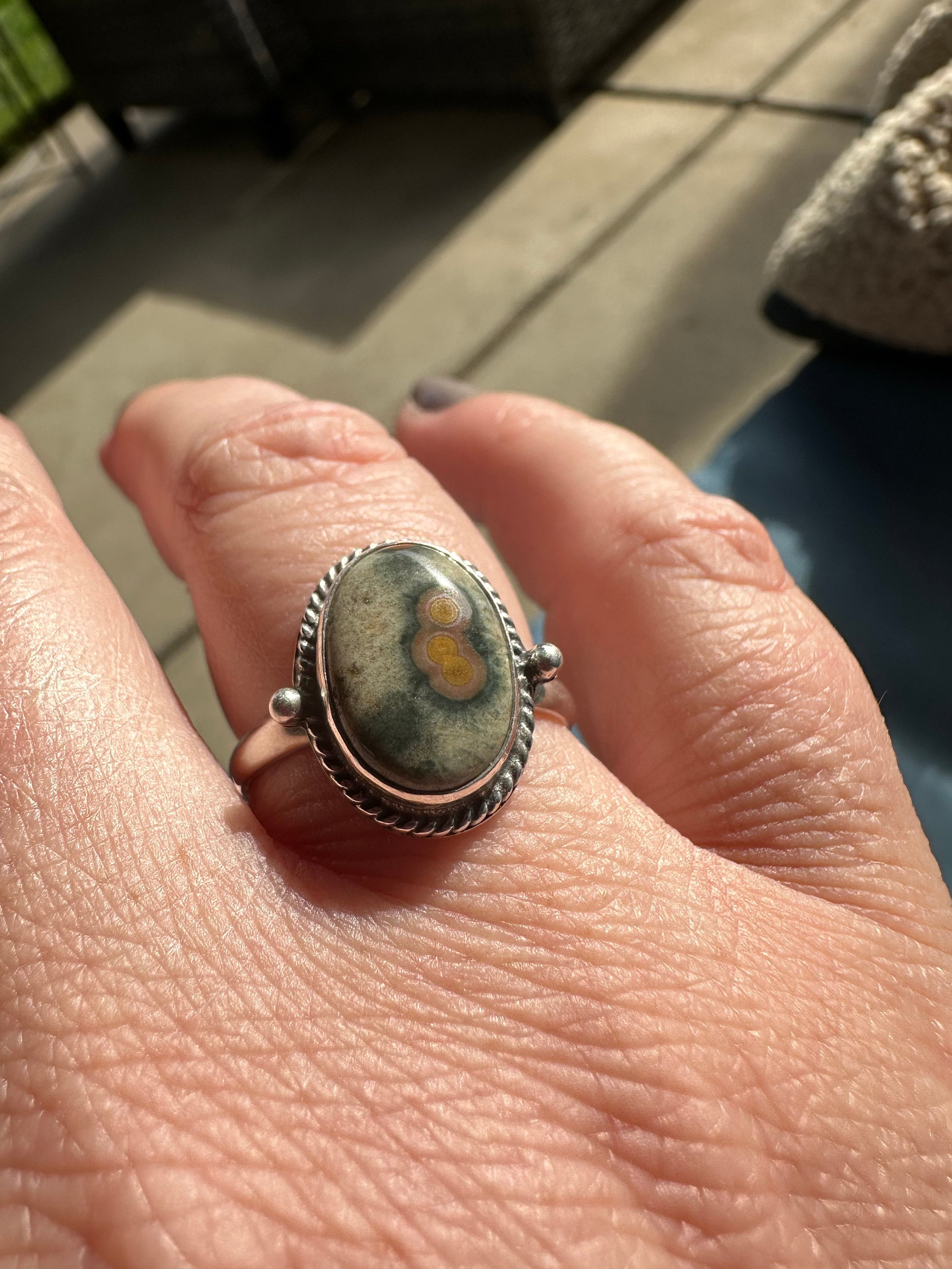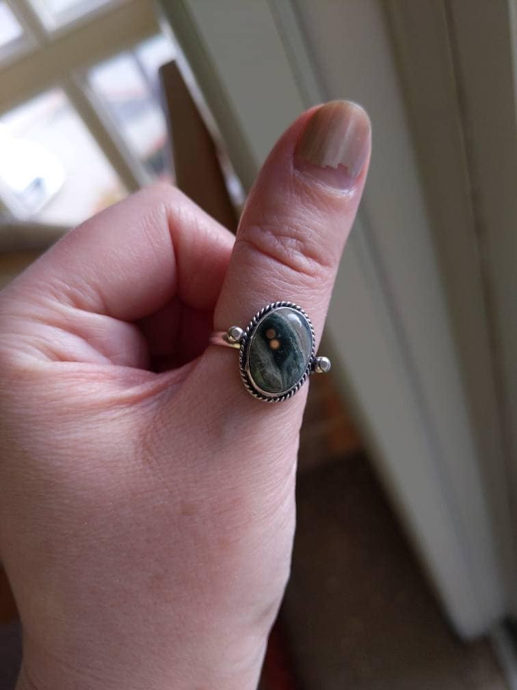 We are very excited about the look and feel of our new Ocean Jasper Lasso Ring! This Boho Ocean Jasper Ring looks and feels great - you won't want to take it off! Perfectly balanced with a healthy sized 10X14mm Ocean Jasper stone, .925 Sterling silver accents and half-round shank - super comfortable and easy to wear. The all sterling silver details of this ring are unique and truly set off the stone! This is a choose your own stone listing - each will be highlighted in the photo as you choose your preference.