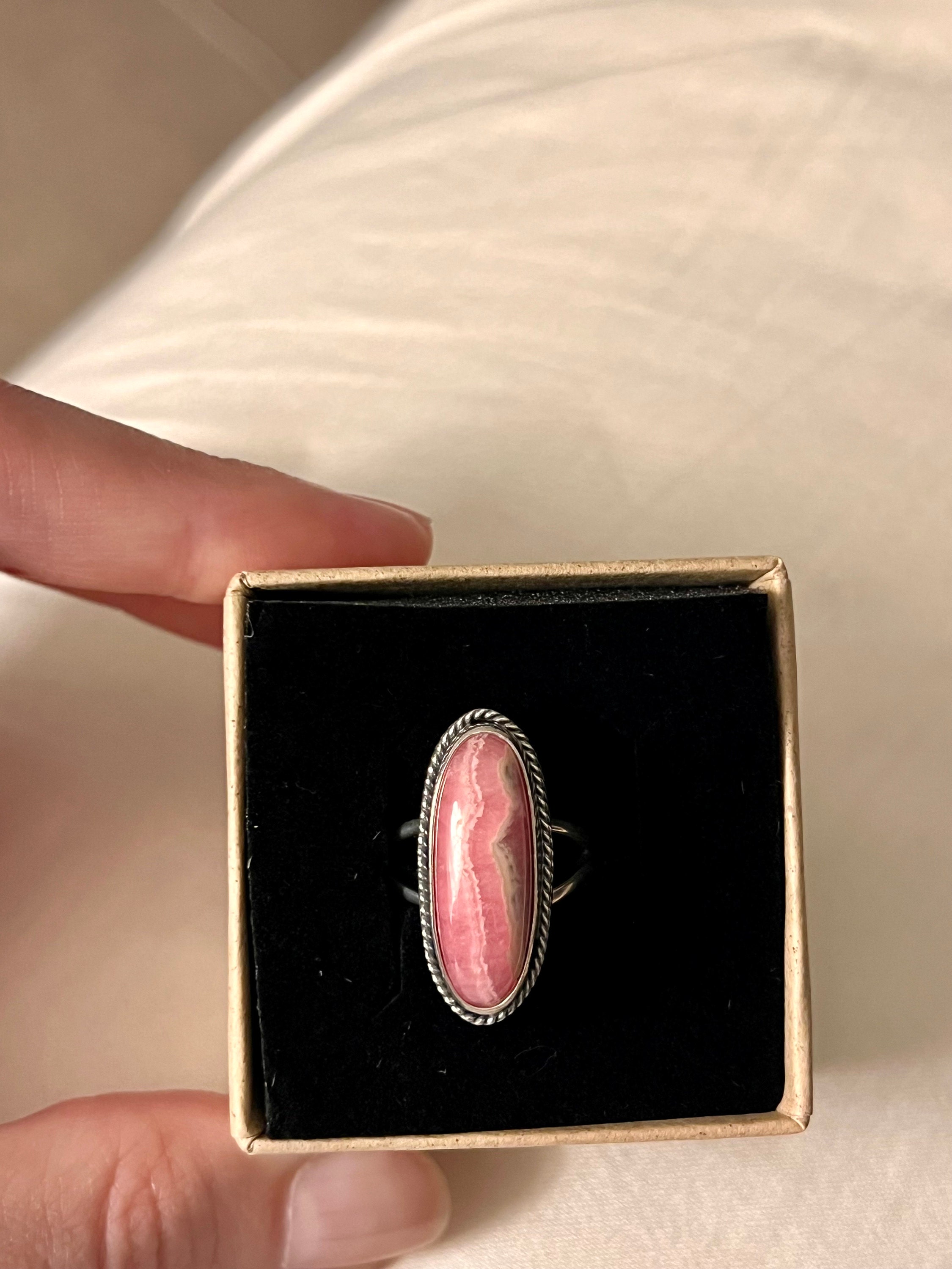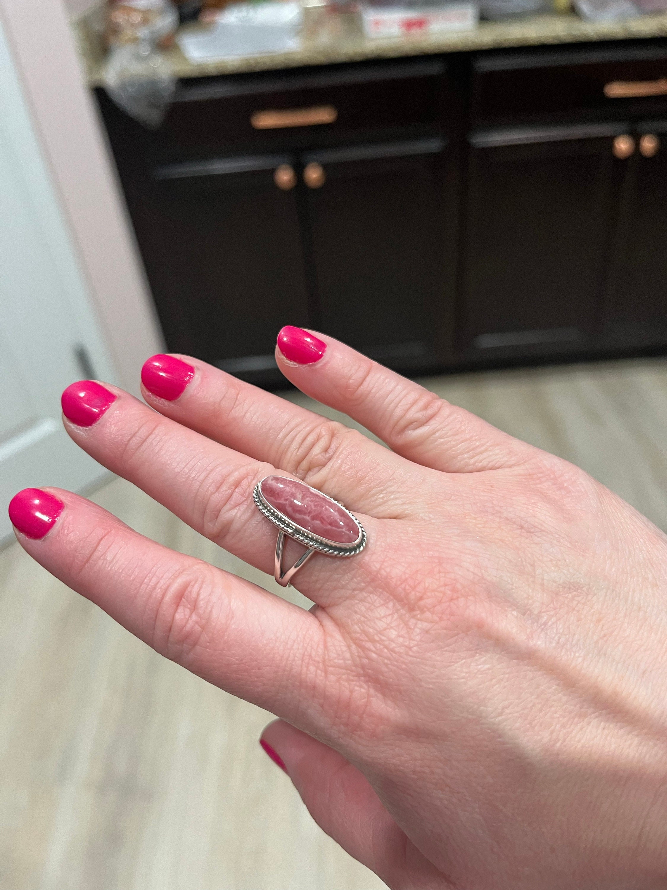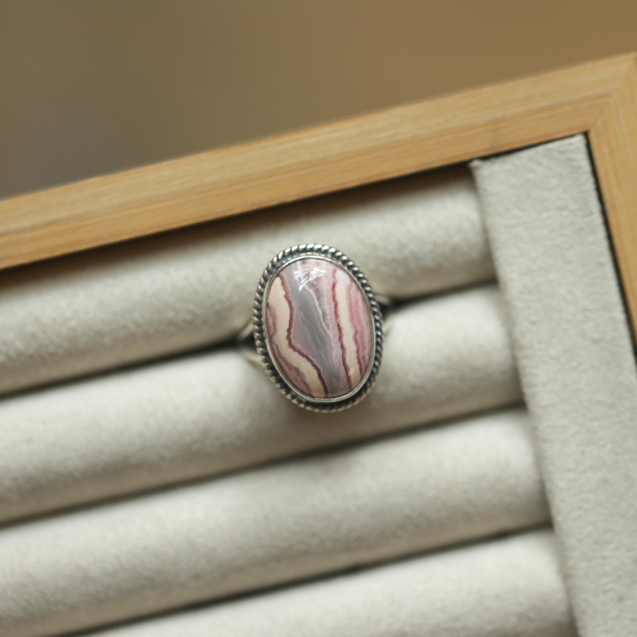The timeless all sterling silver design of our Rhodochrosite Boho Ring could have been made by a master silversmith from another time and place. Simple and classic - with .925 Sterling Silver twist wire and double round split shank. Makes you feel like you're sliding on something that someone will still wear in 50 years. You might want to make room on your hand -- you're going to want to wear this stunning Pink Rhodochrosite statement ring all the time.