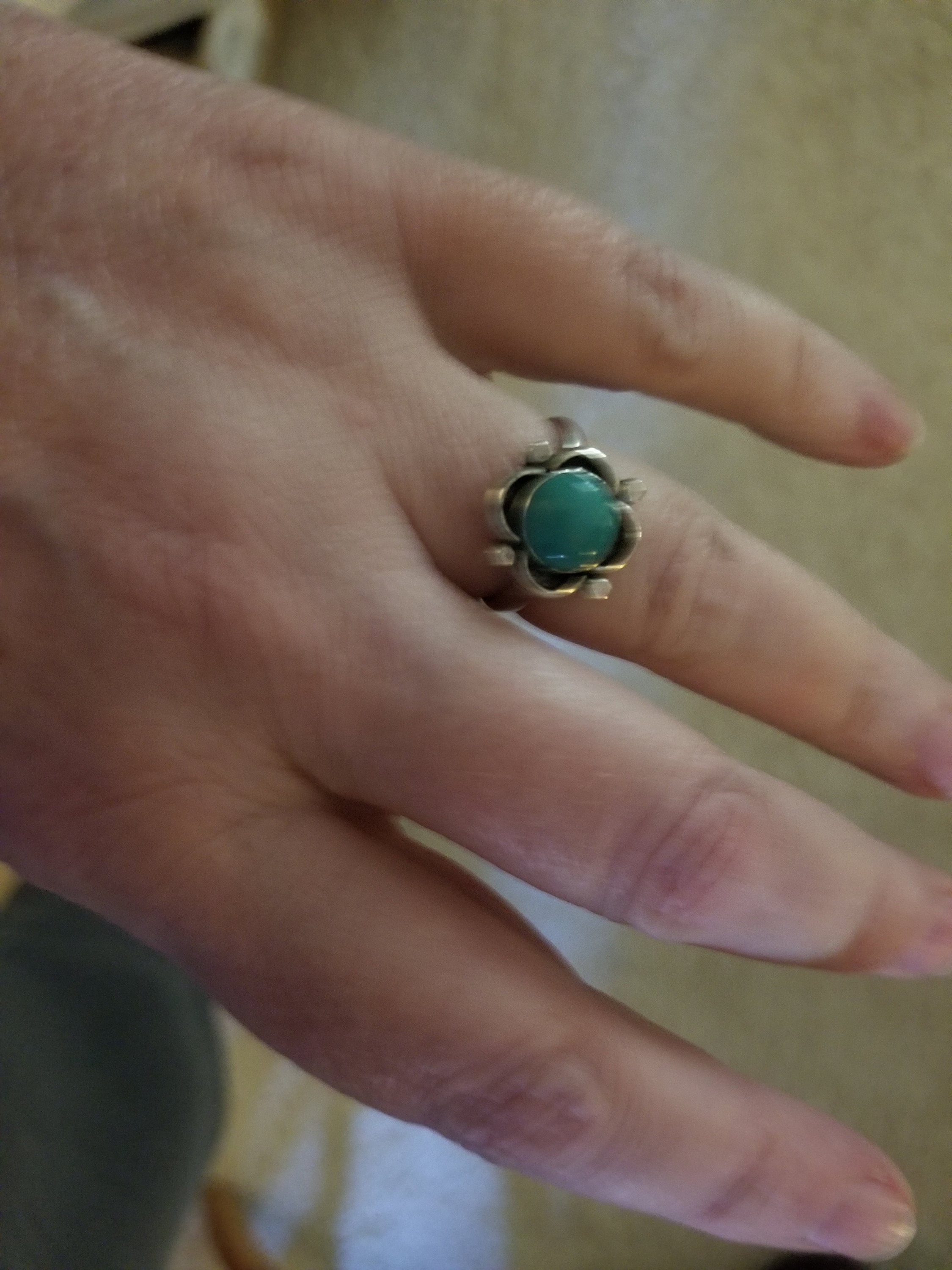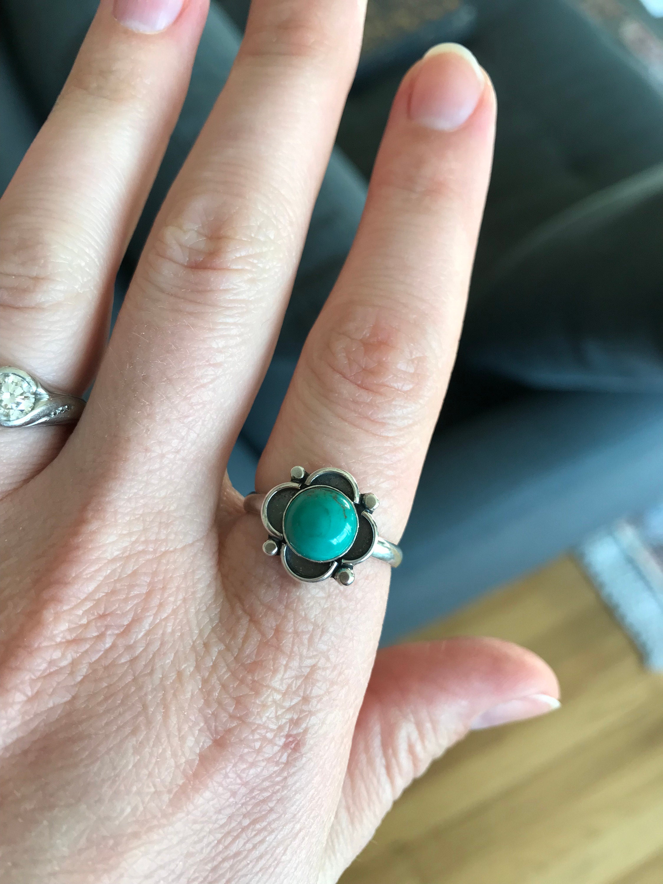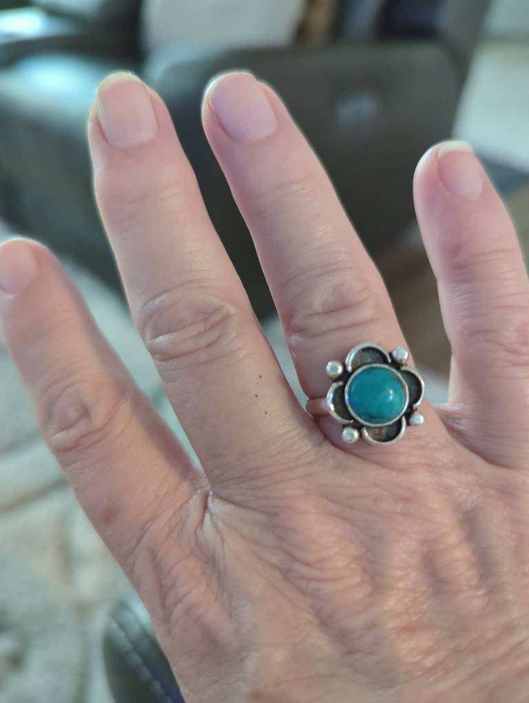 Featuring a superb quality turquoise, the new LBJ Clover Ring has a playful but strong presence. Kind of like a flower -- there's more than a stone of interest in this ring with the unique floral design in .925 sterling silver and the dark oxidization and polishing which creates a truly unique sterling silver ring.