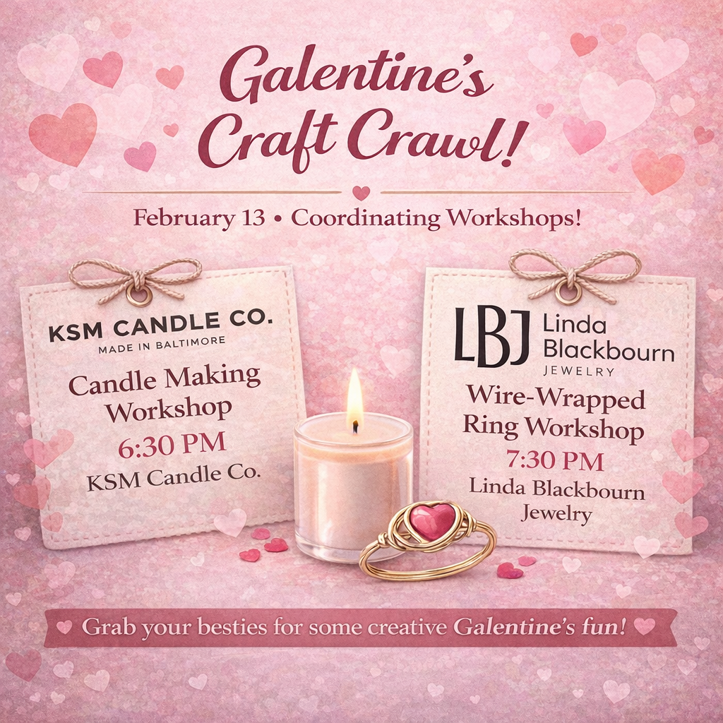 All workshops are in person at KSM Candles and Linda Blackbourn Jewelry, 3600 Clipper Mill Road, Suites 123 & 124. Use La Cuchara restaurant in your GPS, our entrances are on the same patio.