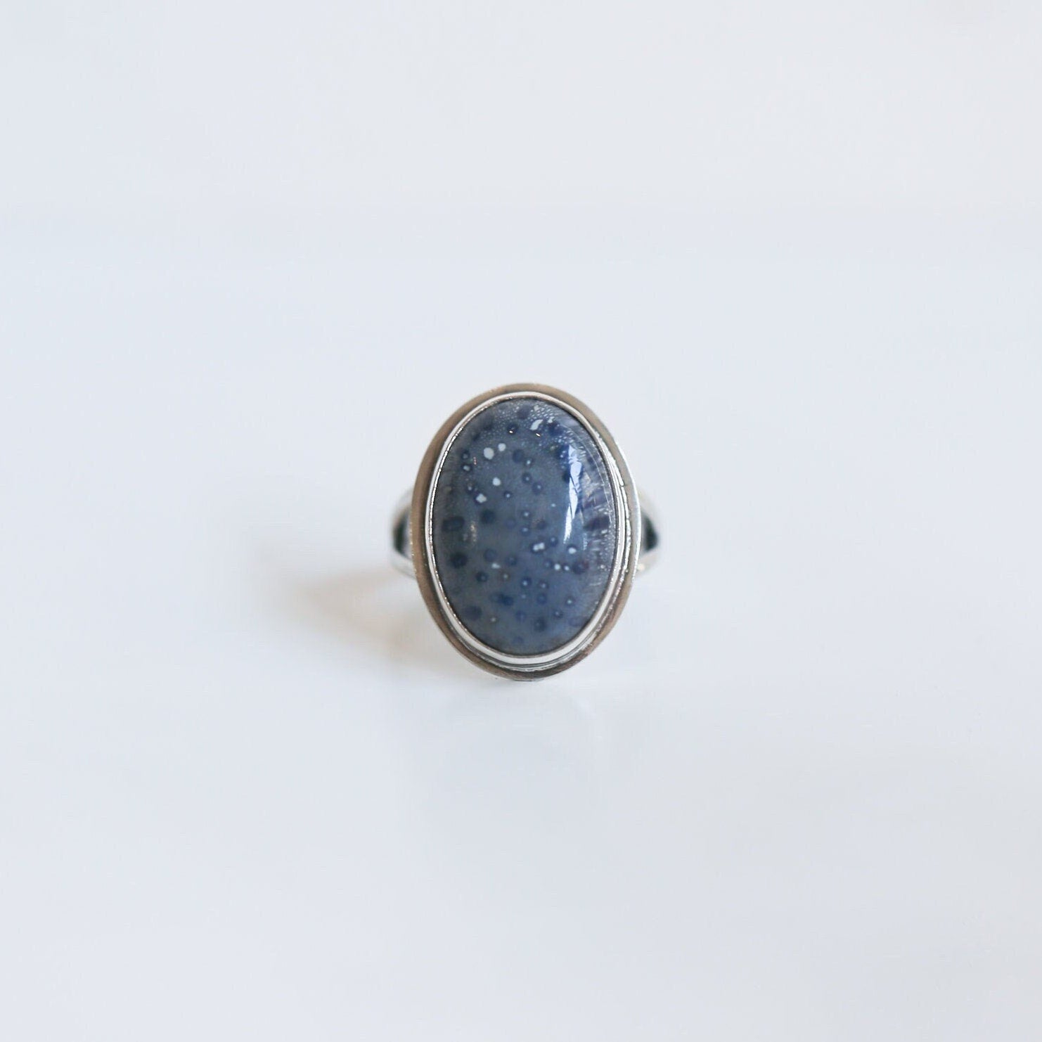 This Blue Sponge Coral Statement Ring will grab a lot of attention, whether you're dressing it with your Saturday evening best or with your favorite jeans. Blue Sponge Coral is the unusual yet perfect color - cornflower blue - and the unique and unmistakable texture of Blue Sponge Coral is a conversation starter. We've kept the setting of this Blue Sponge Coral Ring simple, with a focus on comfort in our favorite .925, Sterling Silver Split Shank. Add it to your collection for that pop of blue you've wanted. Choose your size in the drop-down below. All traditional silversmithing work is done in my Baltimore, MD studio.