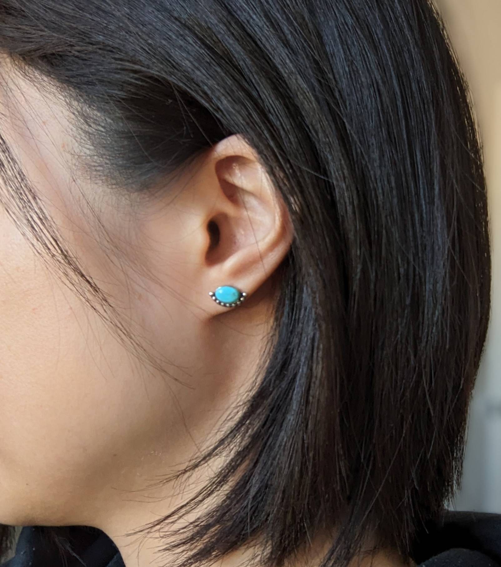 Super high-quality, bright blue, American Turquoise is featured in these LBJ, all .925 Sterling Silver and Turquoise Bright Eyes Posts. These sweet yet spirited turquoise stud earrings are sure to be a favorite in your easy-to-wear category. .925 Sterling Silver. All traditional silversmithing is done in my Baltimore MD studio and showroom.