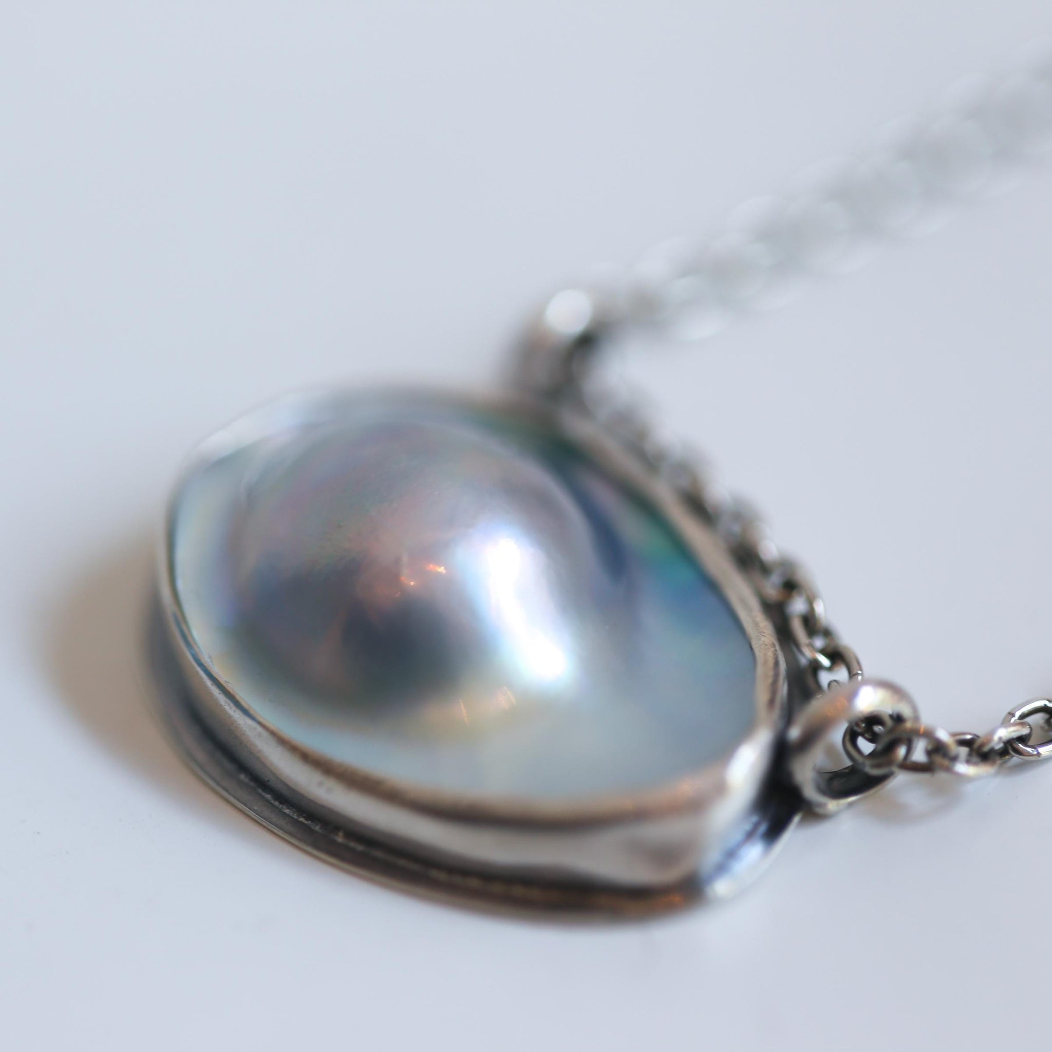 The Blister Pearl Deep Sea Necklace -- Stunning and rare, high luster, grey mabe pearl with blister. If you love pearls this pearl exudes the essential nature of pearliness, while having the flexibility of a pendant that will center itself on an adjustable chain ... we call this the Hanging Rock pendant or necklace. A true minimal design that allows the Blister Pearl to be the one and only! Large (approx 20X26mm), absolutely gorgeous and luscious freshwater, mabe pearl.
