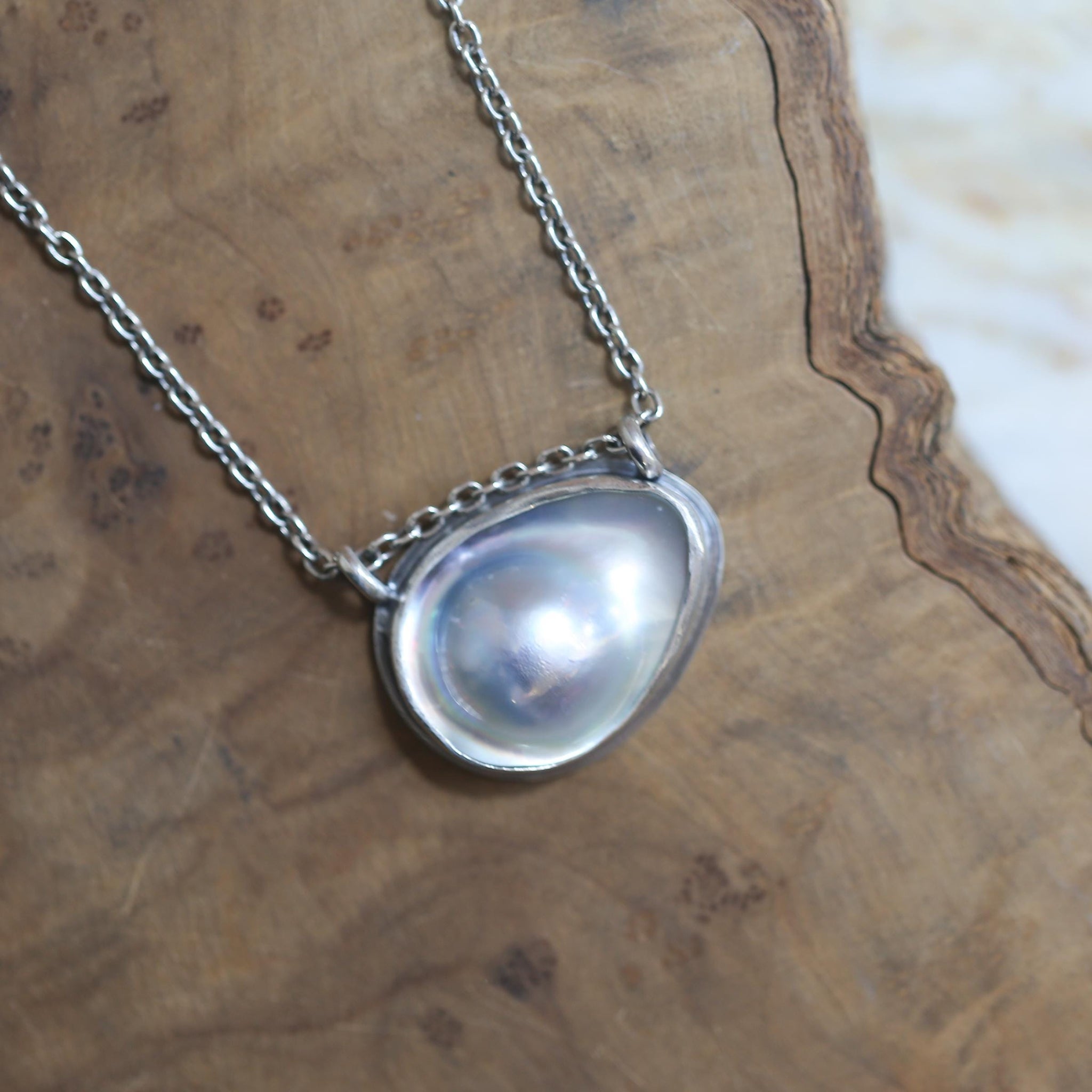 The Blister Pearl Deep Sea Necklace -- Stunning and rare, high luster, grey mabe pearl with blister. If you love pearls this pearl exudes the essential nature of pearliness, while having the flexibility of a pendant that will center itself on an adjustable chain ... we call this the Hanging Rock pendant or necklace. A true minimal design that allows the Blister Pearl to be the one and only! Large (approx 20X26mm), absolutely gorgeous and luscious freshwater, mabe pearl.