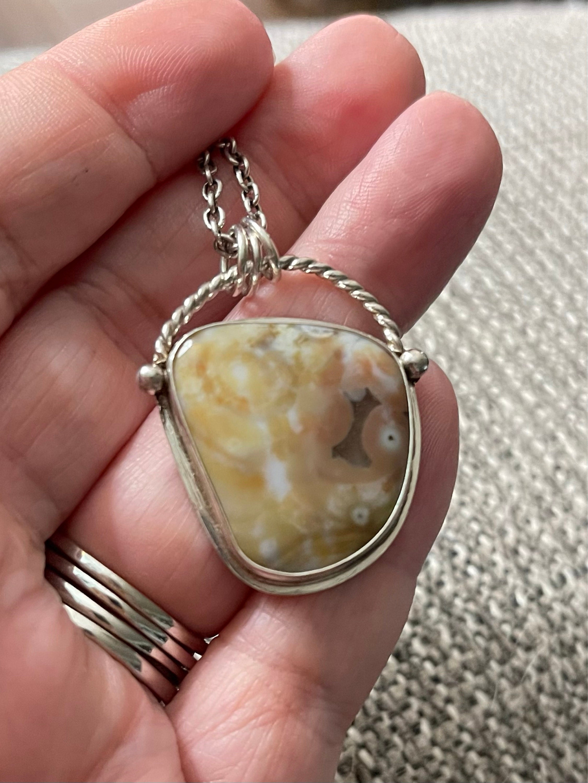 This listing is NOT for the Ocean Jasper Pendant(s) in the photos. The pendants in the photos illustrate how we will finish your custom Ocean Jasper Pendant - using the stone you choose. Choose your stone from the individual stones pictured in the drop-down - and we will create your custom pendant in the same style as the Ocean Jasper pendants in the photos.