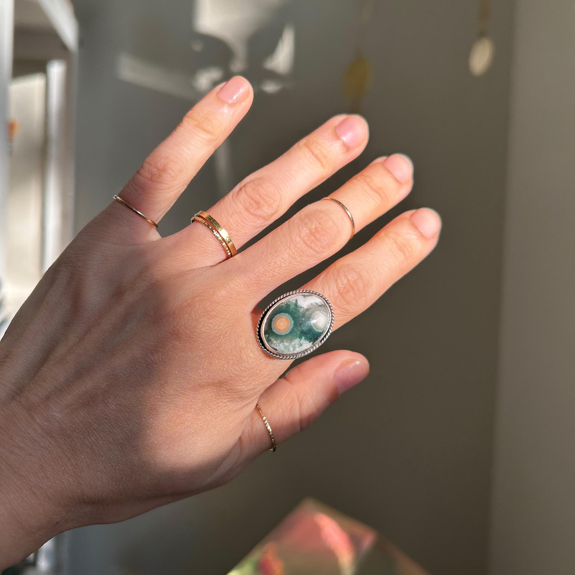 What a great, Ocean Jasper statement ring. It looks and feels like it could have been made by a master silversmith from another time and place. The stones are magnificent, ocean jasper AAA grade - featuring uniquely stunning orbs. The simple, classic ring design with .925 Sterling Silver twist wire and double round split shank is our perfect boho ring. You feel like you're sliding on something that someone will still wear in 50 years. You might want to make room on your hand -- you're going to want to wear this big, AAA Ocean Jasper statement ring all the time.
