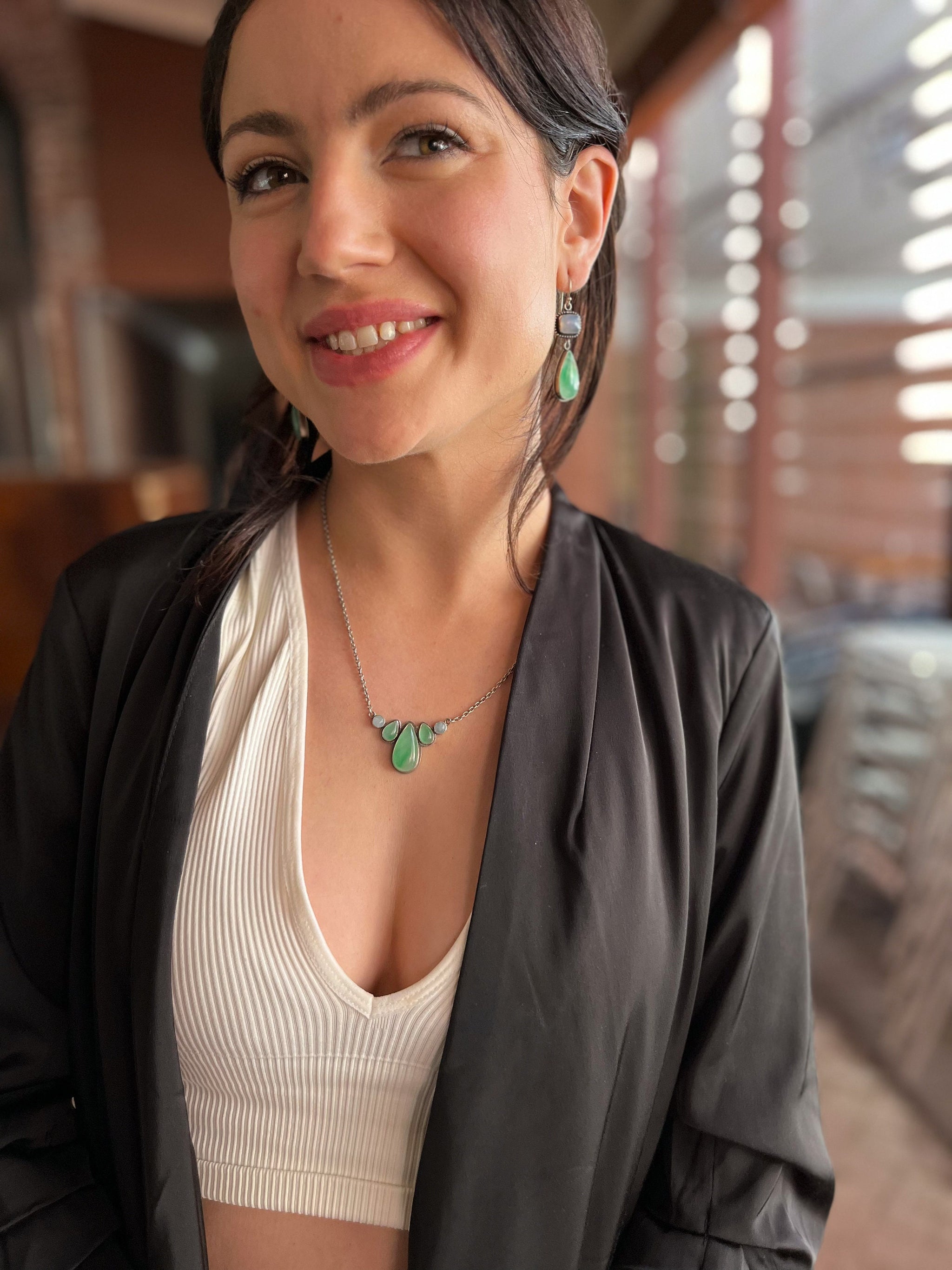 You will feel like royalty, or maybe a movie star when you wear these ultra-elegant, glamorous drop earrings. Stunning Green Jade Drop Earrings. The soft, natural green jade is mesmerizing, and the ethereal blue chalcedony is just the perfect mate to add length, color, and presence. We love to be able to wear soft colors in our jewelry while still having the richness and benefits of natural stones. These soft green jade and blue chalcedony earrings will pass down! All .925 Sterling Silver. These arrive with rubber stoppers against loss. These lovely earrings are created using traditional silversmithing techniques in our MD studio.