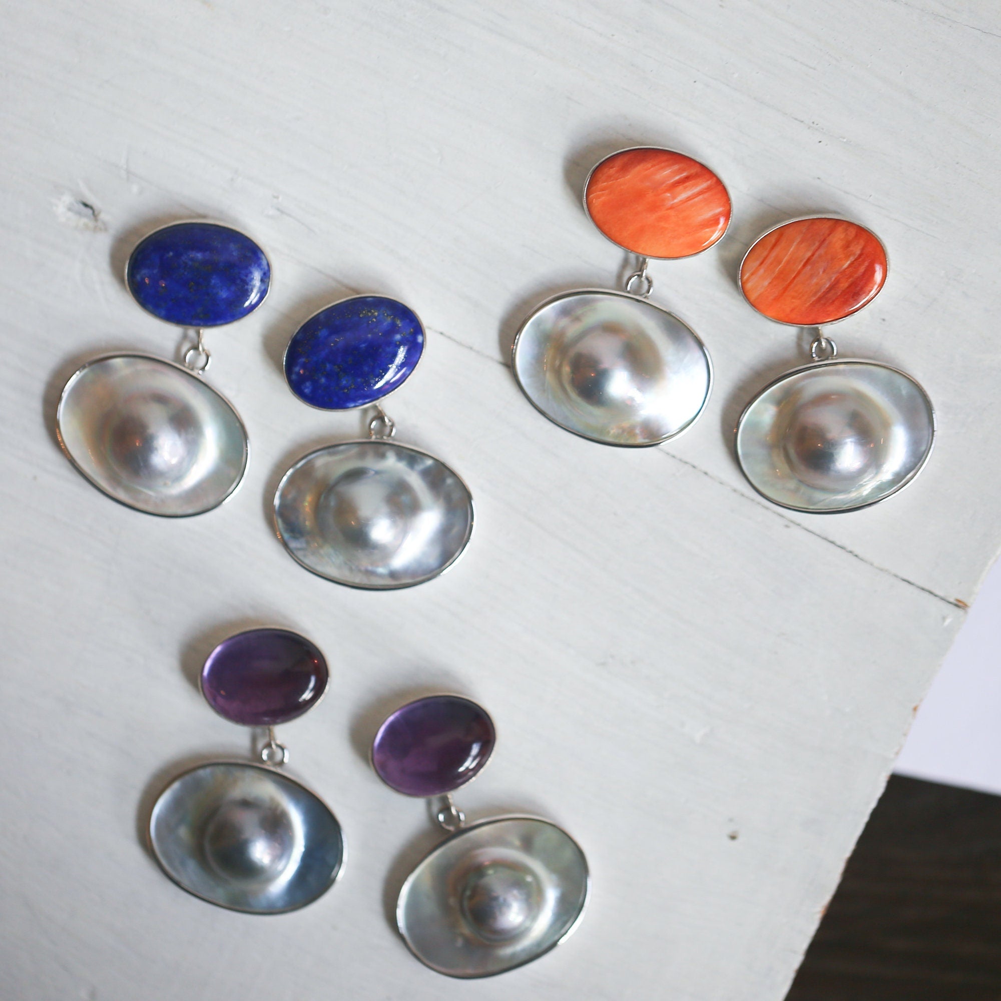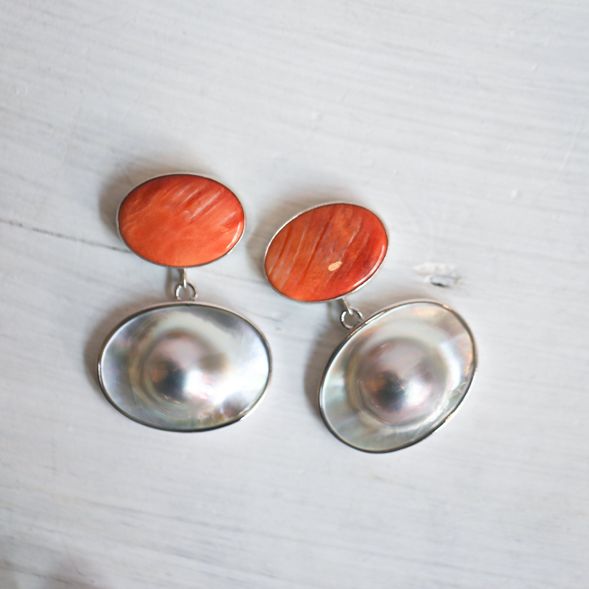 We wanted super elegance with ease in these beautiful, coral red orange Spiny Oyster Shell and Mabe Pearl earrings. Big, East West Oval, Spiny Oyster Post Earring Tops with natural freshwater Mabe Pearl East West drops that swing when you dance! Orangy Red Shell and blister pearl Earrings in sterling silver. These swingy and fun Coral Red earrings feature Gorgeous, natural Spiny Oyster and natural, silvery grey freshwater blister Pearls. All handmade in my Baltimore studio